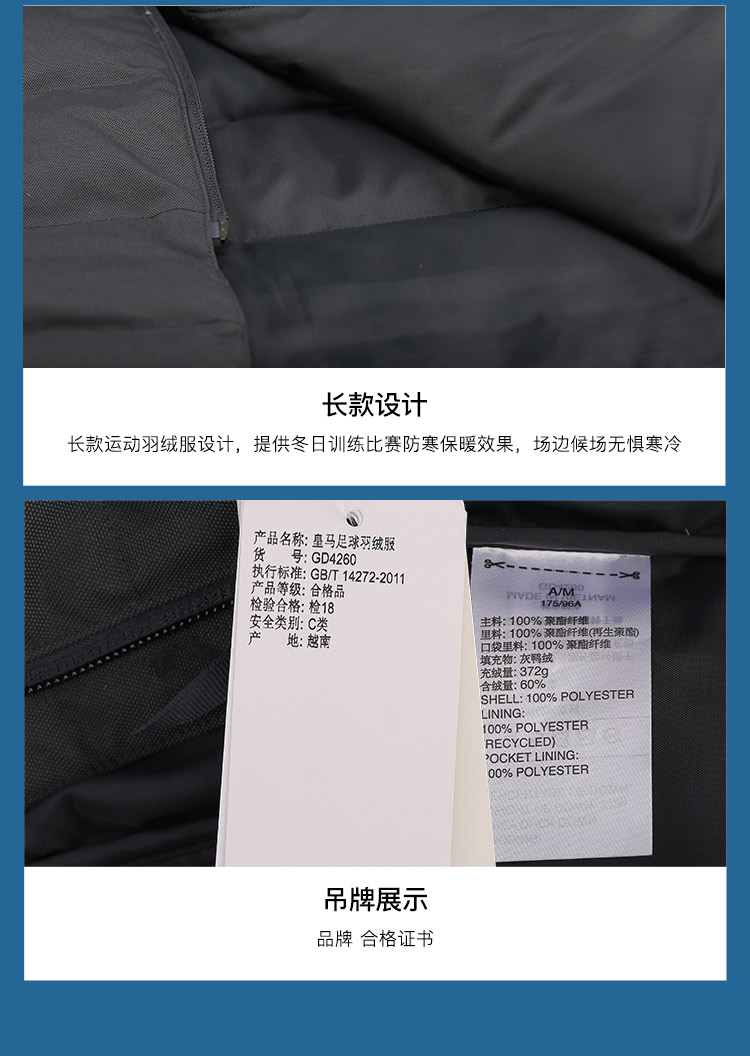 小李子正品ADIDAS阿迪达斯2020新款皇马中长款保暖羽绒服男GD4260