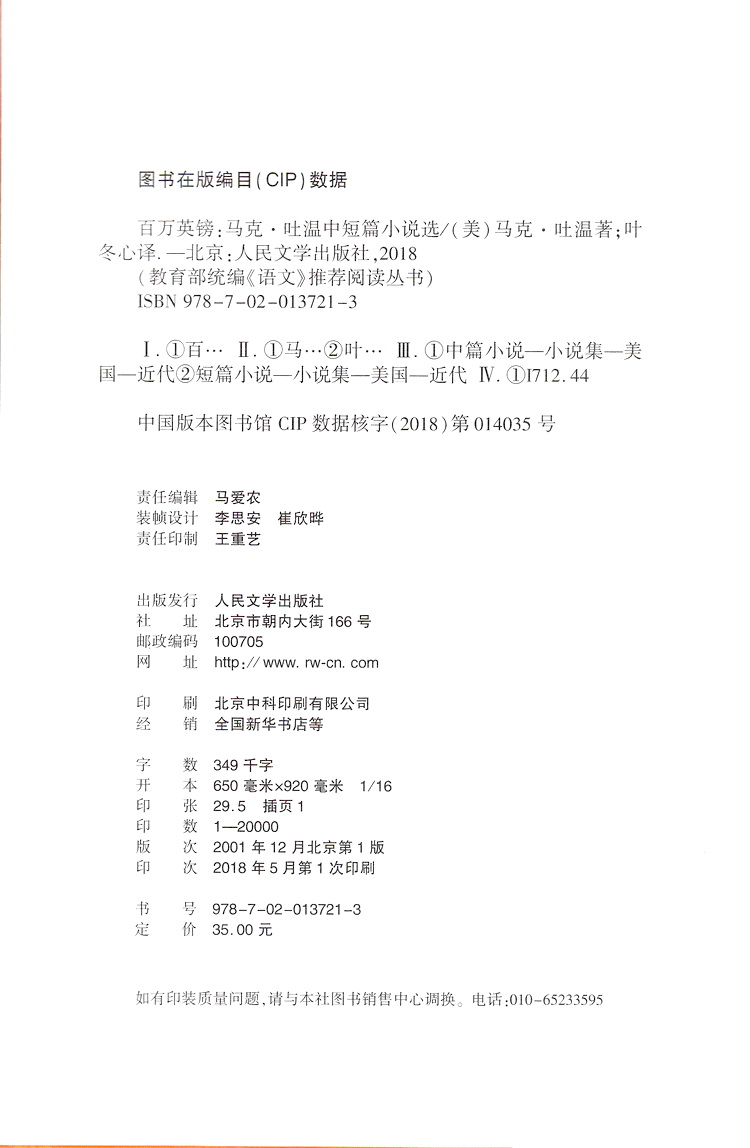百万英镑 马克吐温中短篇小说选 人民文学出版社部编版统编语文阅读 中学生语文自主阅读名著书目课本教材学校经典口碑版