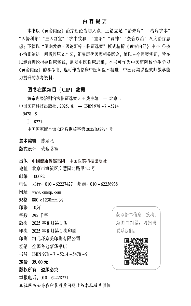 黄帝内经 治则治法临证选案 王兵 主编 汇集历代医家相关医论 辅以古今医案实证 旨在以经典理论指导临床实践 中国医药科技出版社
