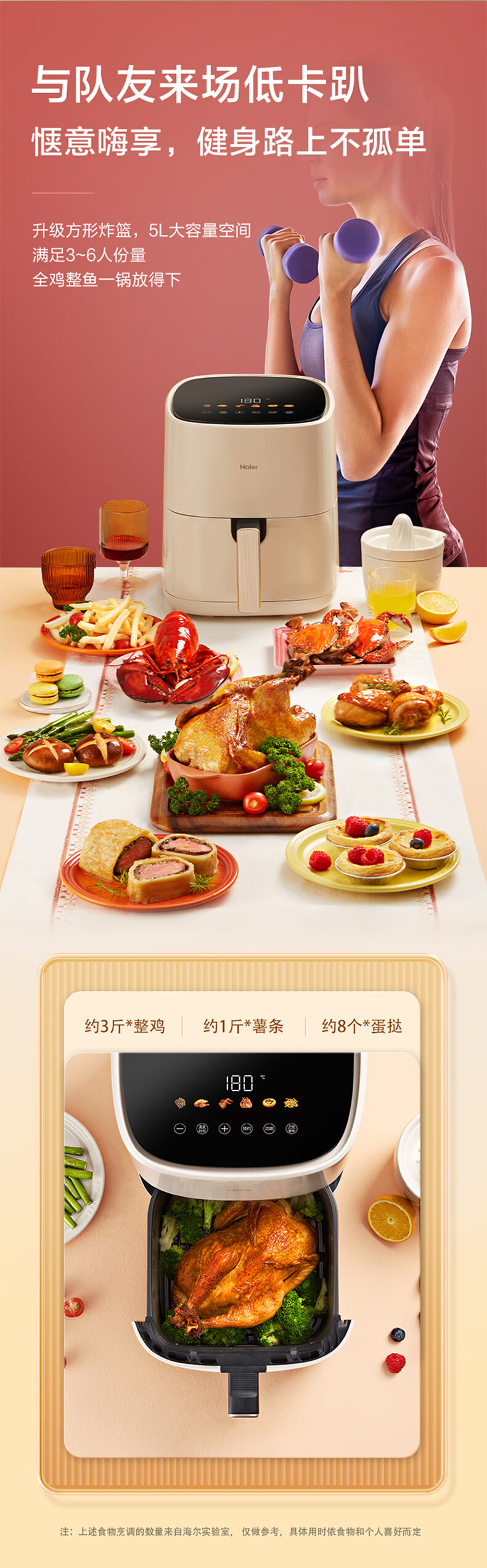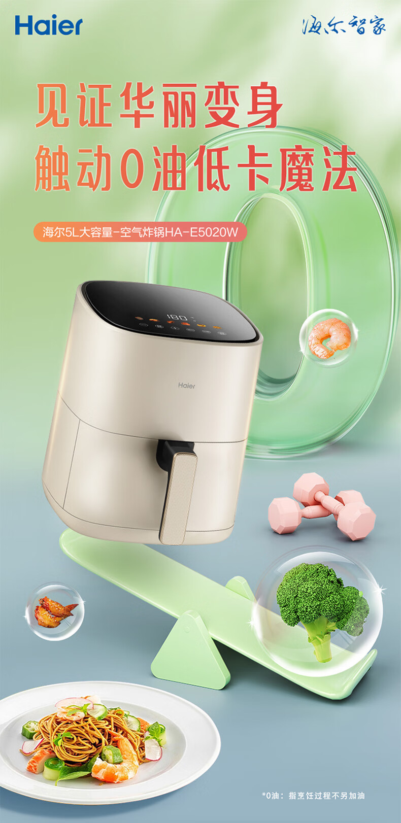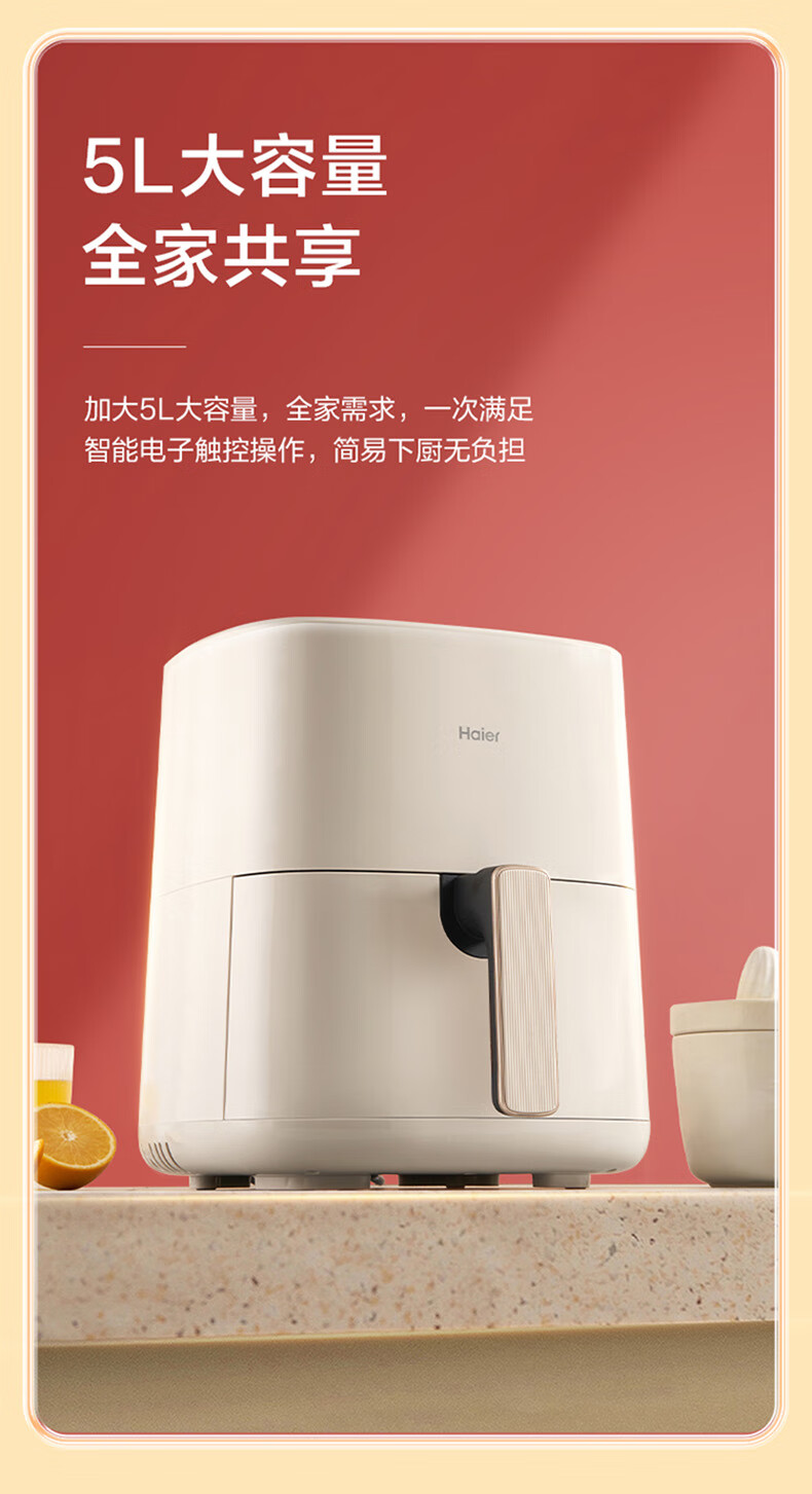 海尔(Haier)空气炸锅 5L家用 大容量免翻面不粘易清洁 低脂电炸锅炸烤箱一体机薯条机 HA-E5020W
