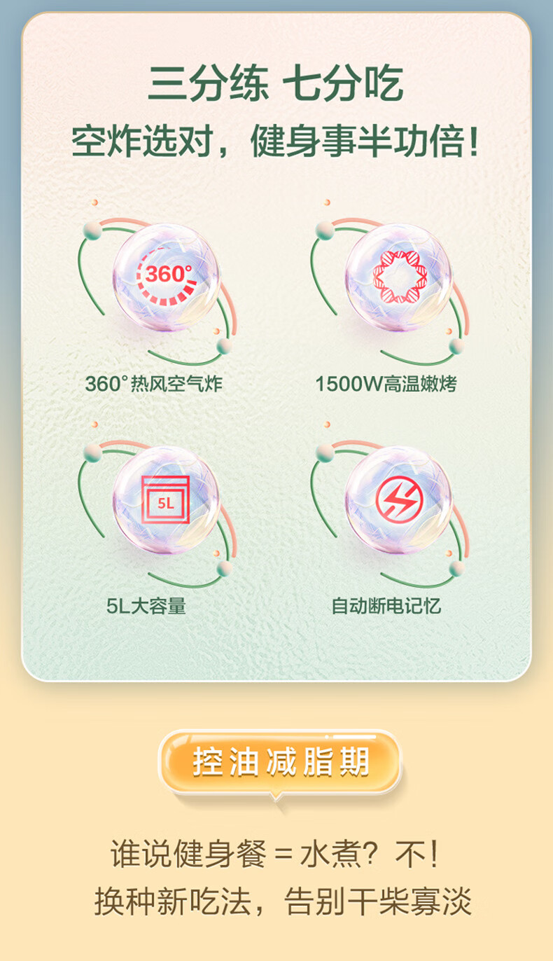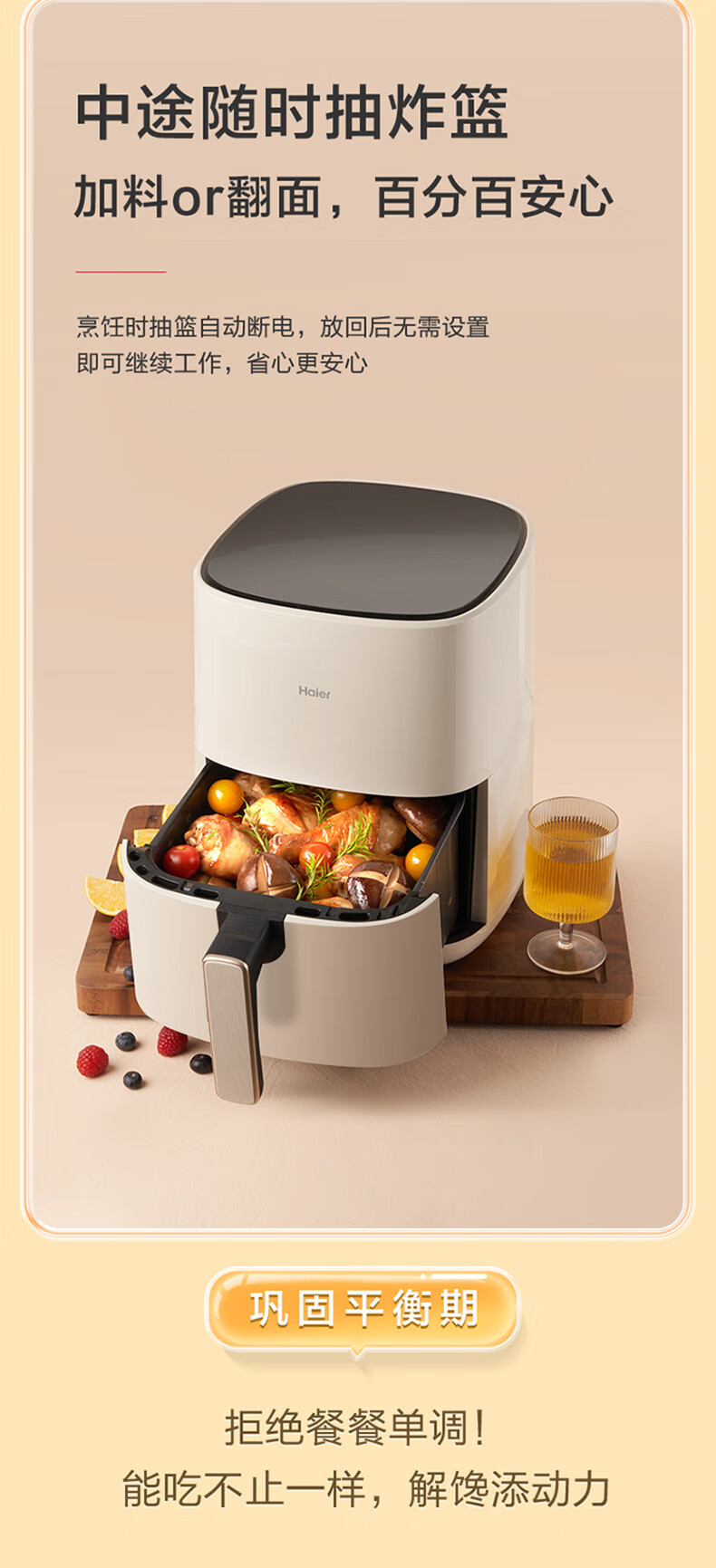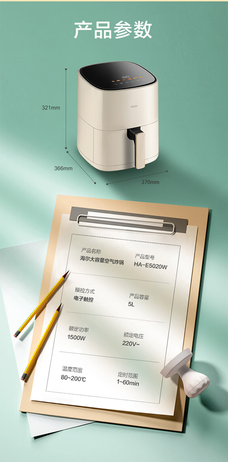 海尔(Haier)空气炸锅 5L家用 大容量免翻面不粘易清洁 低脂电炸锅炸烤箱一体机薯条机 HA-E5020W
