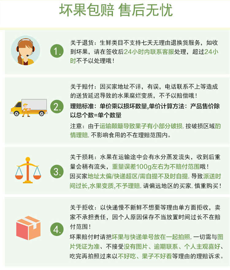 售后:坏果+面单拍照,按个数赔付,无理要求和轻微碰伤不影响食用情况下不予赔付
