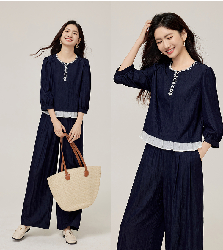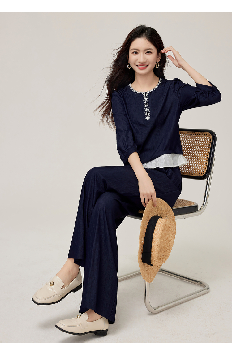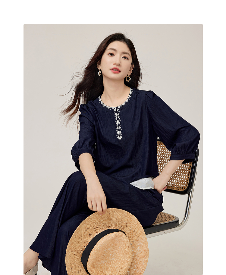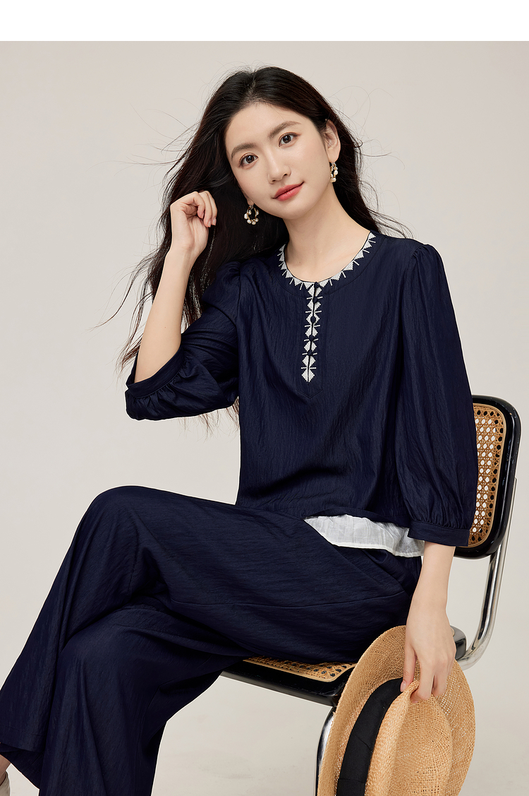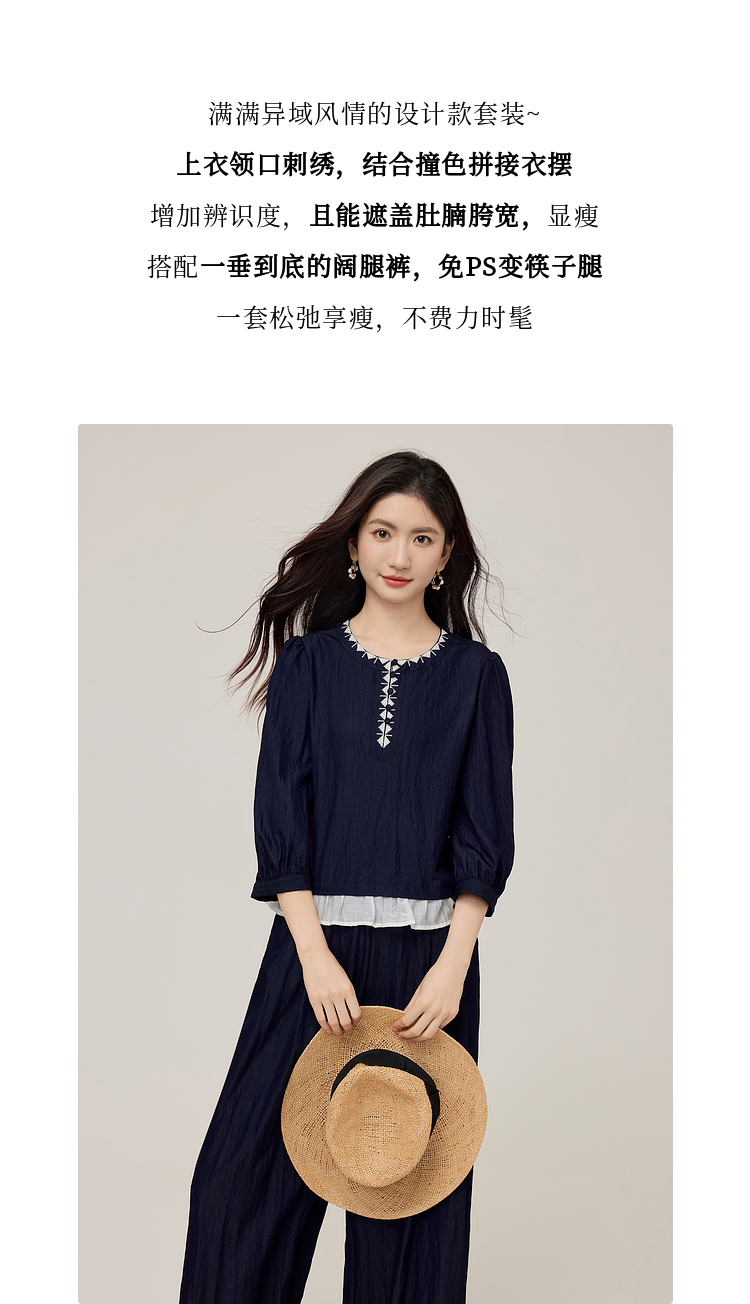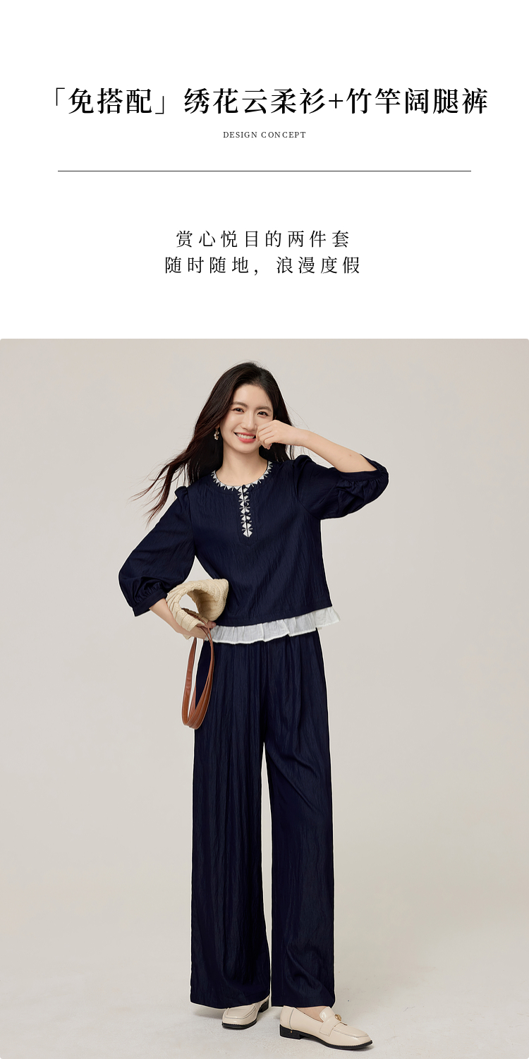 【08/12新品】熙世界休闲松弛感套装女2025初秋新款七分袖刺绣上衣阔腿裤两件套