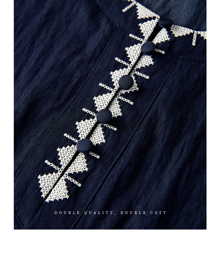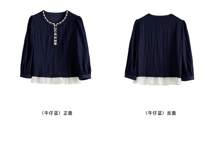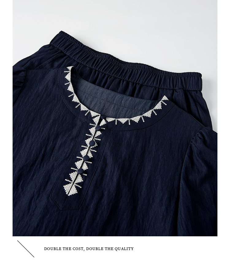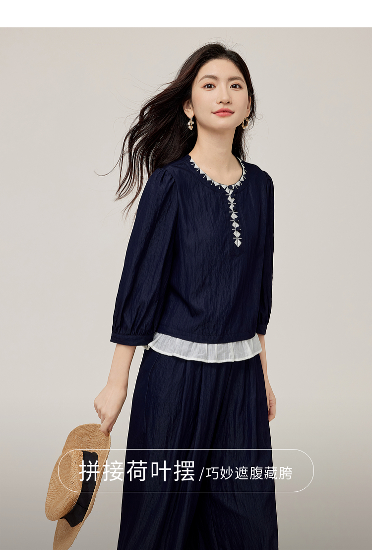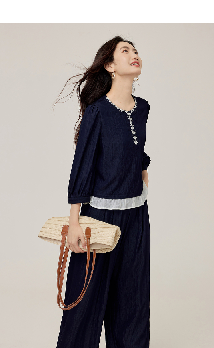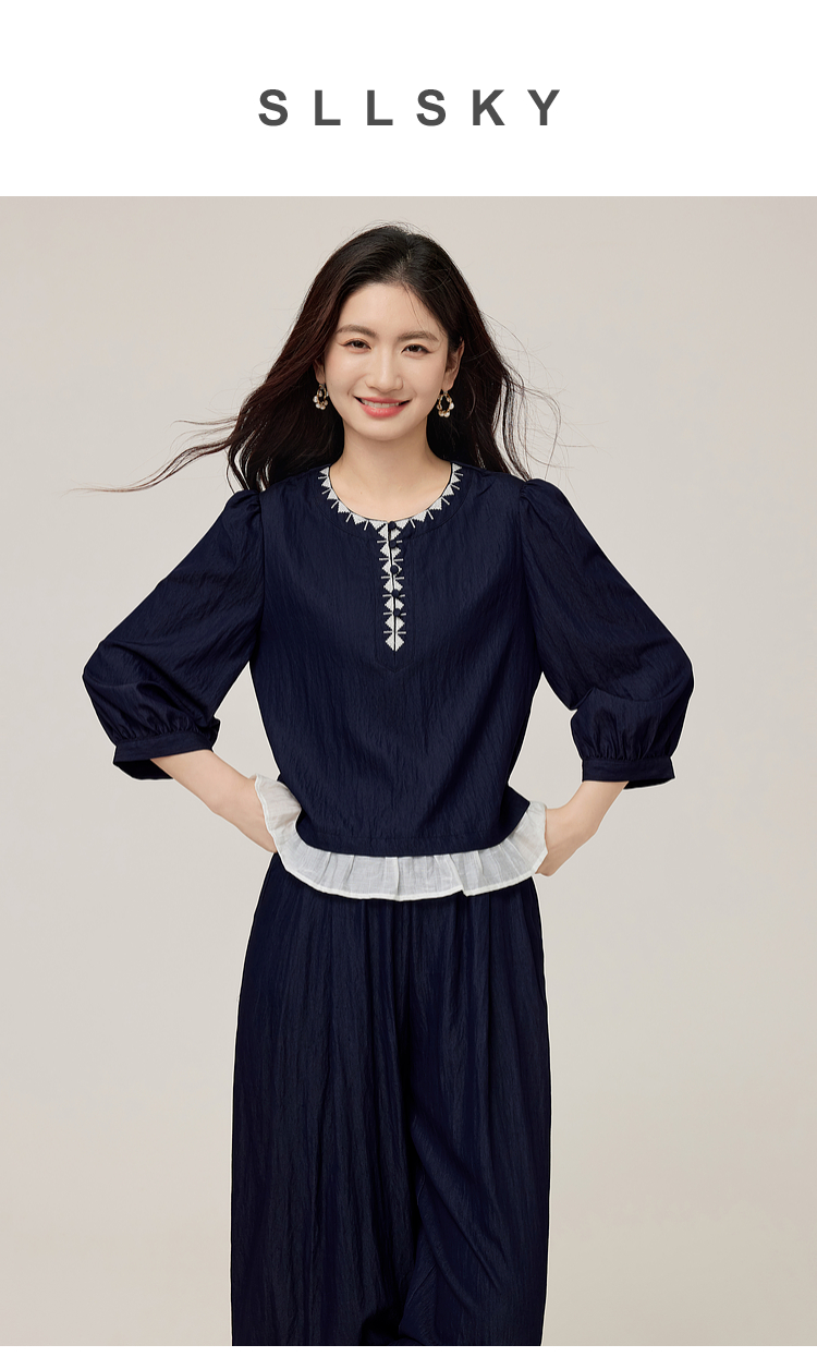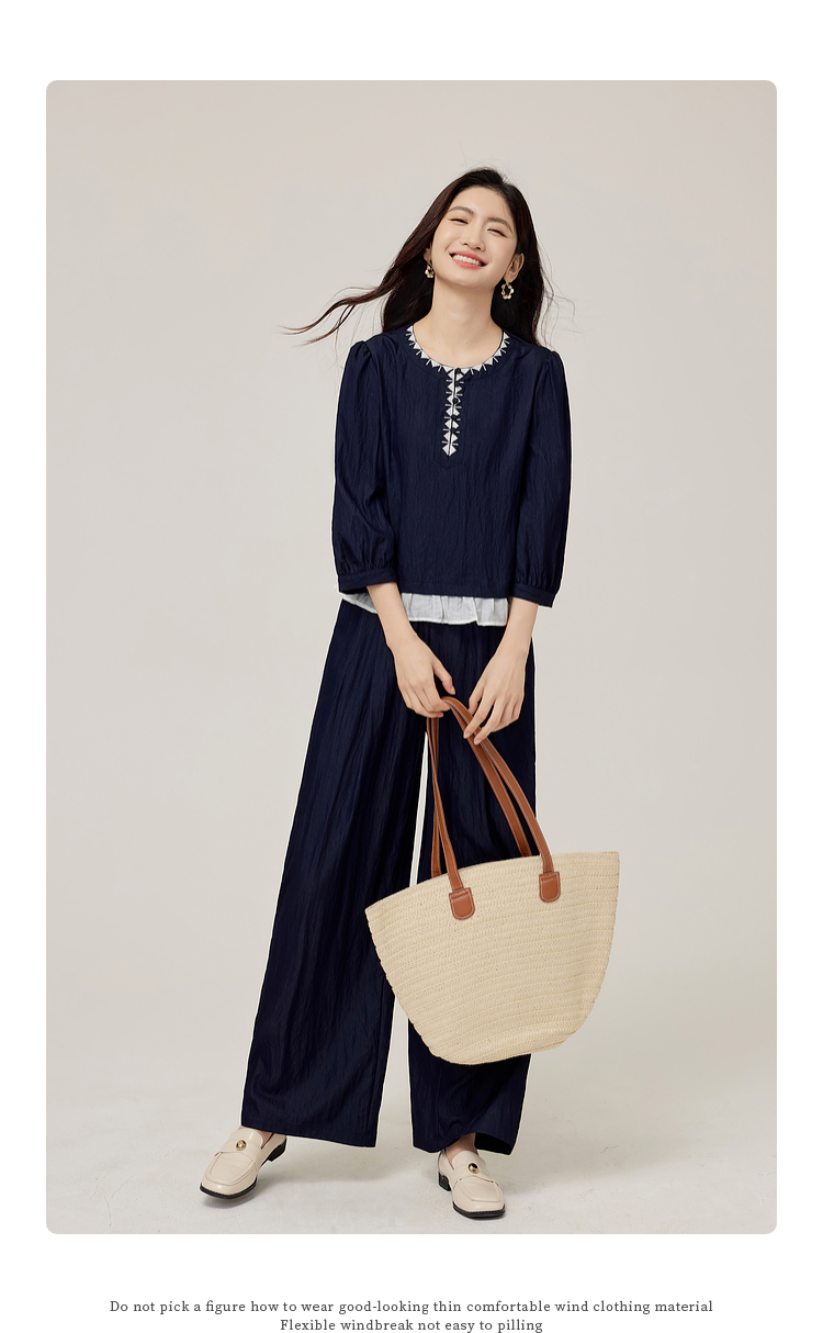 【08/12新品】熙世界休闲松弛感套装女2025初秋新款七分袖刺绣上衣阔腿裤两件套