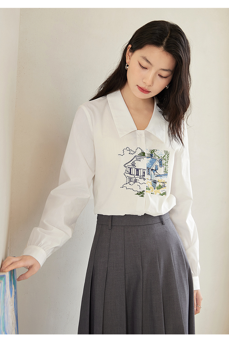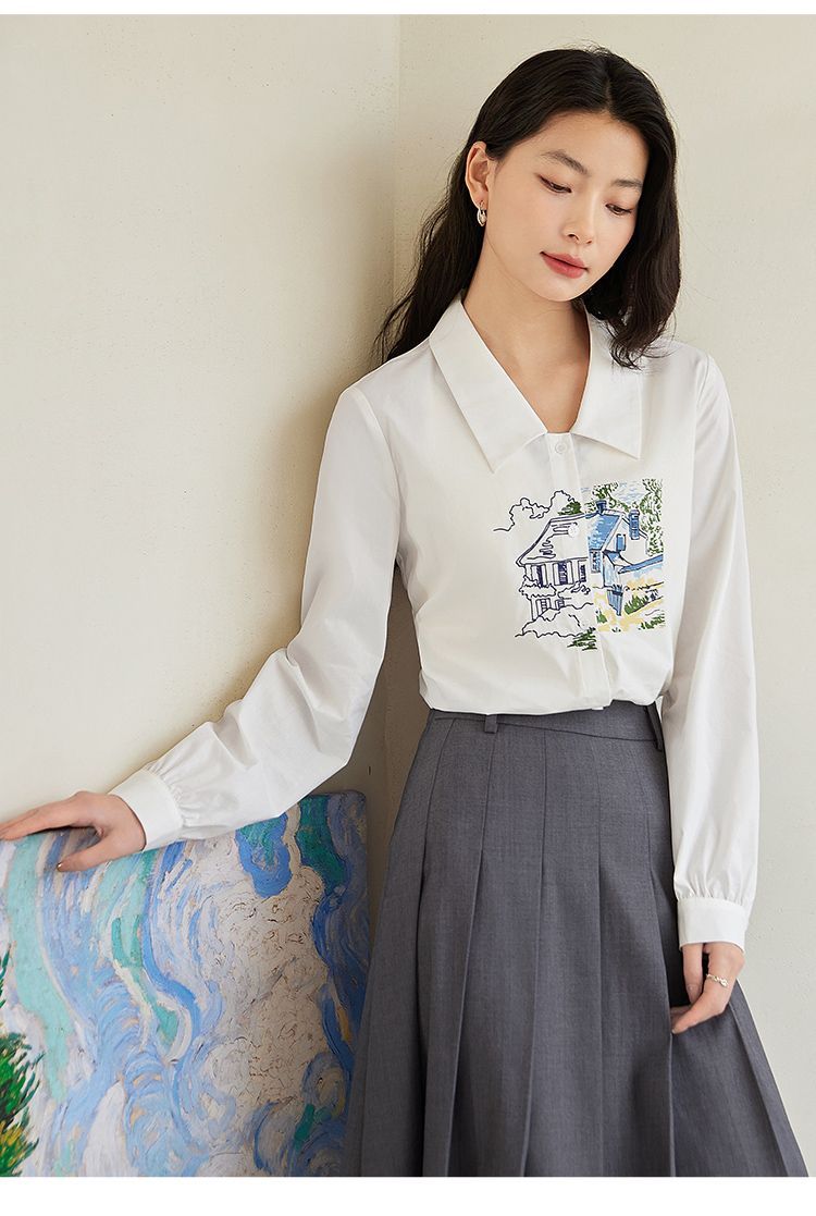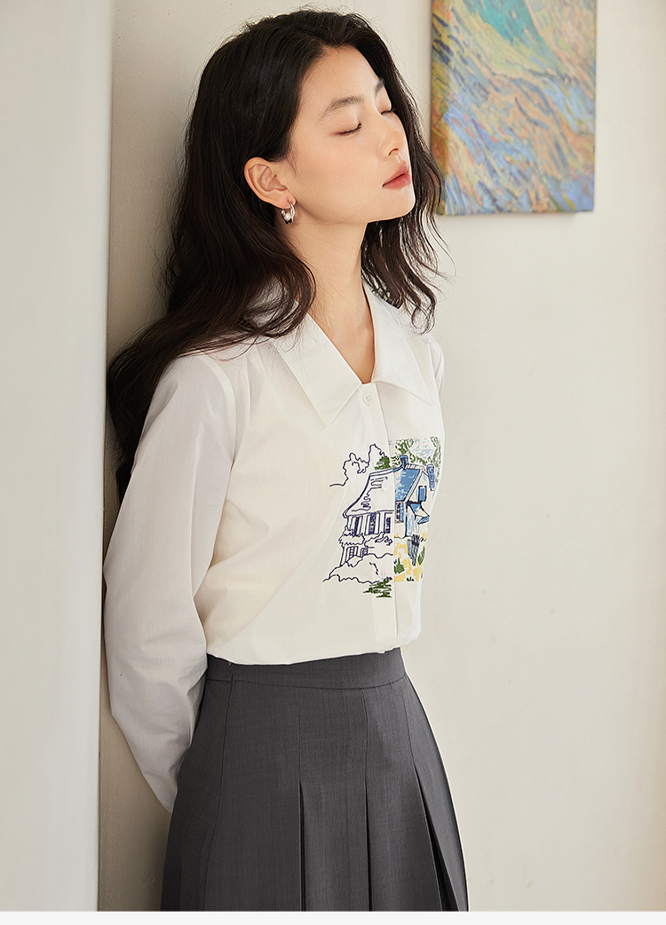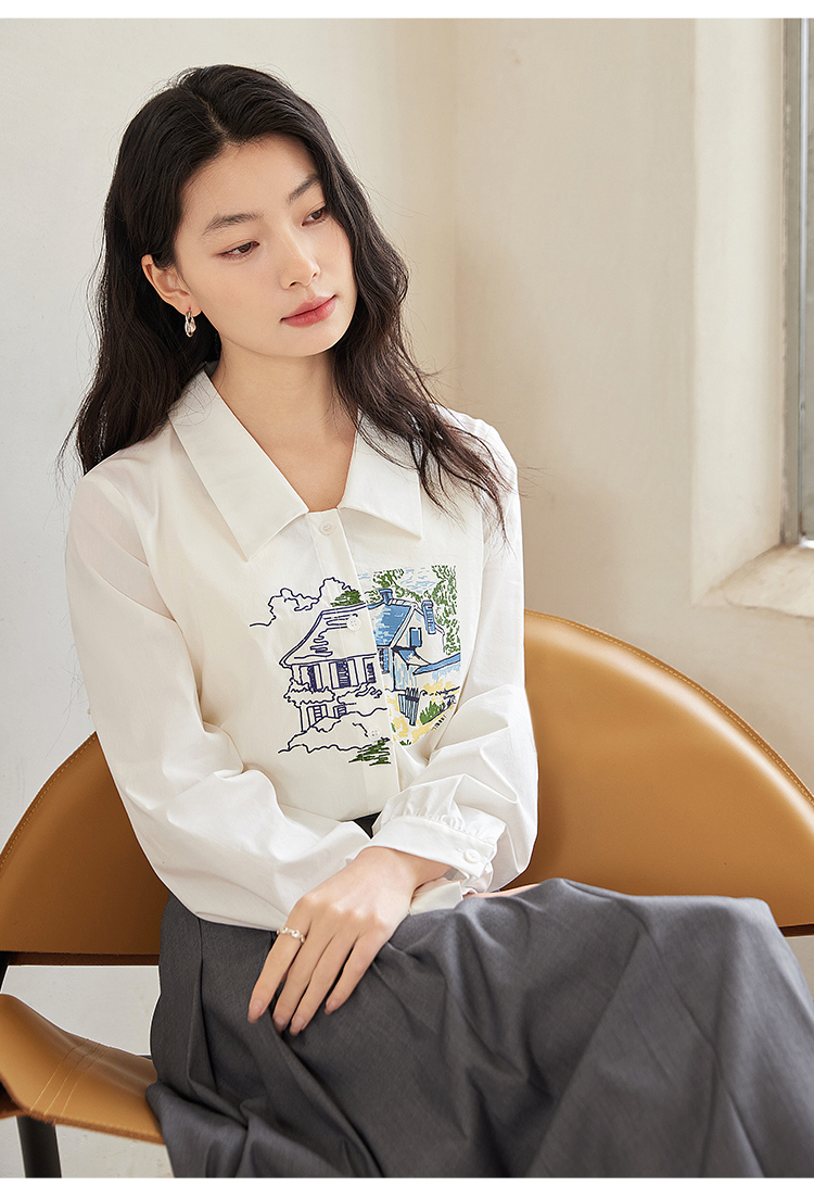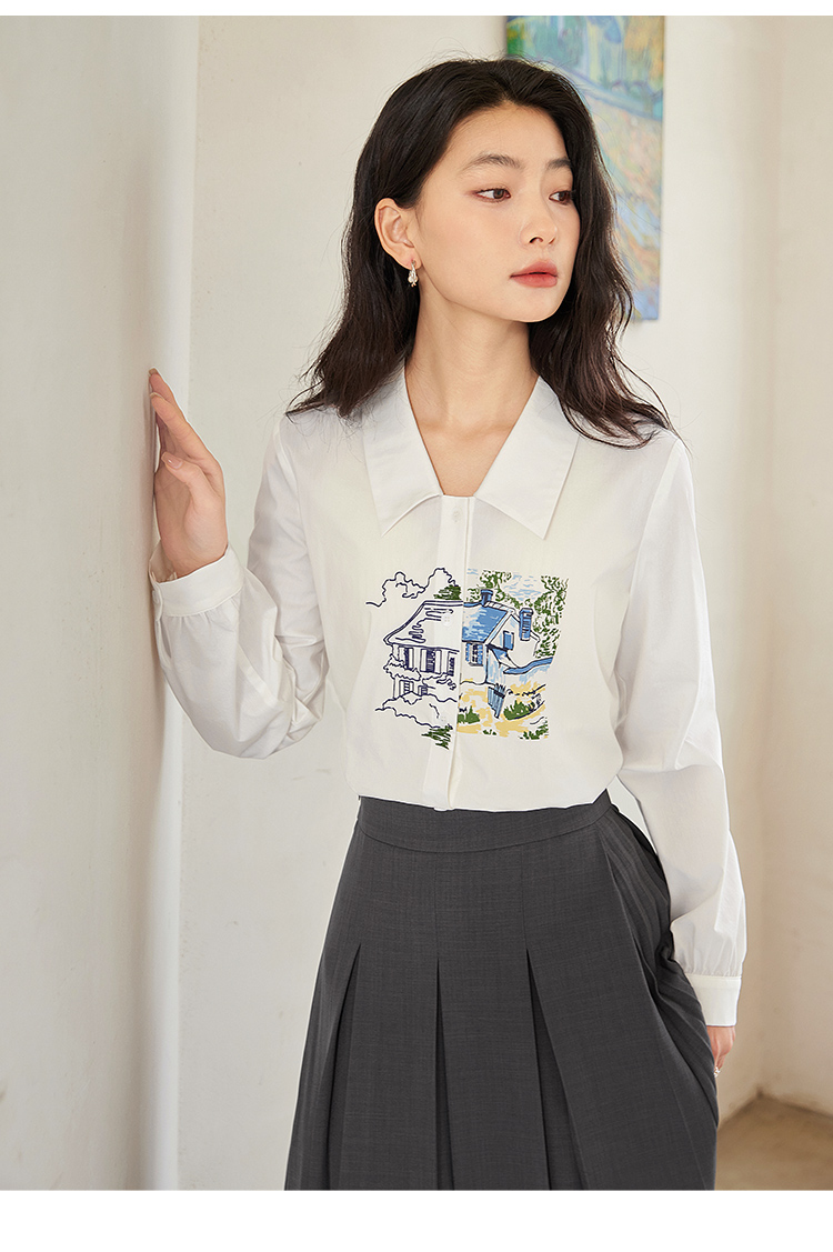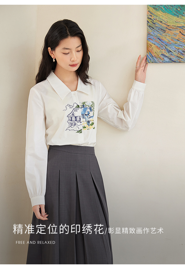【年终特卖】【梵高联名】熙世界白色印花衬衫女长袖宽松休闲上衣2025秋日新款