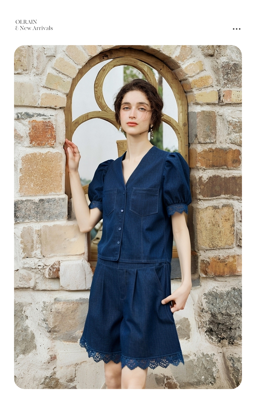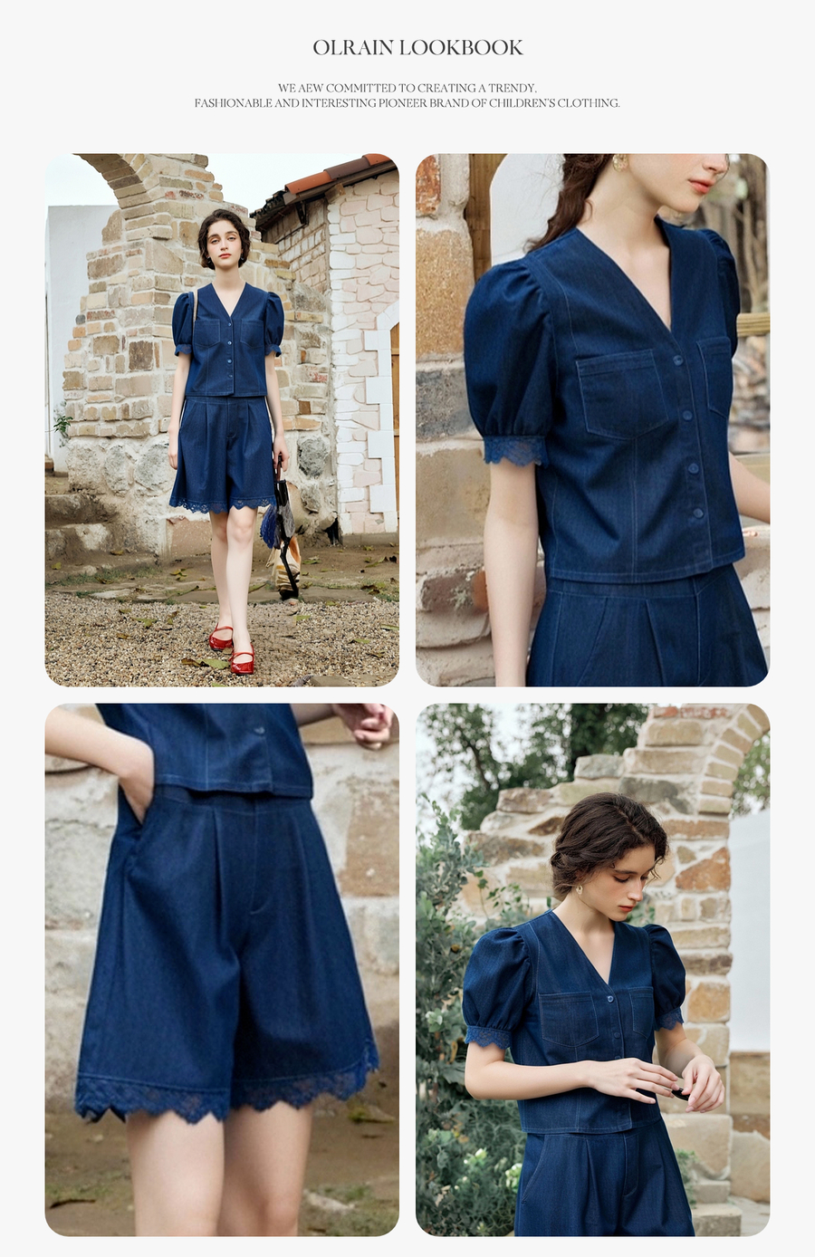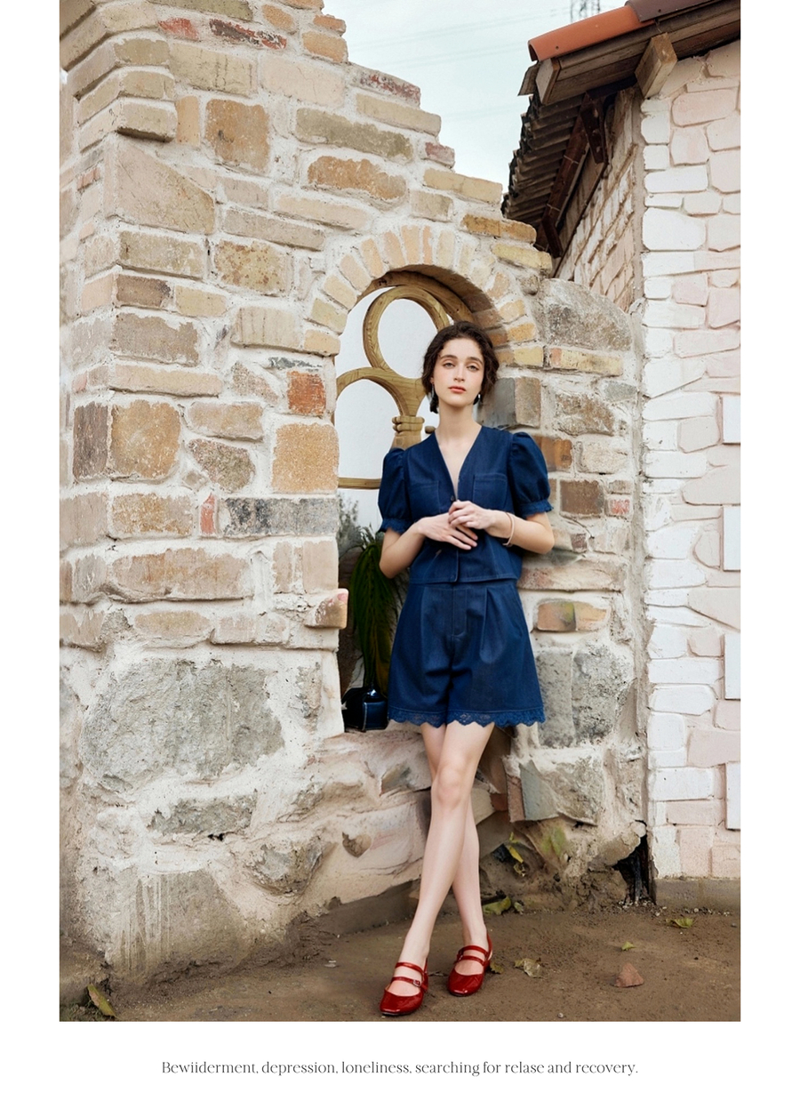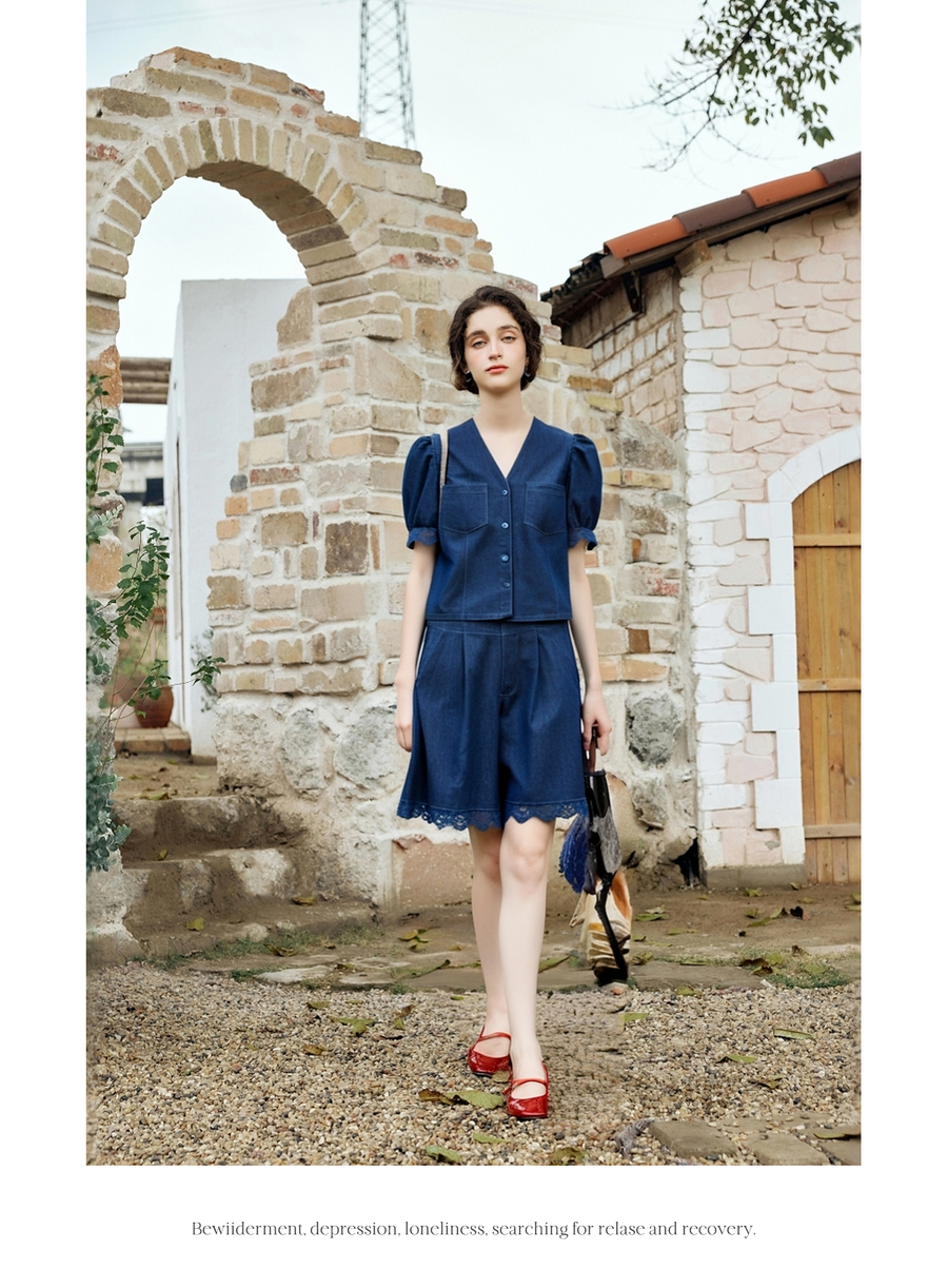 olrain欧芮儿洗水牛仔拼接蕾丝套装女夏季2025新款时尚休闲两件套