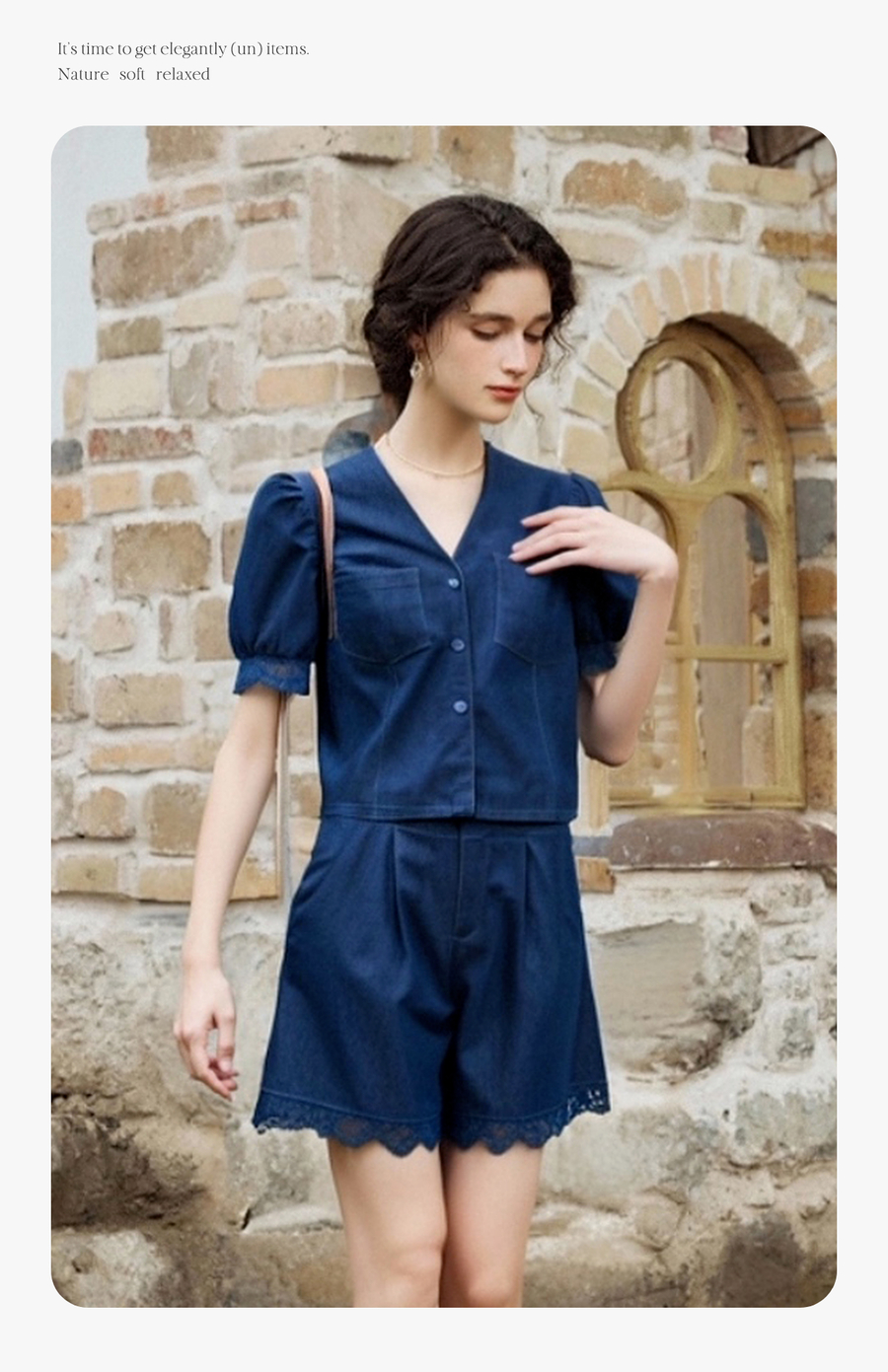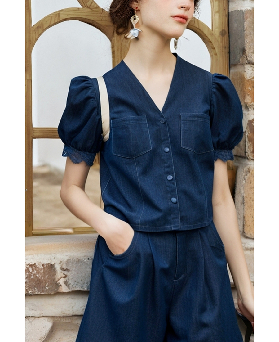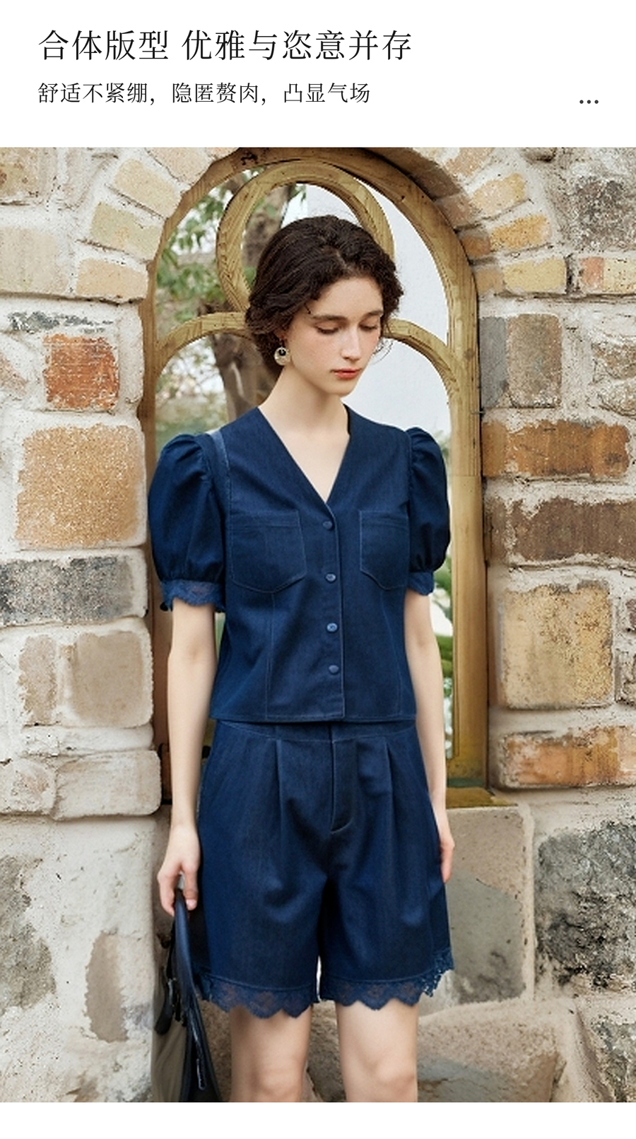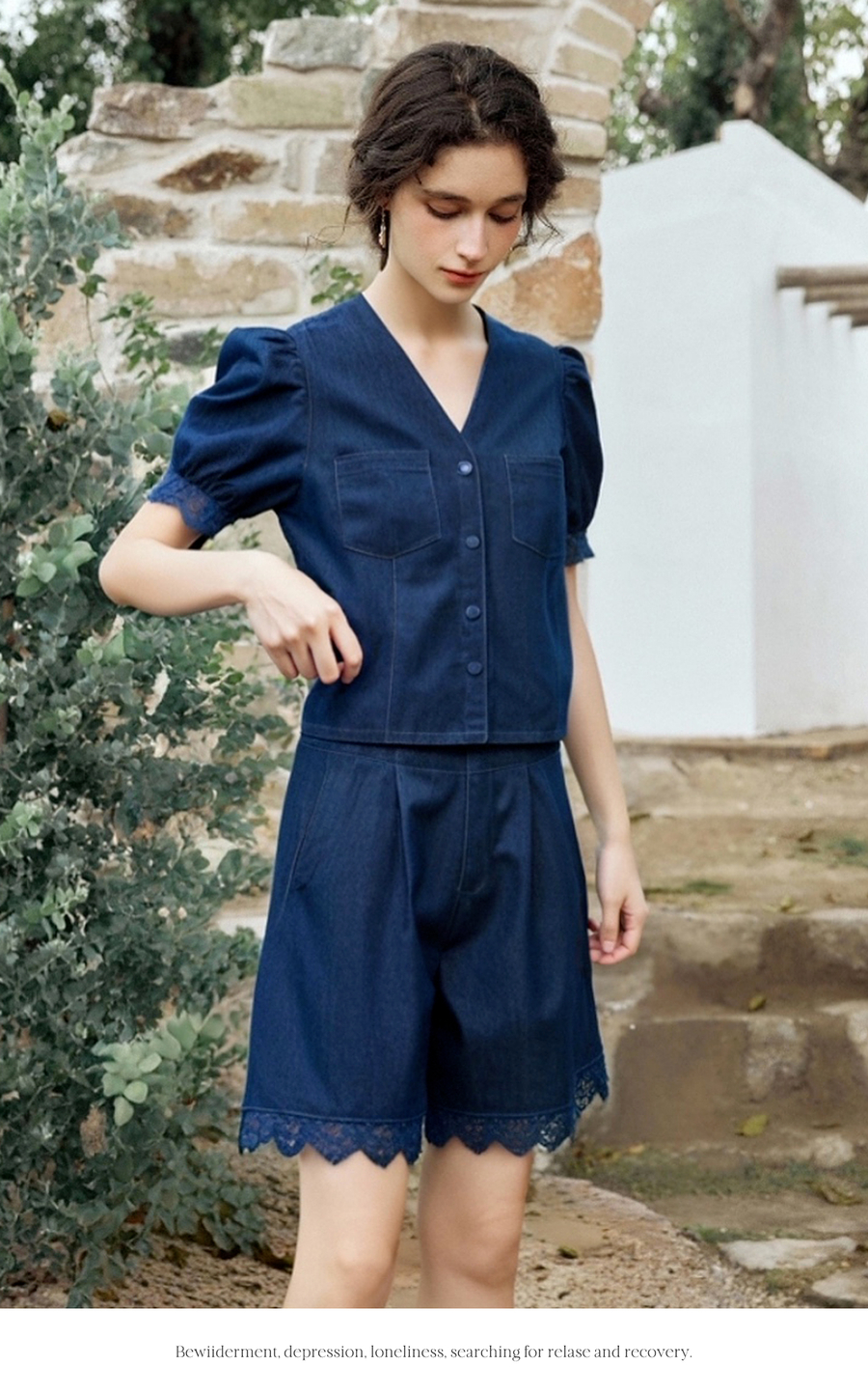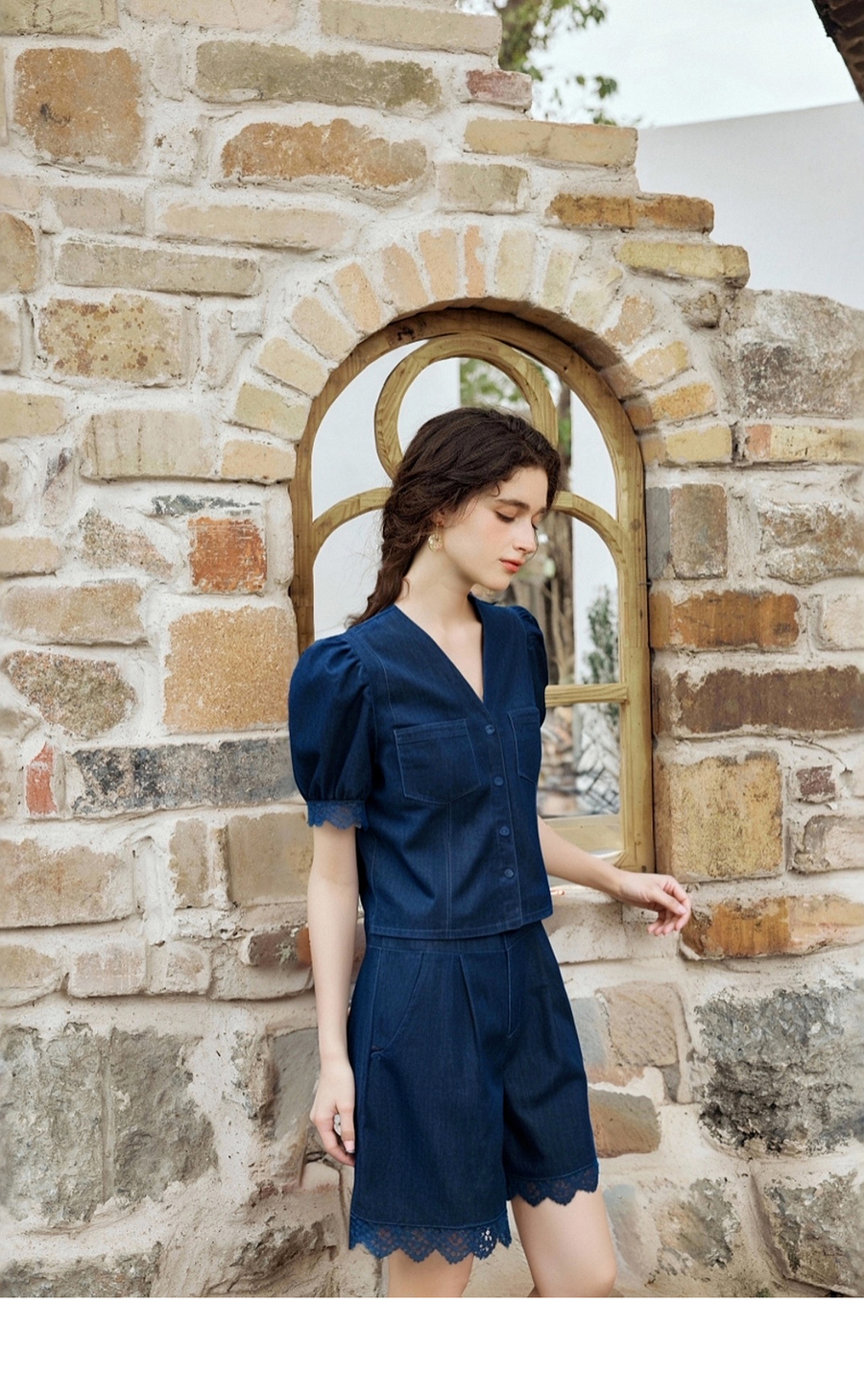 olrain欧芮儿洗水牛仔拼接蕾丝套装女夏季2025新款时尚休闲两件套