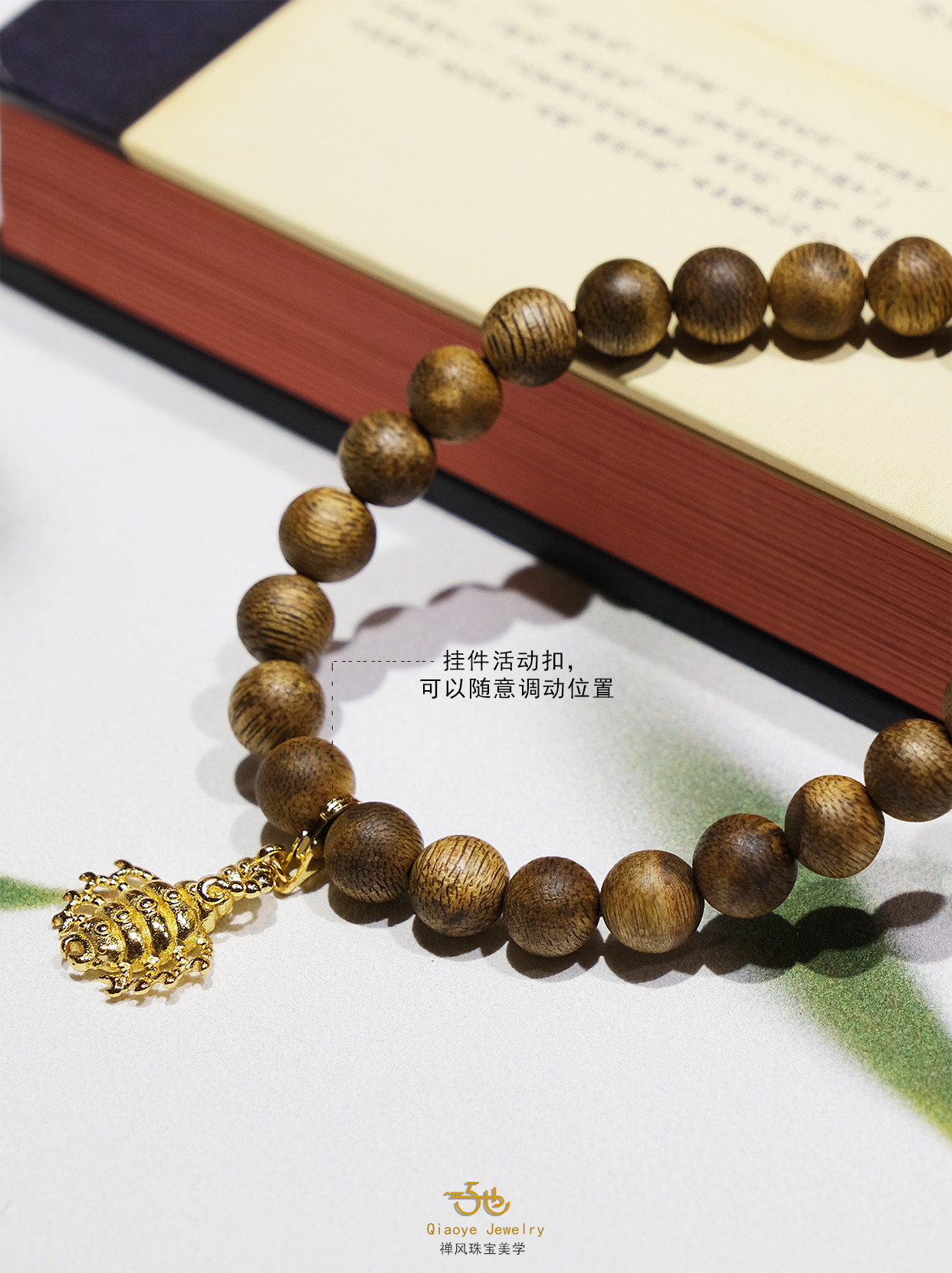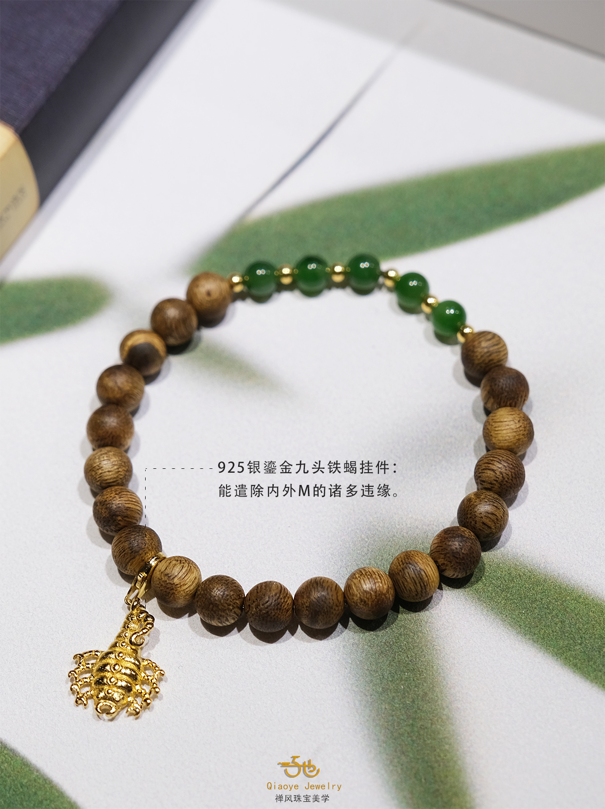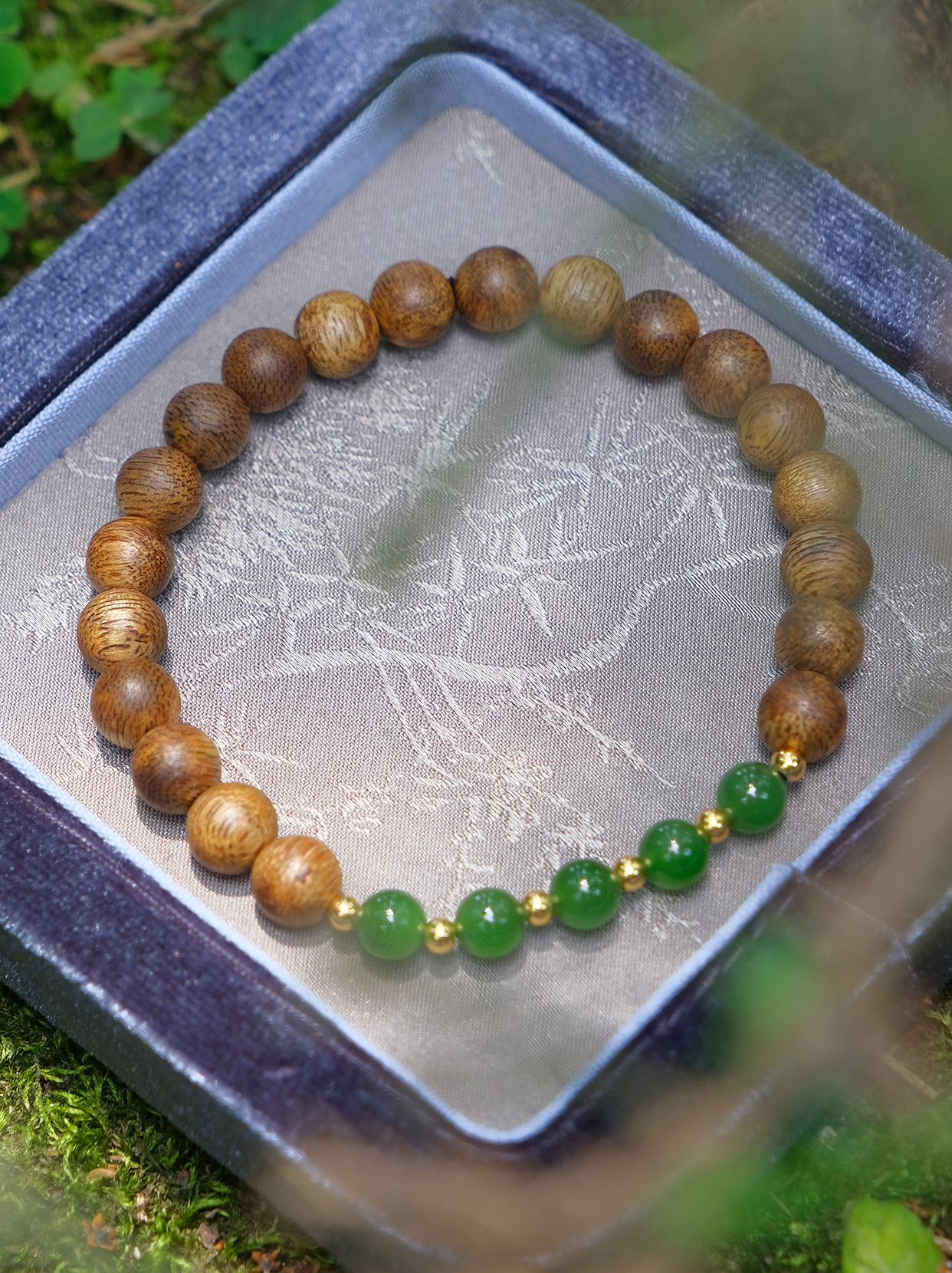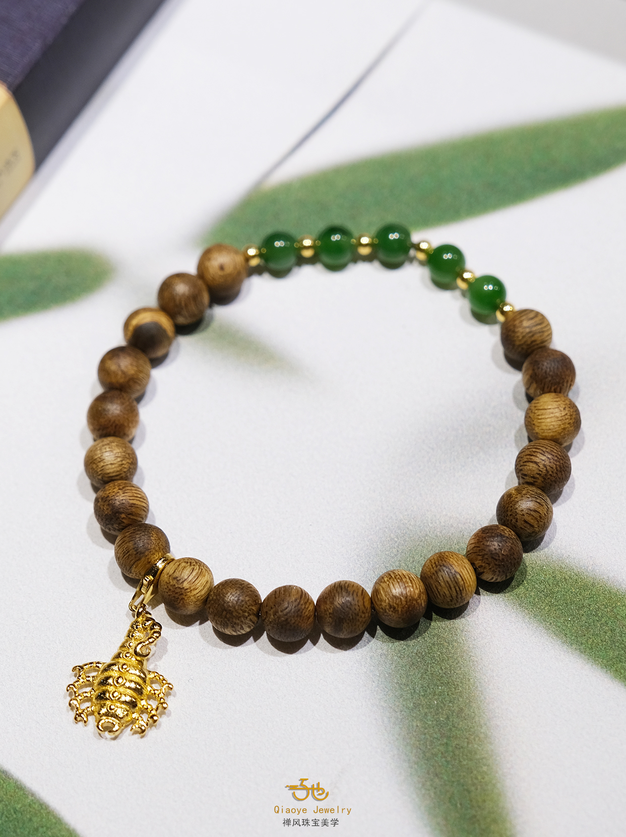 碧玉圆珠点缀其间,色泽浓郁如幽潭碧波,与沉香珠相映成趣。碧玉在传统文化中象征着生机与希望,恰似佛法中蕴含的无尽慈悲与智慧,为手链注入灵动与祥瑞。金色隔珠如佛前的点点金芒,柔和而耀眼,寓意着光明与指引。
