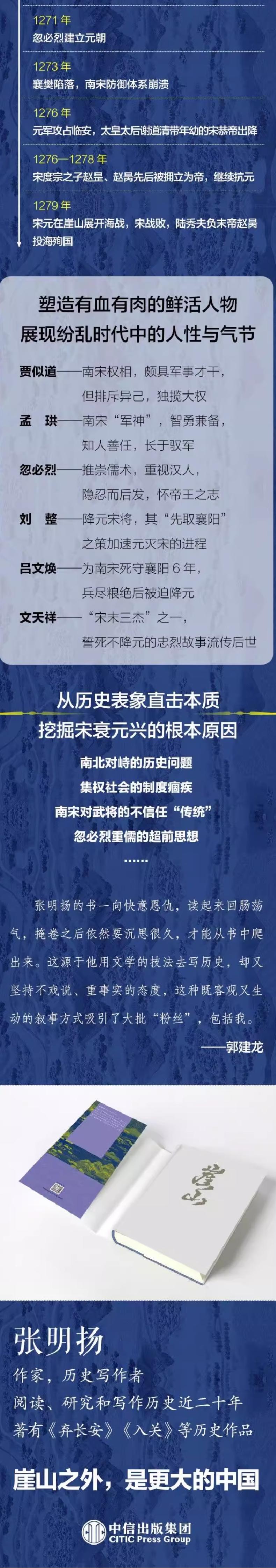 本书主要讲述的是宋末元初的崖山海战。 这是一场决定王朝兴替、影响中国历史进程的著名战役。1279年,蒙古军队与南宋军队在广东新会崖山海面上,展开了一场大规模的海战,最终南宋军队落败,南宋末帝赵昺并十万军民投海殉国。 本书以历史中的十个地名(钓鱼城、鄂州、上都、益都、泸州、襄阳、大都、丁家洲、临安和崖山)为线索,自 1234年“端平入洛”开始,一直写到1279 年南宋灭亡,时间跨越了近五十年。 书中以南宋何以灭亡、元朝何以崛起作为两条主线,同时从政治、外交、文化、军事等多元视角,全面地描写了从蒙宋灭金到崖山海战的整个过程。襄阳鏖战、临安出降、南宋灭亡,以及最后的文天祥之死,生动而悲壮。作者用细腻的文笔描写了忽必烈、蒙哥、王文统、阿合马、吕文焕、贾似道、刘整、文天祥等诸多历史人物的命运和选择,力求还原一段真实的历史。 崖山之外,是更大的中国。