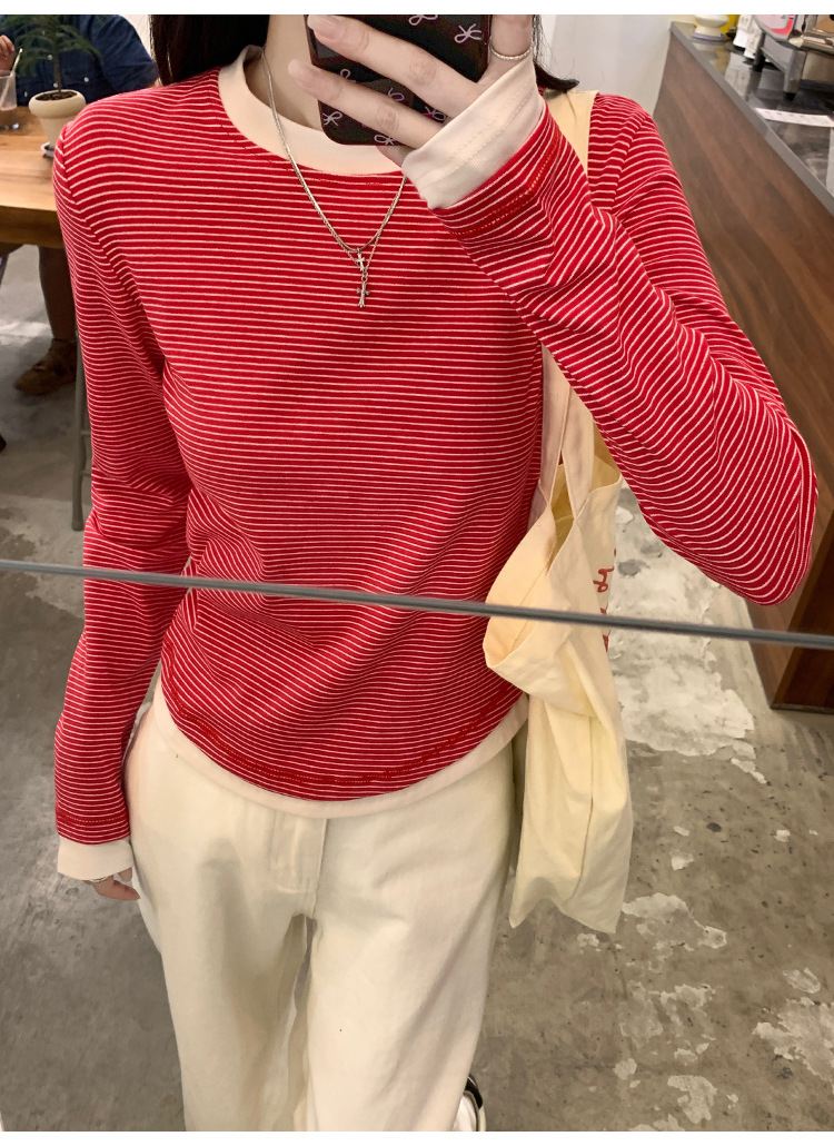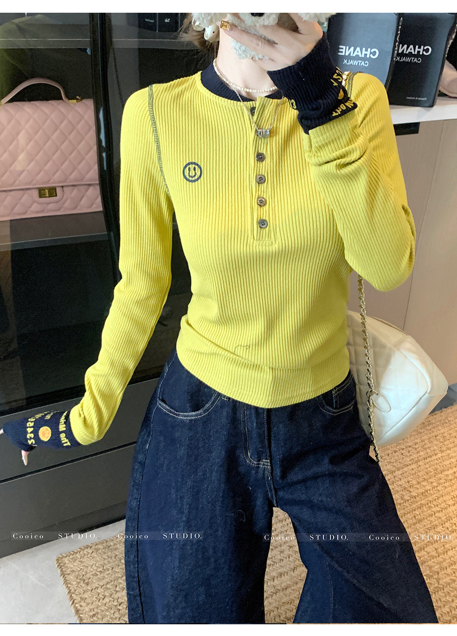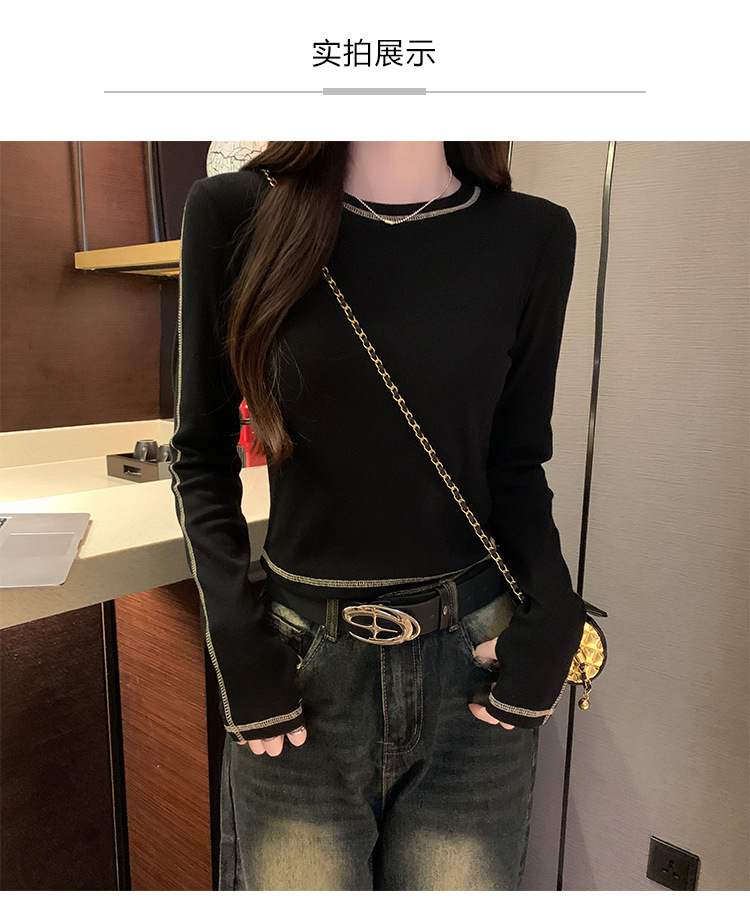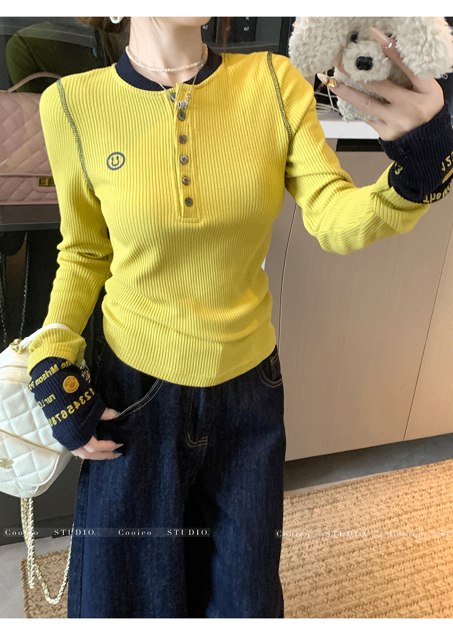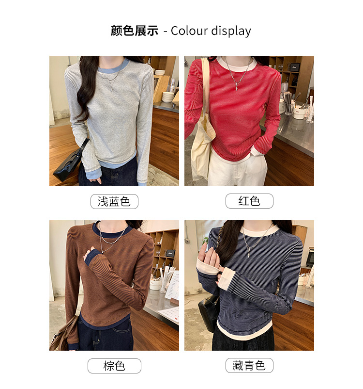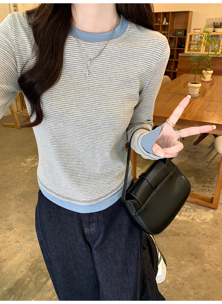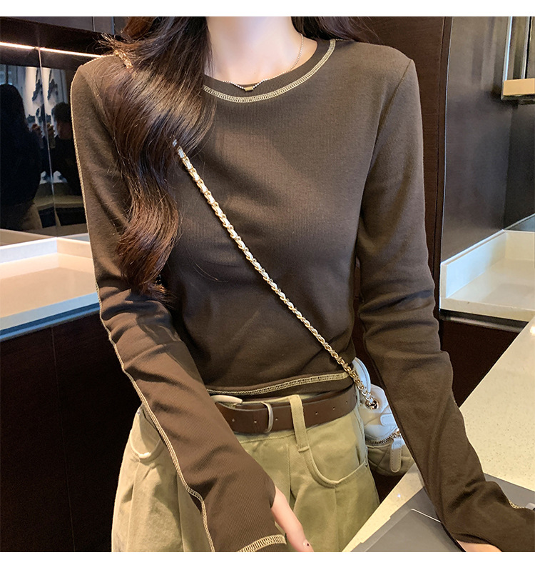 【99元拍2件】【甜辣风纯棉T恤】撞色圆领纯棉T恤 秋季假两件设计感修身内搭单穿上衣