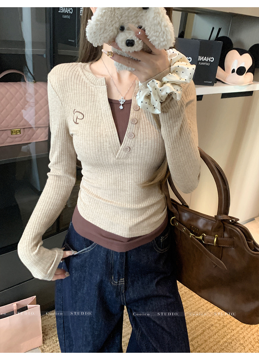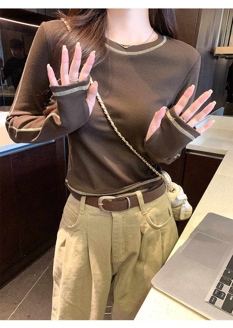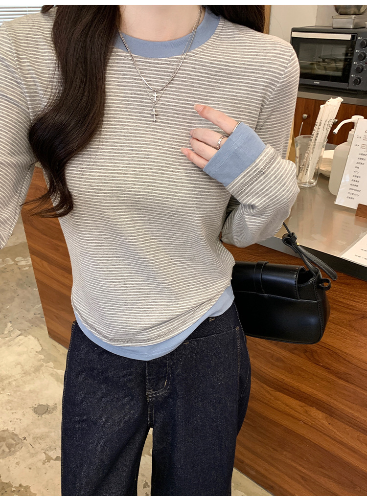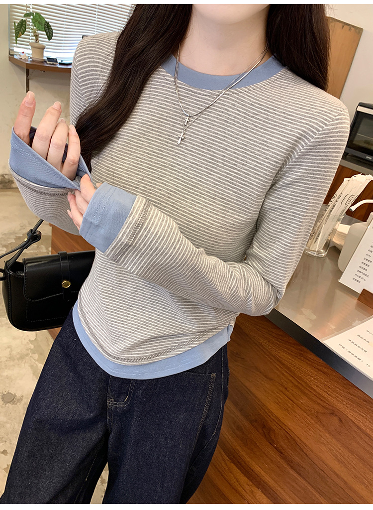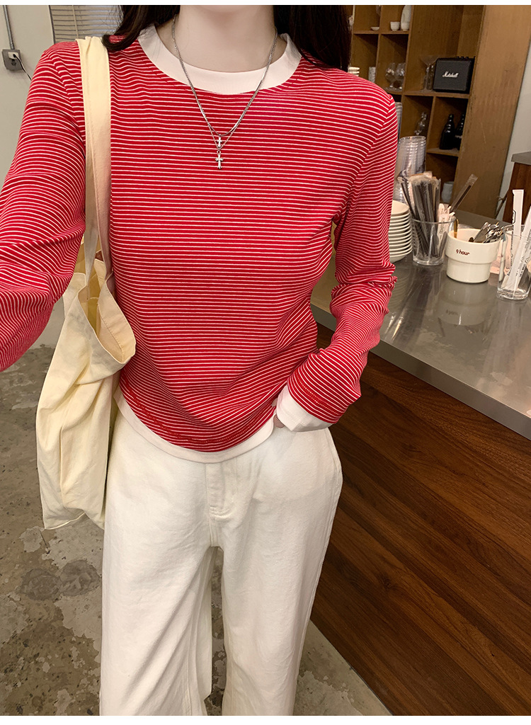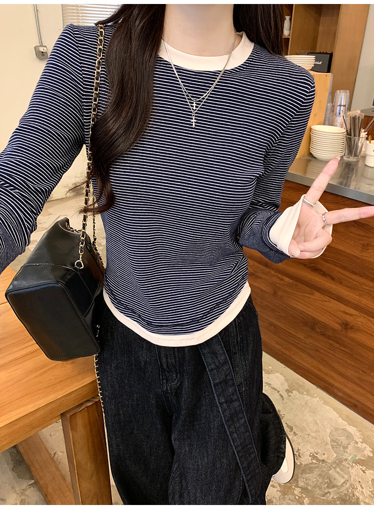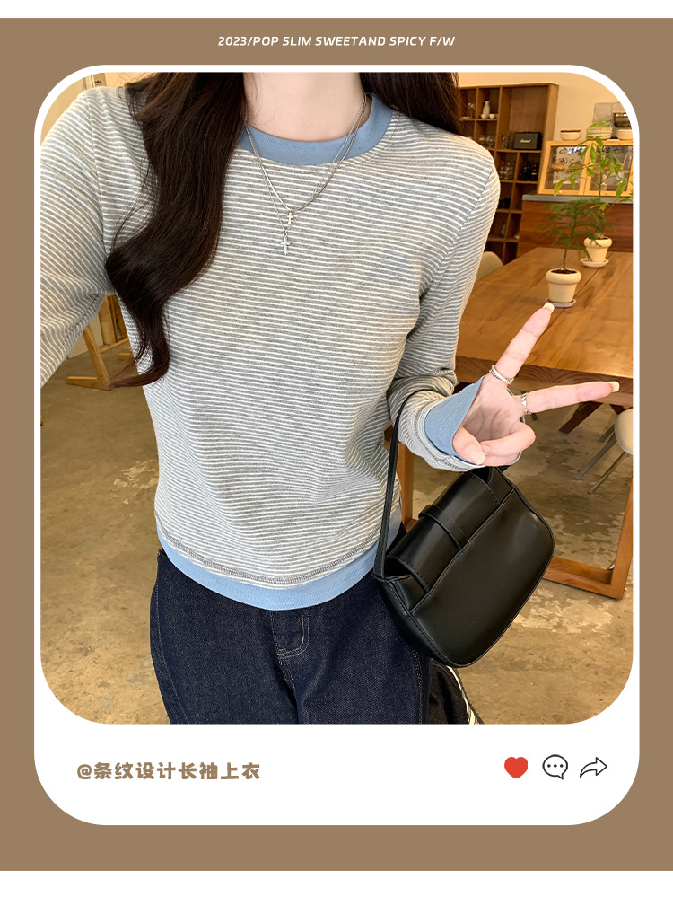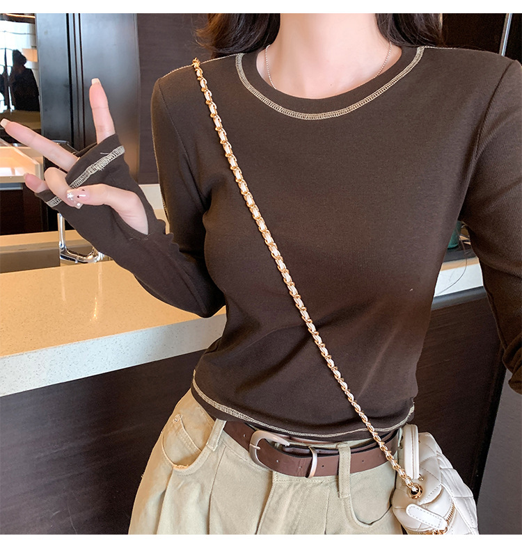 【99元拍2件】【甜辣风纯棉T恤】撞色圆领纯棉T恤 秋季假两件设计感修身内搭单穿上衣