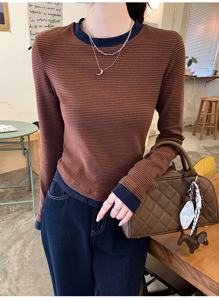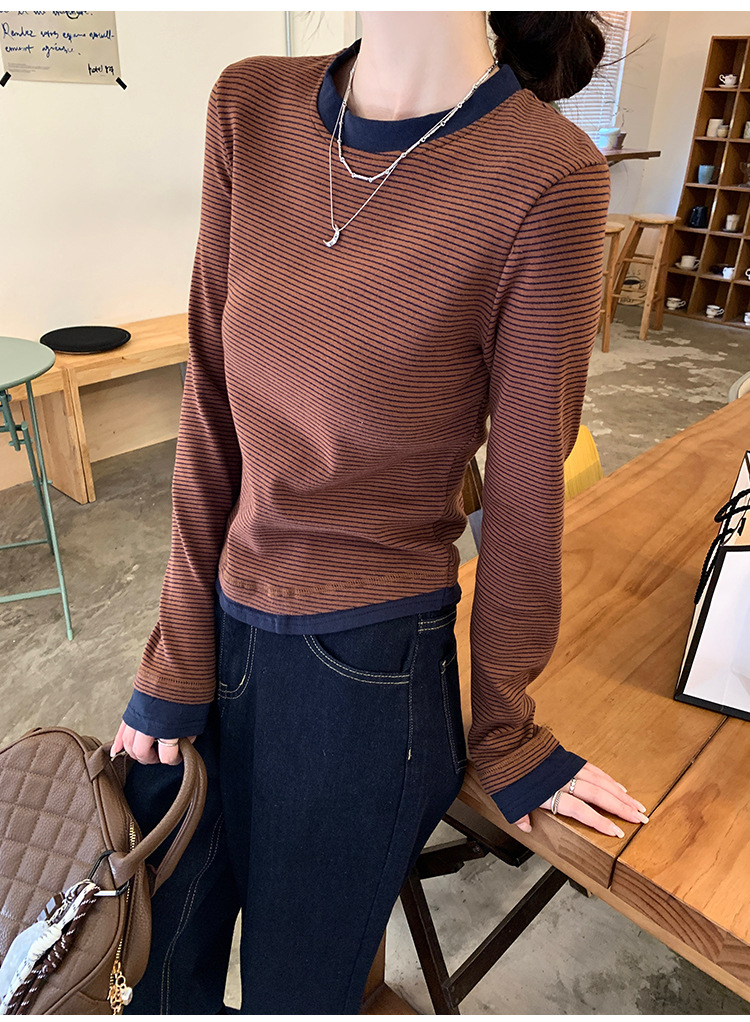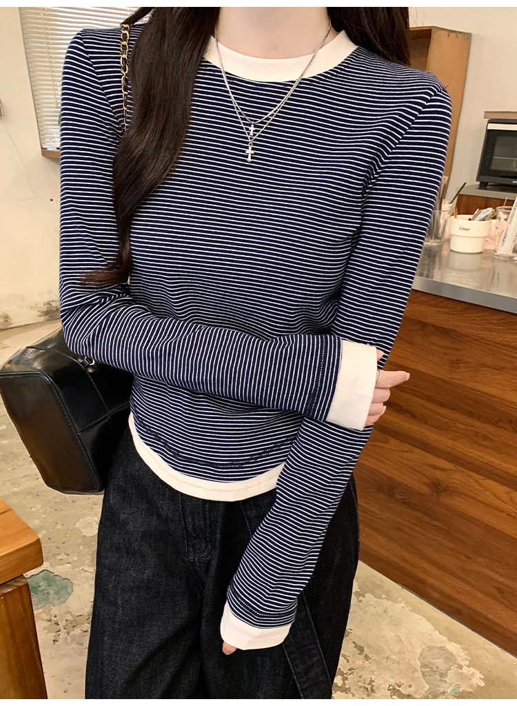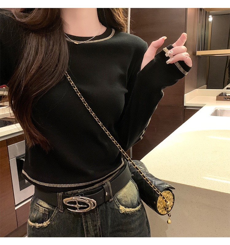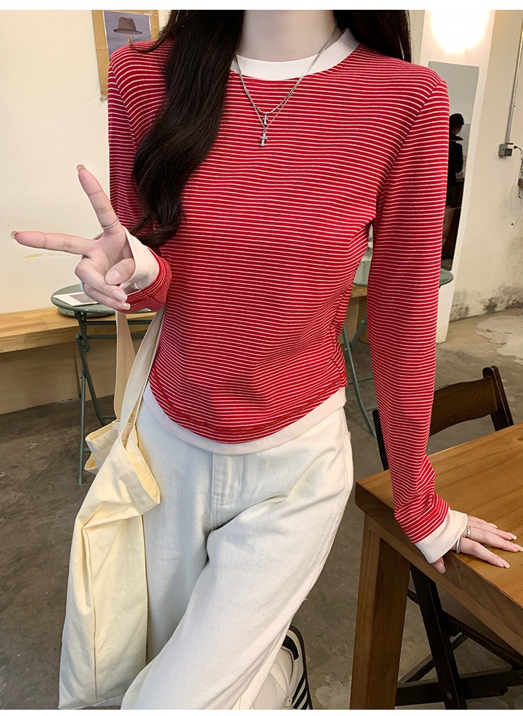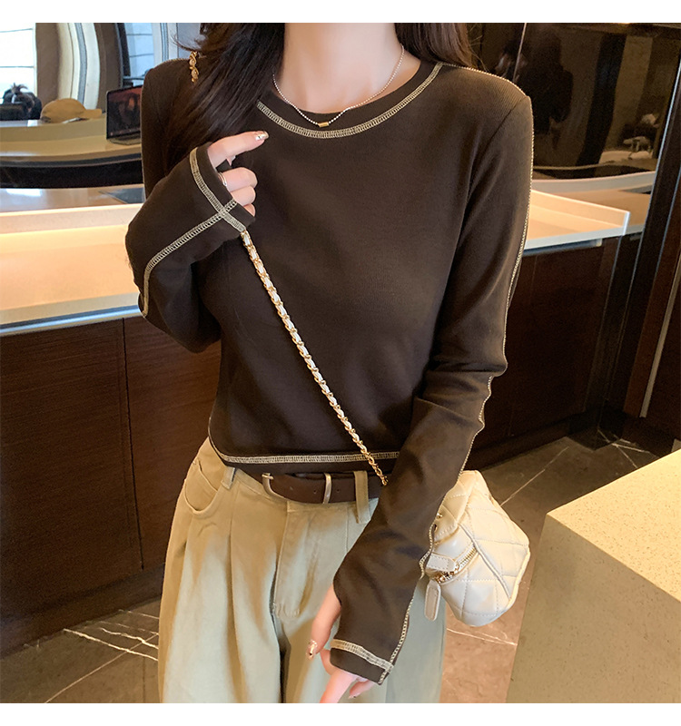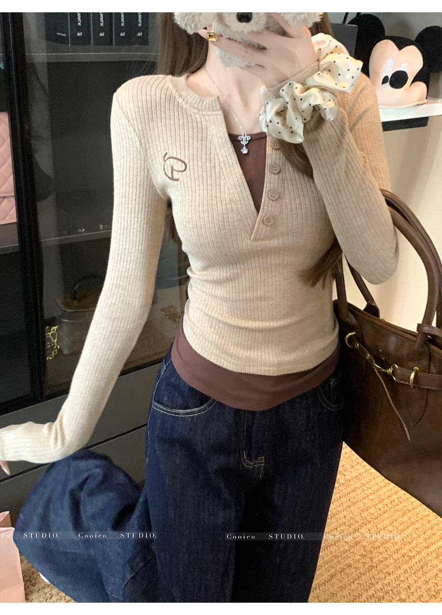 【99元拍2件】【甜辣风纯棉T恤】撞色圆领纯棉T恤 秋季假两件设计感修身内搭单穿上衣
