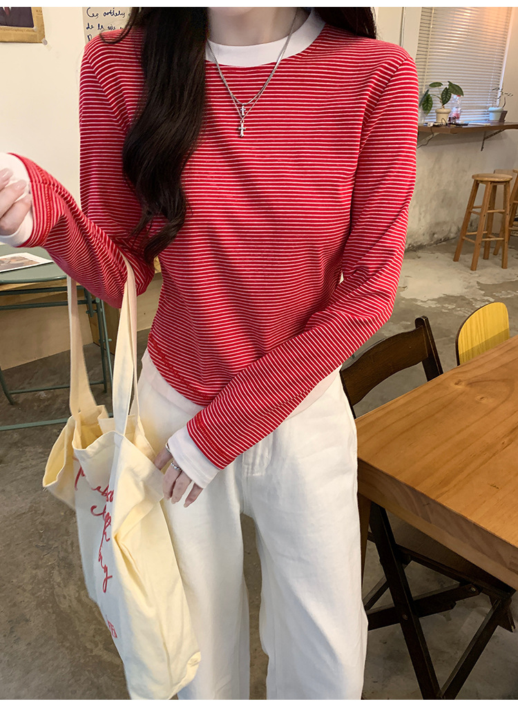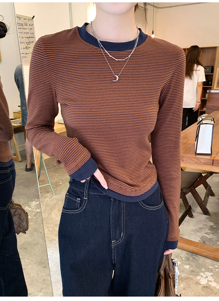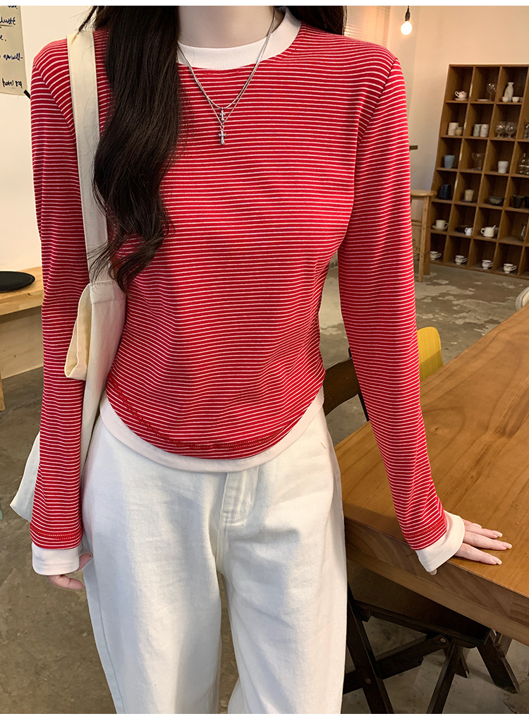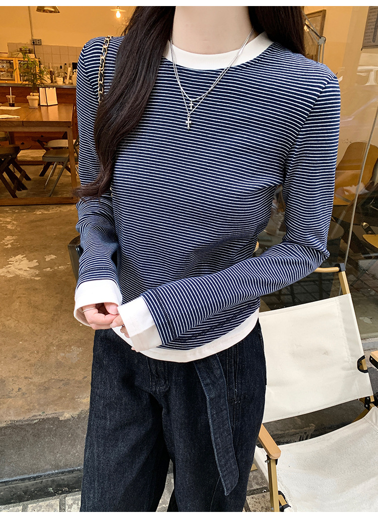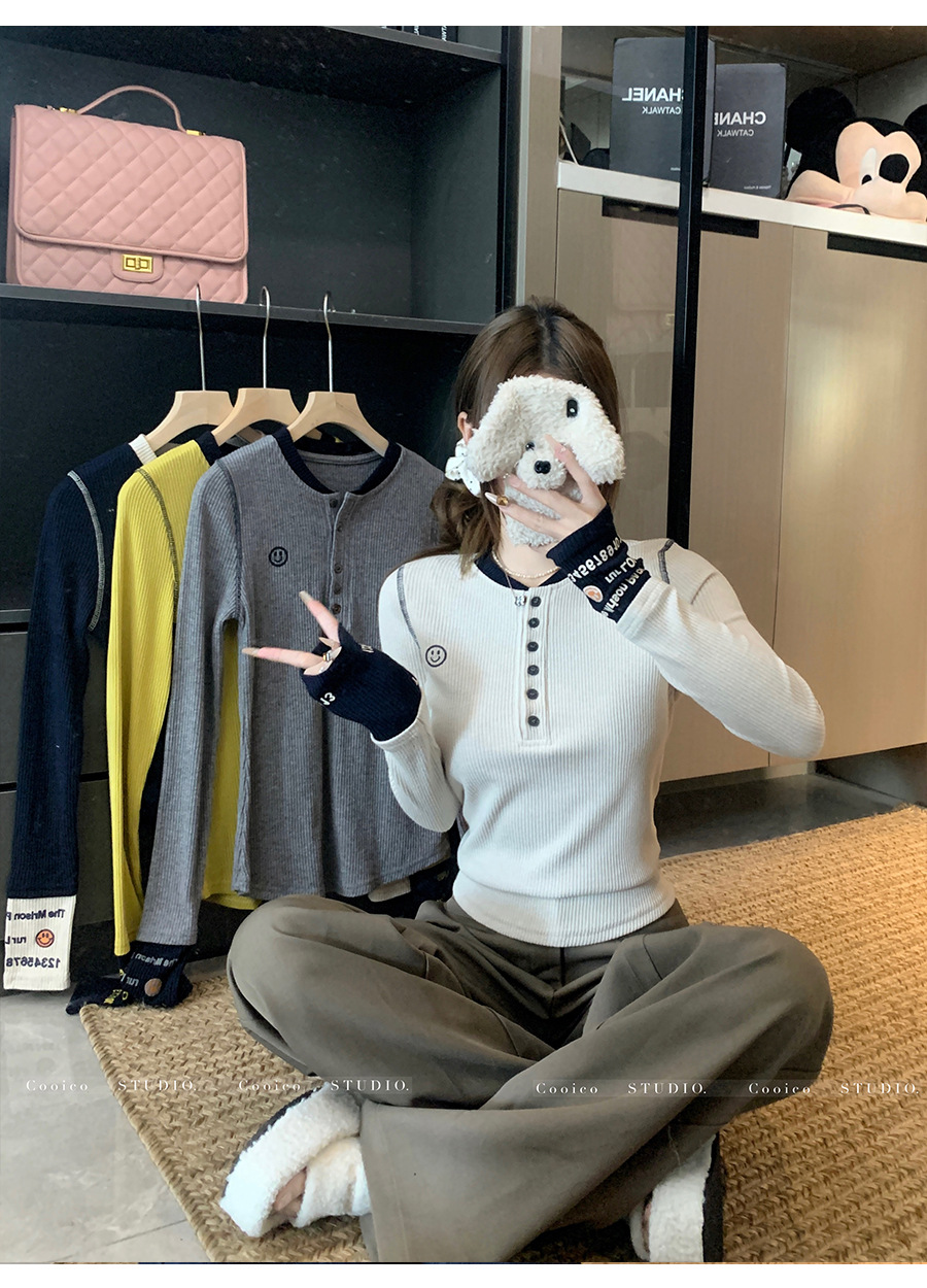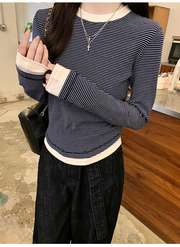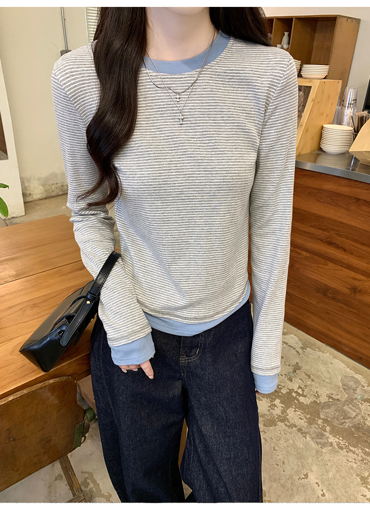 【99元拍2件】【甜辣风纯棉T恤】撞色圆领纯棉T恤 秋季假两件设计感修身内搭单穿上衣