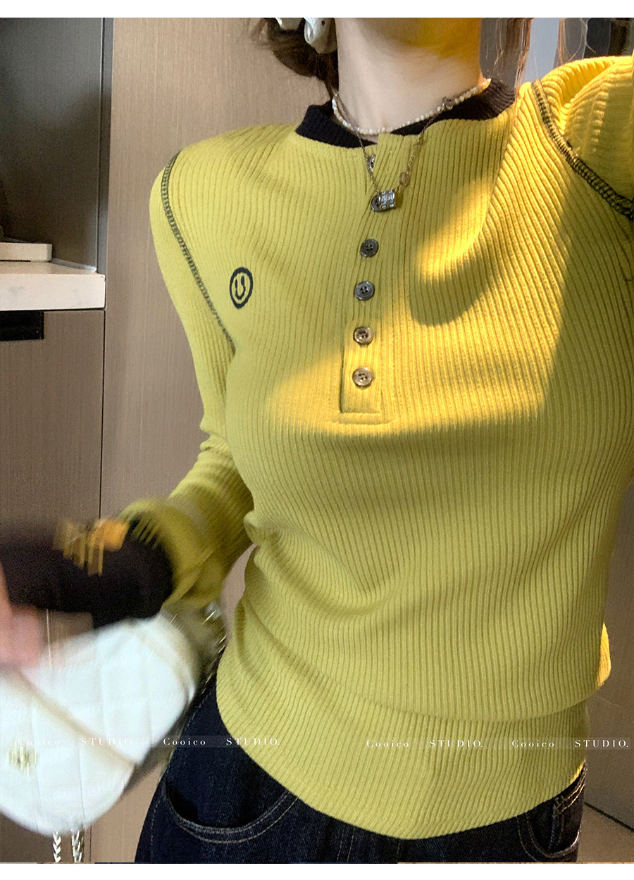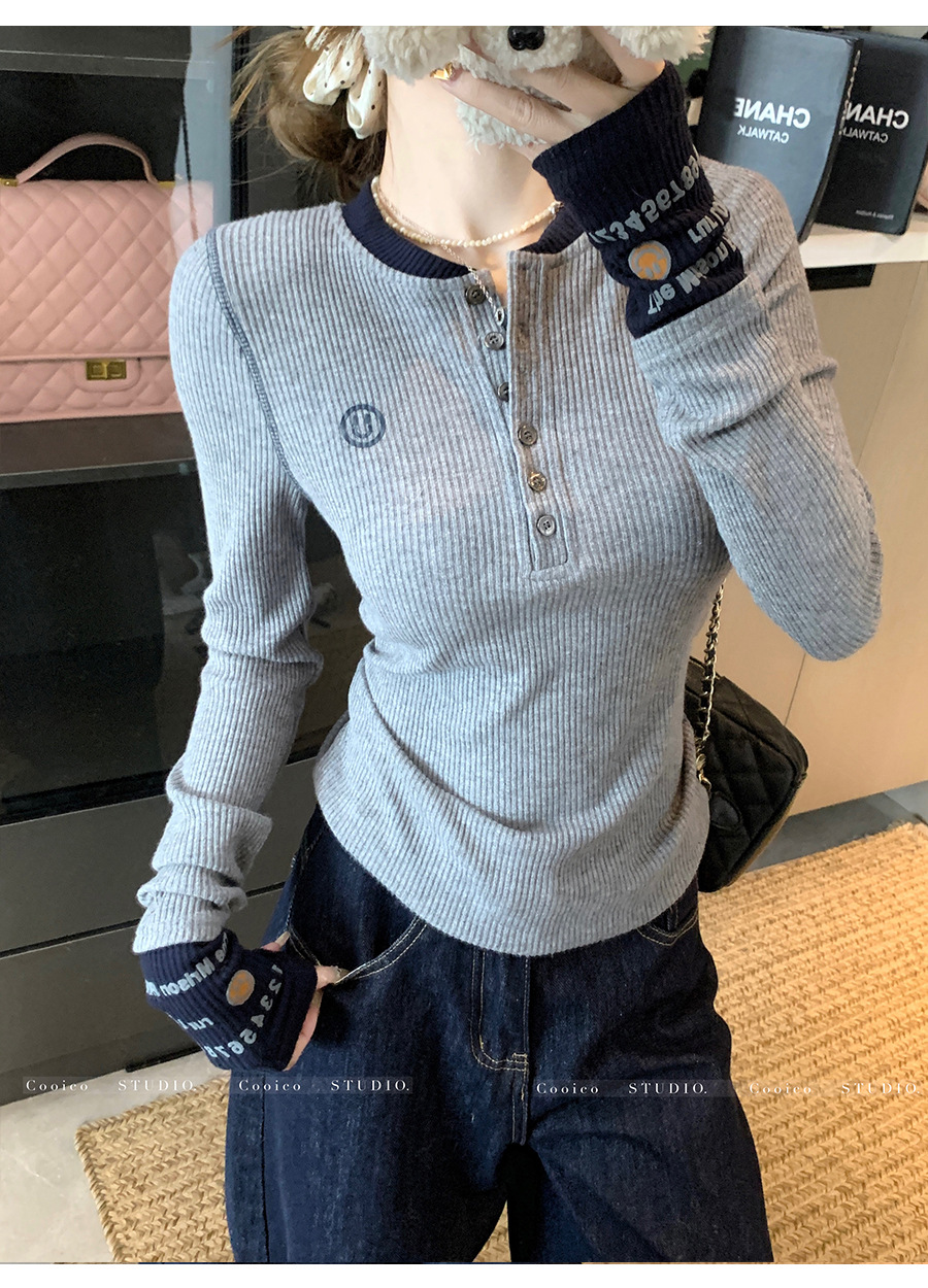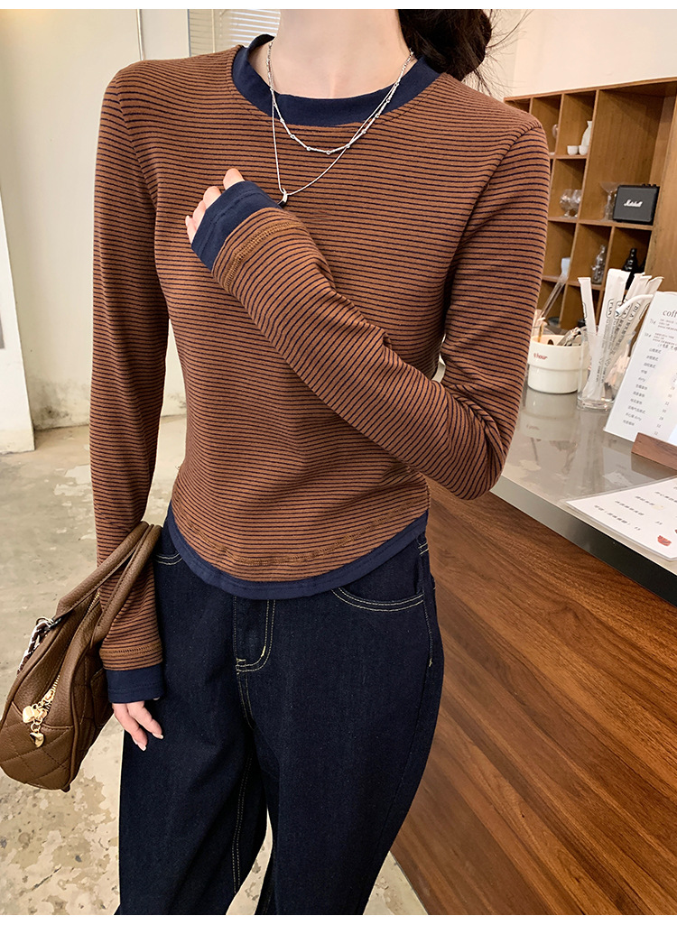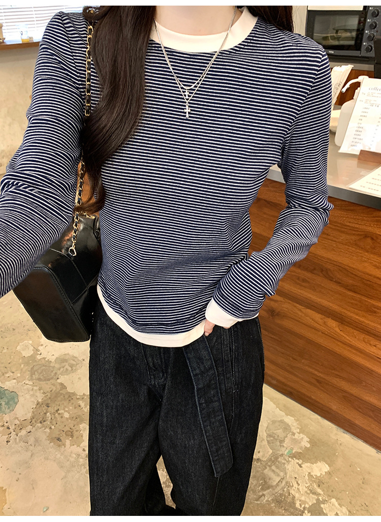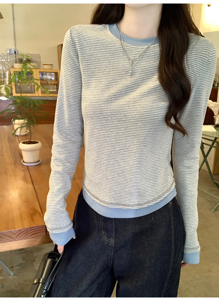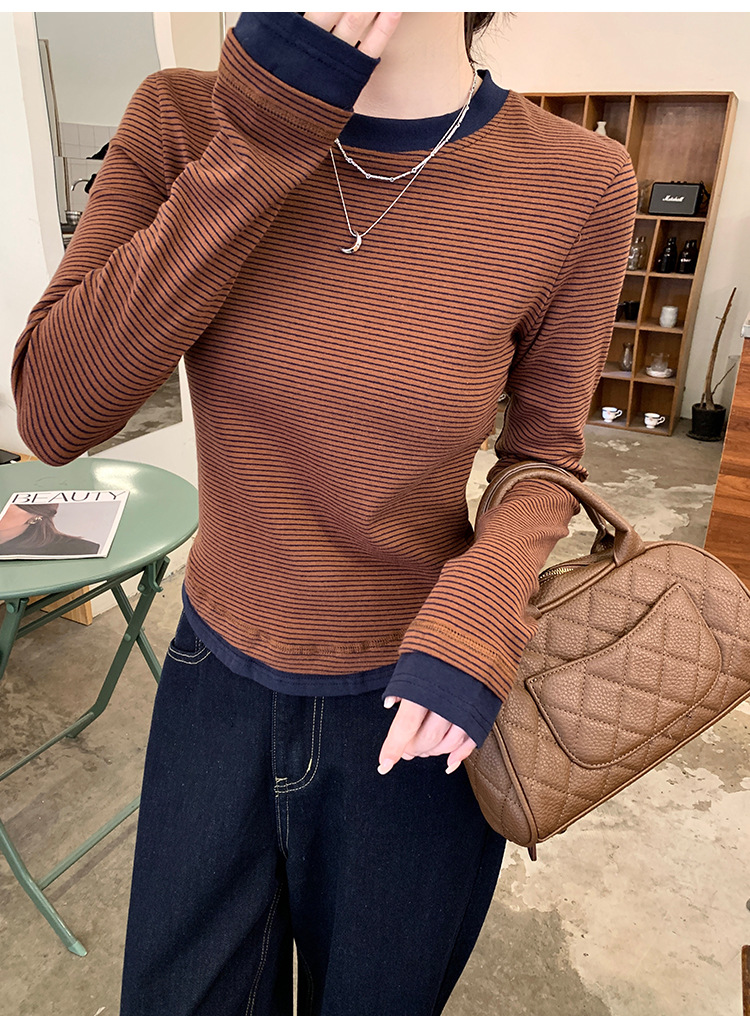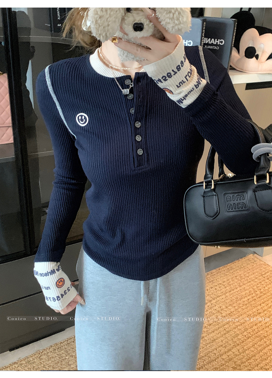 【99元拍2件】【甜辣风纯棉T恤】撞色圆领纯棉T恤 秋季假两件设计感修身内搭单穿上衣