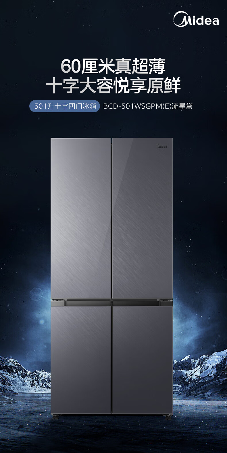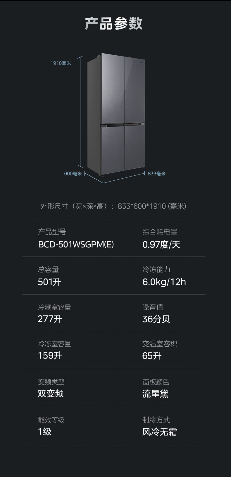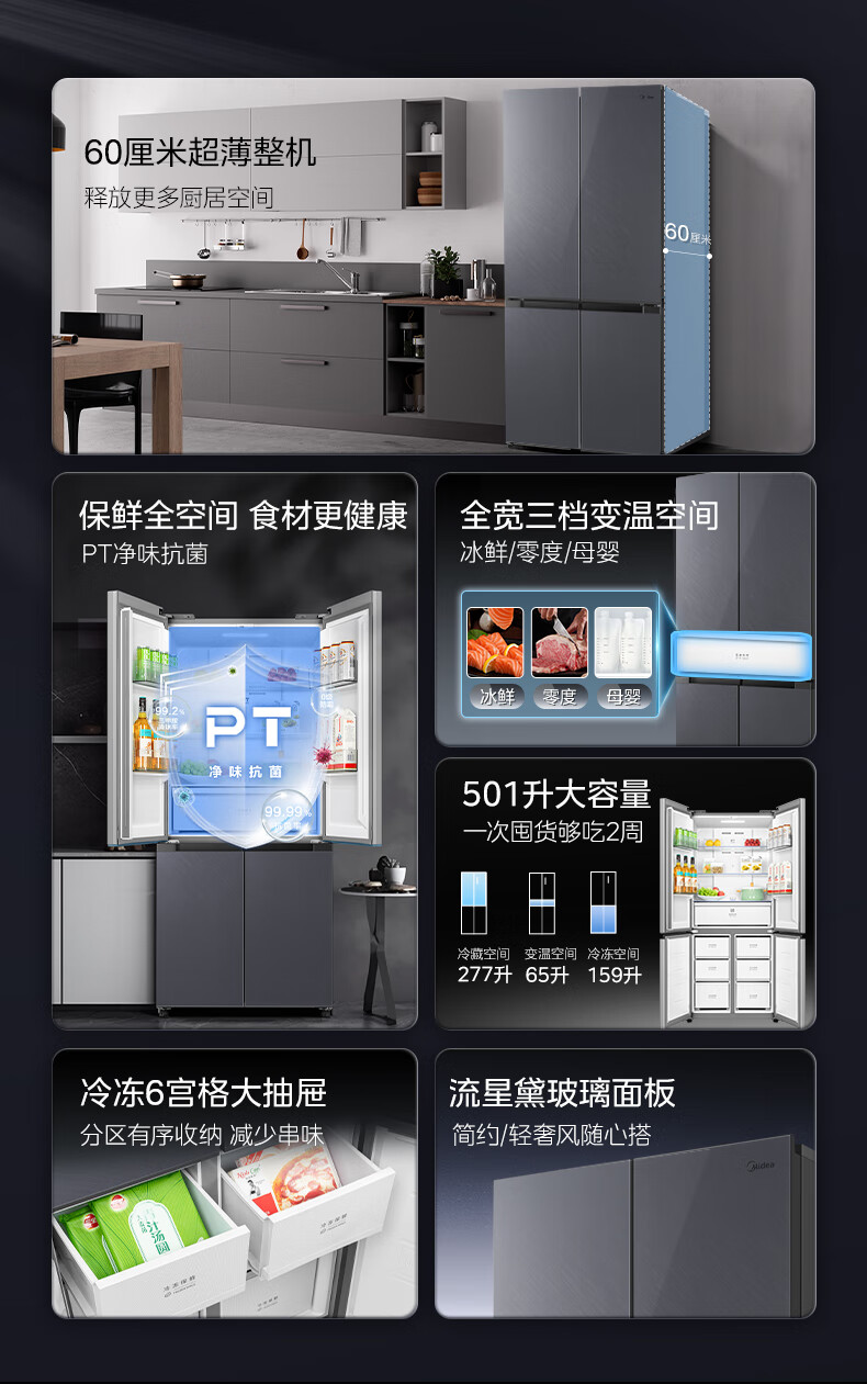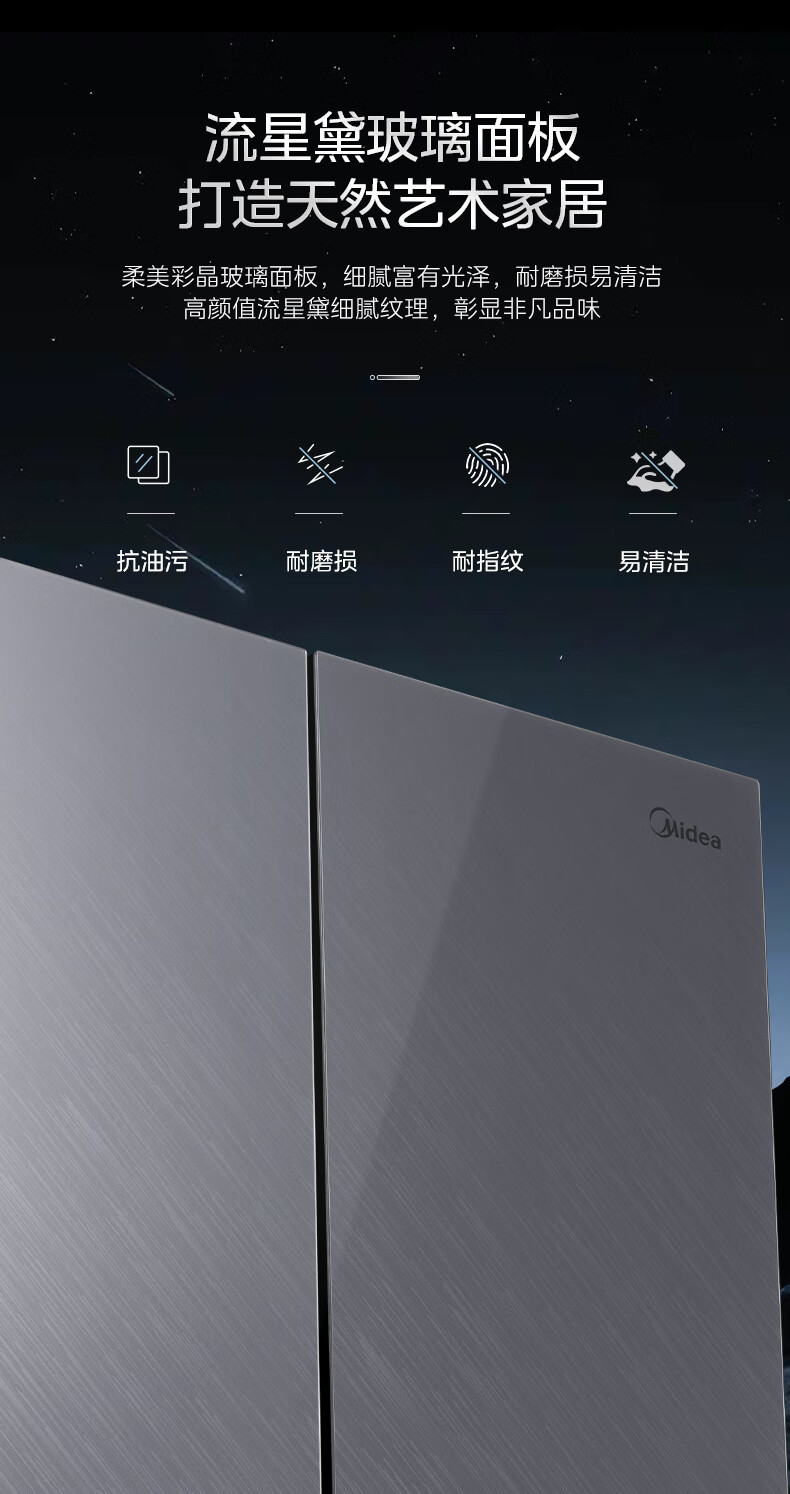 美的(Midea)501升 十字对开门冰箱 双变频一级 大容量净味 60厘米薄 三档变温 PT净味抗菌 全宽变温抽屉BCD-501WSGPM(E)流星黛-【玻璃面板】