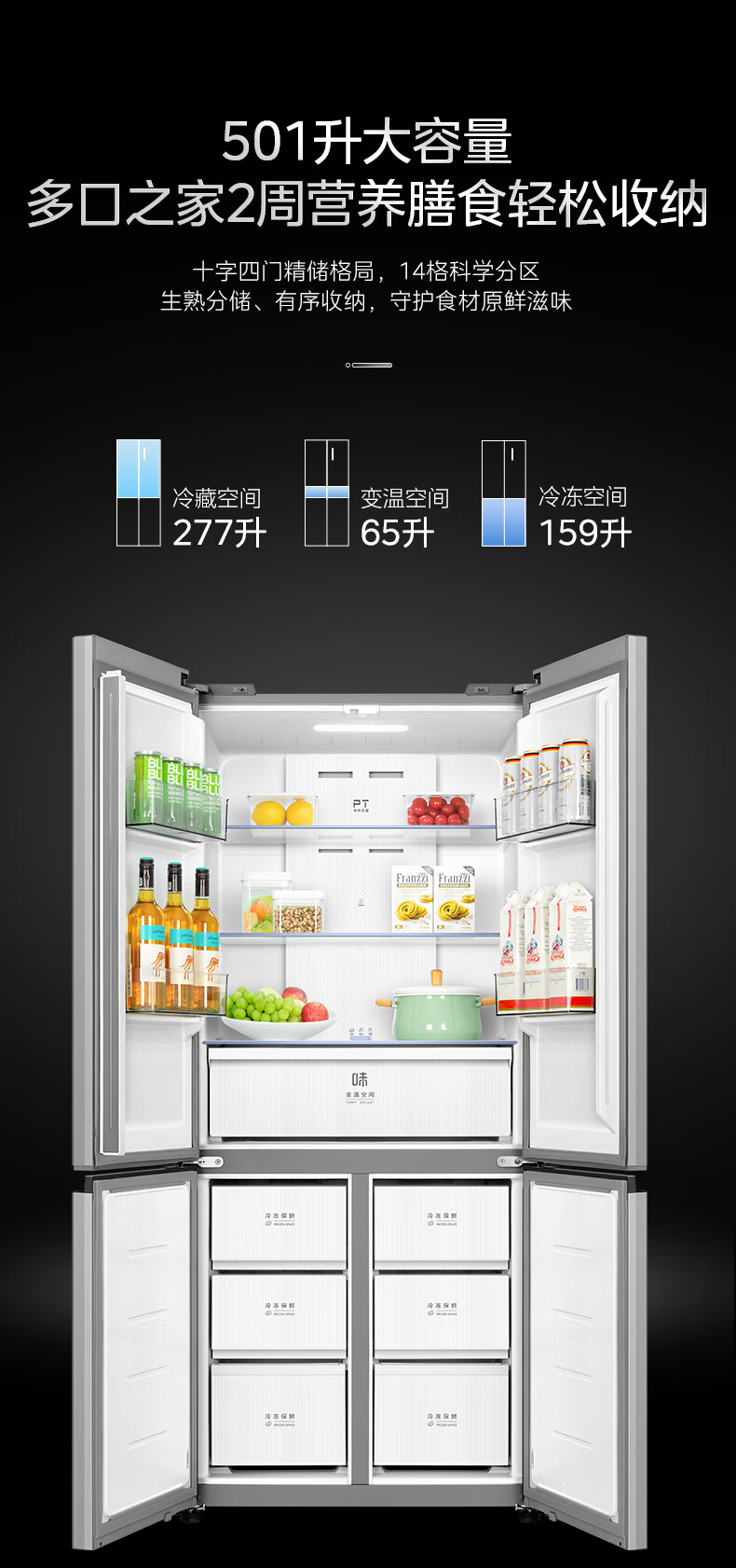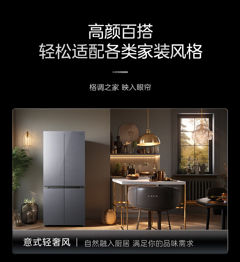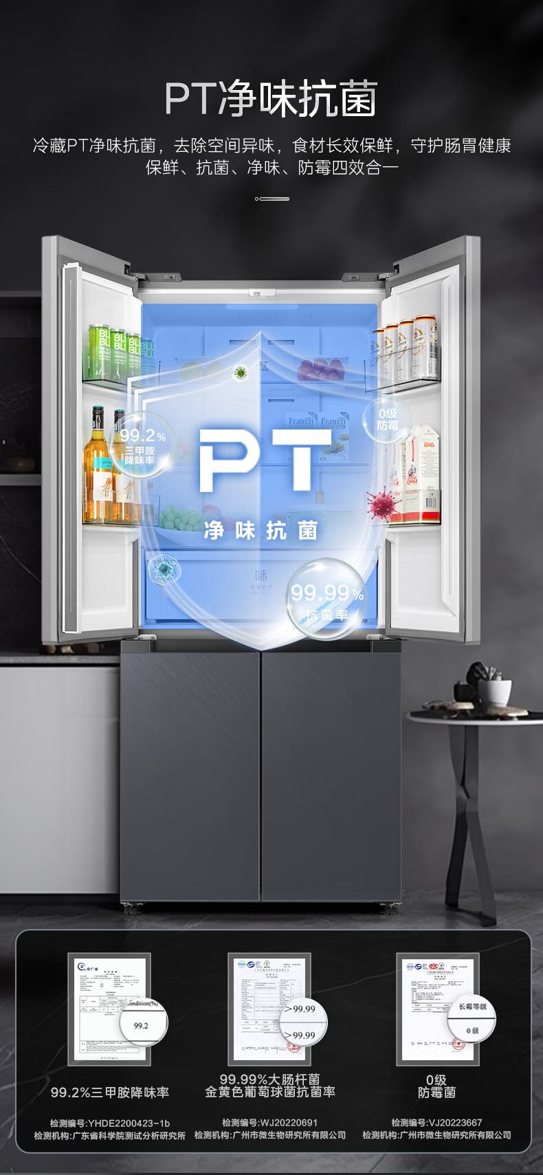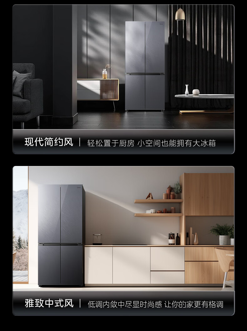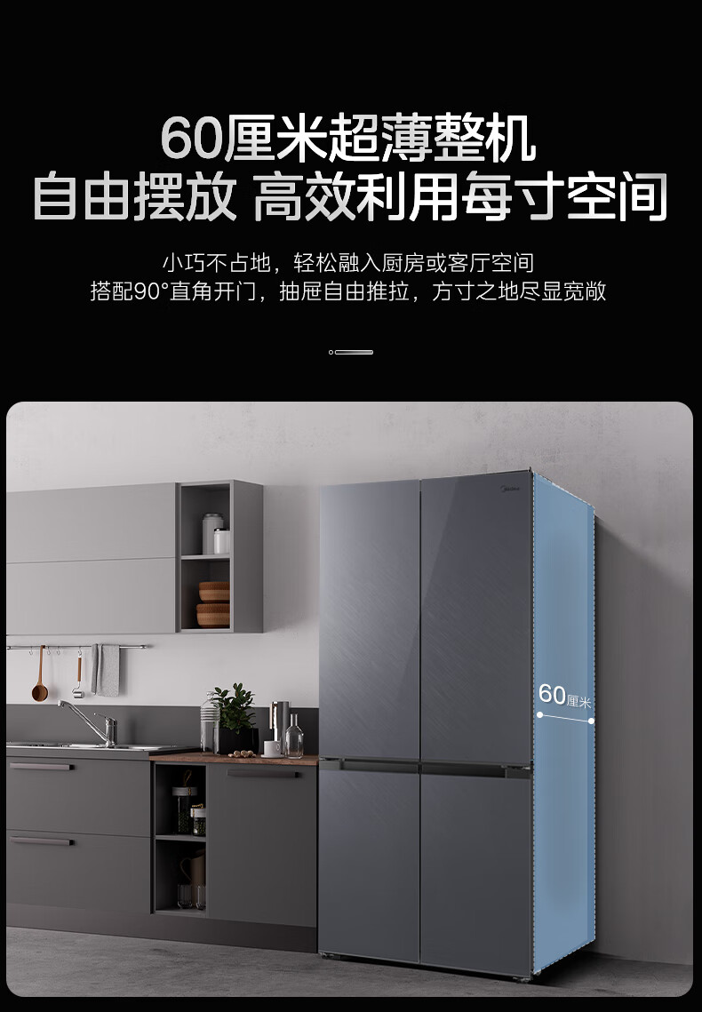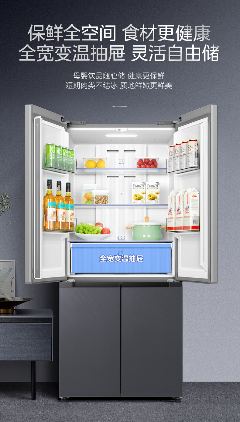 美的(Midea)501升 十字对开门冰箱 双变频一级 大容量净味 60厘米薄 三档变温 PT净味抗菌 全宽变温抽屉BCD-501WSGPM(E)流星黛-【玻璃面板】