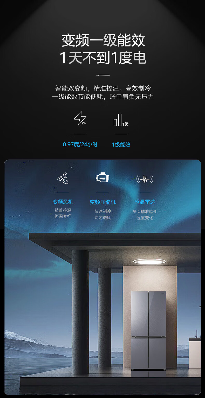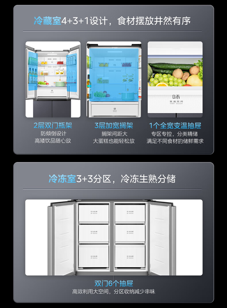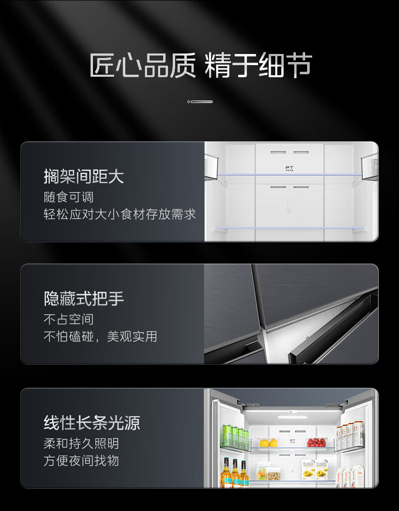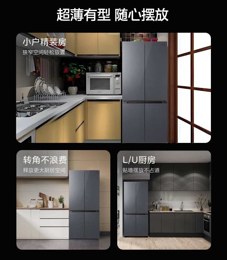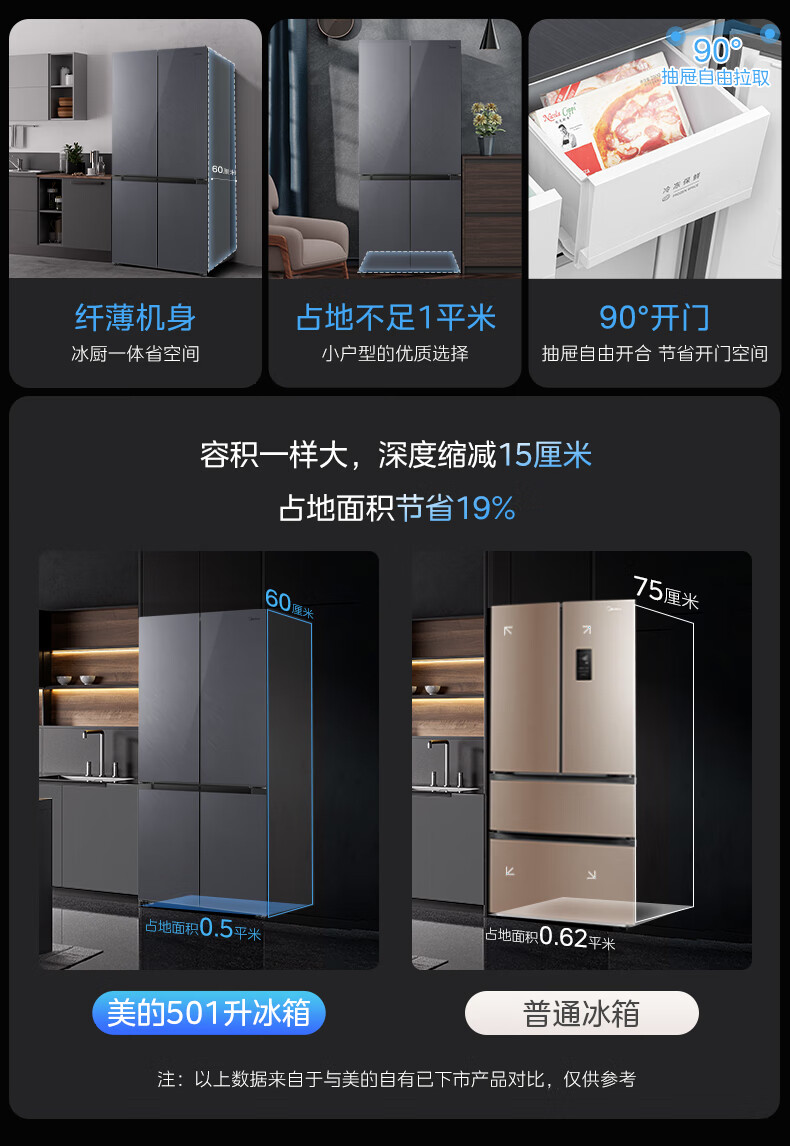 美的(Midea)501升 十字对开门冰箱 双变频一级 大容量净味 60厘米薄 三档变温 PT净味抗菌 全宽变温抽屉BCD-501WSGPM(E)流星黛-【玻璃面板】