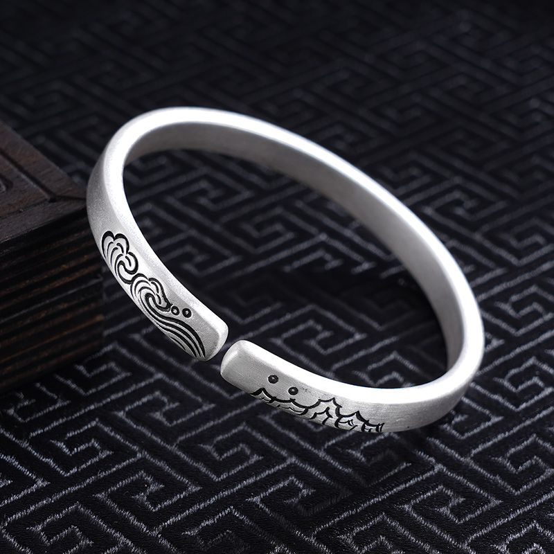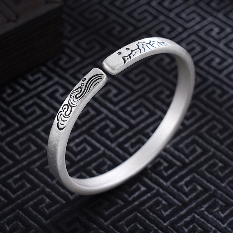 【寓意】:海誓山盟之约,坚如磐石之念,皆凝聚于这枚手镯之中。山海图案,神韵尽显;足银材质,历经千年。为她戴上此镯,便是许下了永恒的深情承诺。