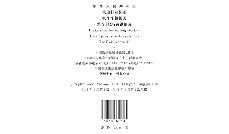 15113.5214 机车车辆闸瓦 第3部分:铸铁闸瓦(TB/T 3104.3-2017)
