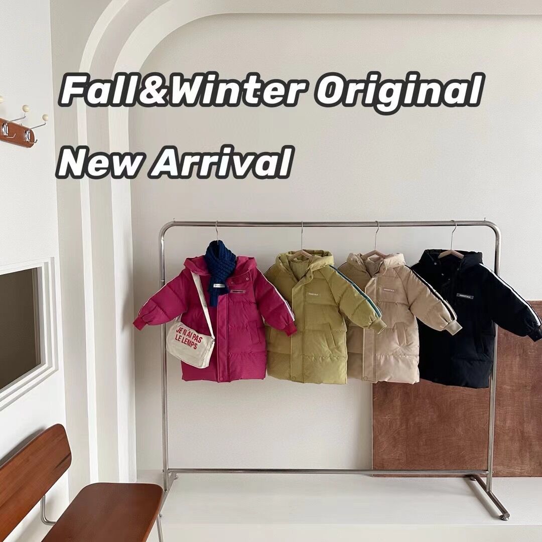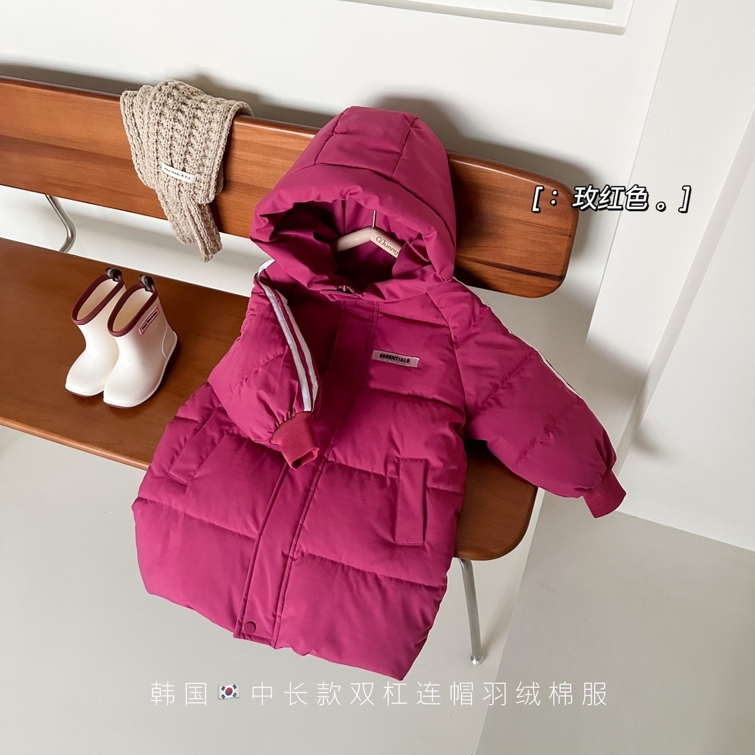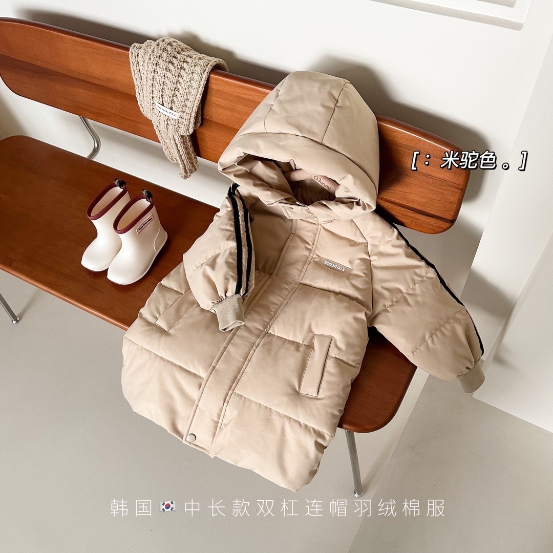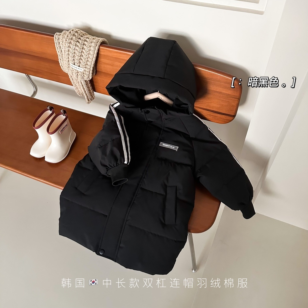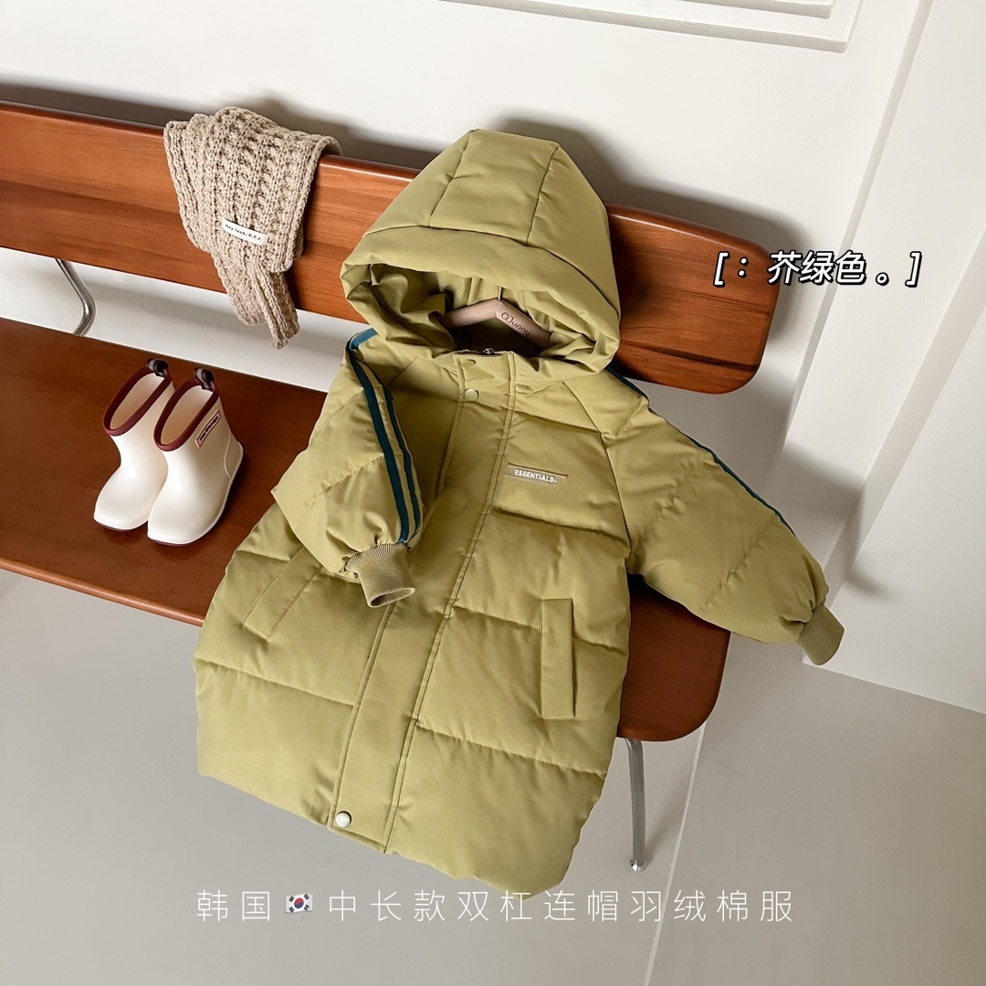 俊淳 反季清仓第一波!直接清仓干到底!一年碰不到的如此性价比!抢到血赚! 【韩国KR中长款连帽加厚羽绒棉服】 ✅设计属于潮酷韩风,还有撞色条纹设计 ✅面料是先进科技面料,非常好清洗,不仅挡风御寒还防水抗污。 ✅整件棉服手感软糯,加长加厚款,媲美羽绒服! yyds小宝宝穿起来洋气十足!!