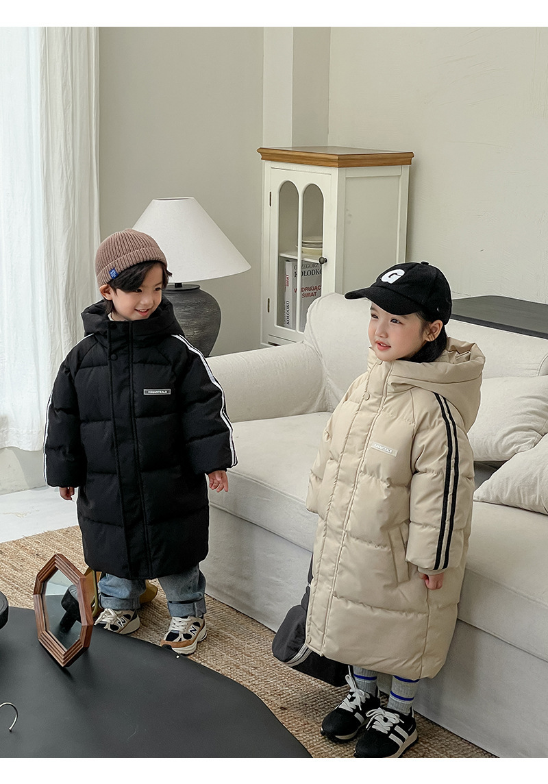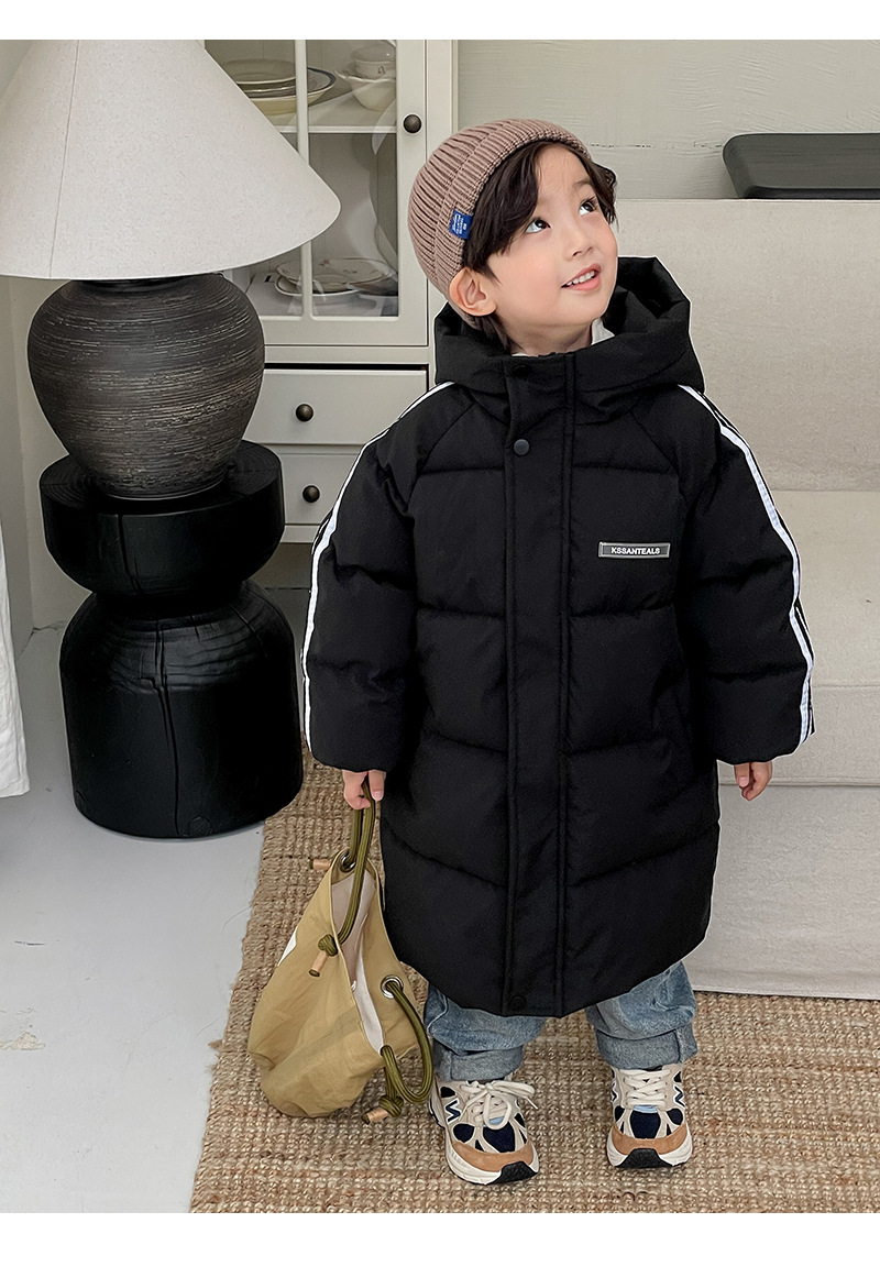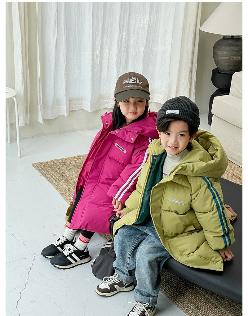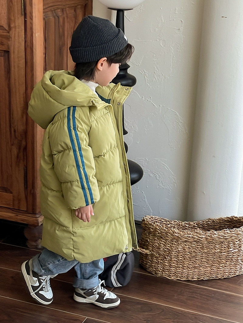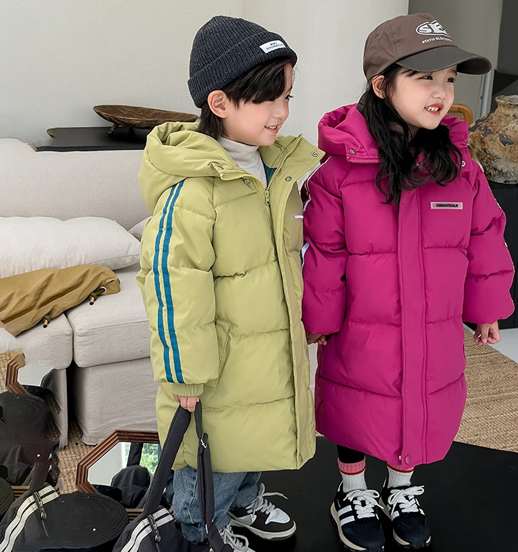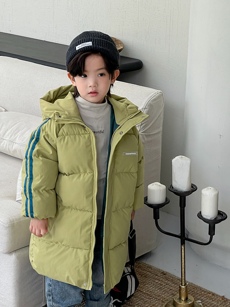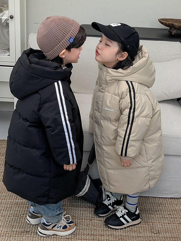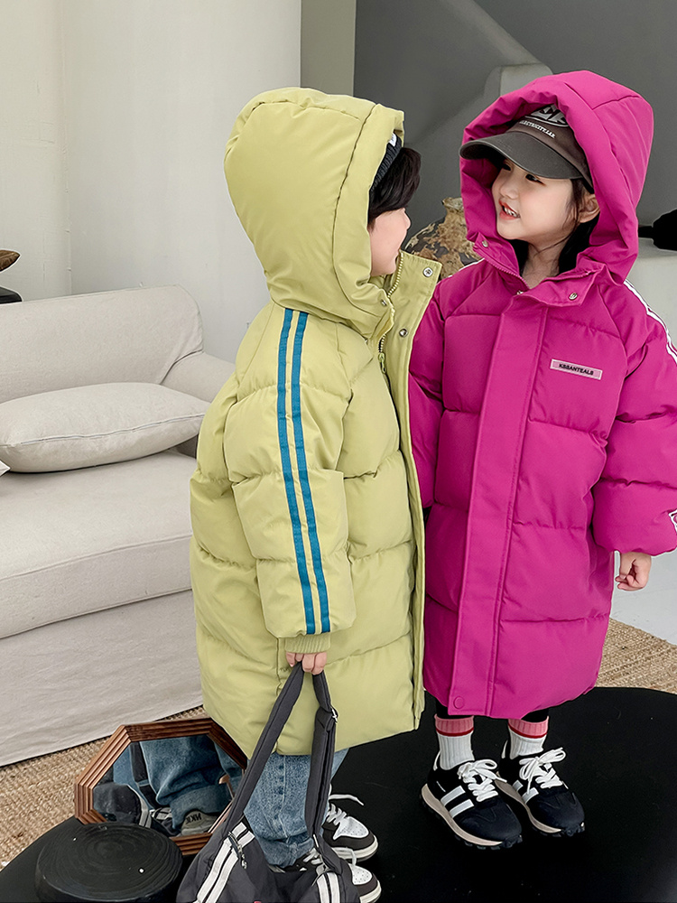 俊淳 反季清仓第一波!直接清仓干到底!一年碰不到的如此性价比!抢到血赚! 【韩国KR中长款连帽加厚羽绒棉服】 ✅设计属于潮酷韩风,还有撞色条纹设计 ✅面料是先进科技面料,非常好清洗,不仅挡风御寒还防水抗污。 ✅整件棉服手感软糯,加长加厚款,媲美羽绒服! yyds小宝宝穿起来洋气十足!!