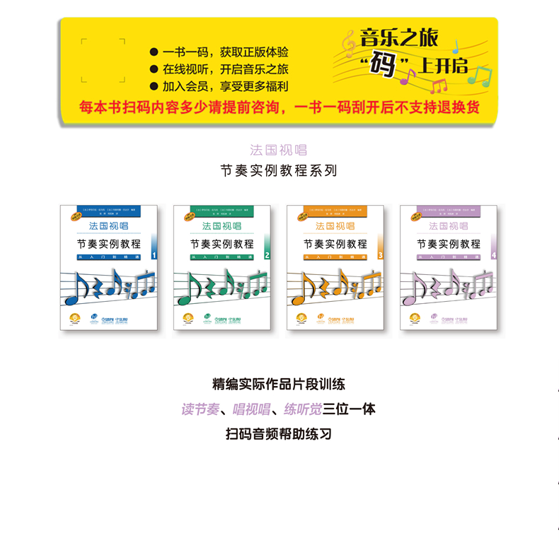 节奏训练是视唱练耳,也就是专业音乐教育必修课的一个重要组成部分,有着科学而系统的进阶过程。一本合适的教材可以帮助视唱练耳教师或者学生进行循序渐进的训练。近年来,在训练中运用实际音乐作品逐渐受到重视,顺应这一教学发展,上海音乐出版社引进出版了《法国视唱节奏实例教程——从入门到精通》系列(原版由法国雷蒙恩出版社出版,与雷卡视唱教程同源)。该系列一套四本,收入了各种体裁的声乐、器乐作品片段,第一册到第四册难度递增。每个片段附图示要点。每册包含30到40条谱例音频,可扫码听取,参考学习。