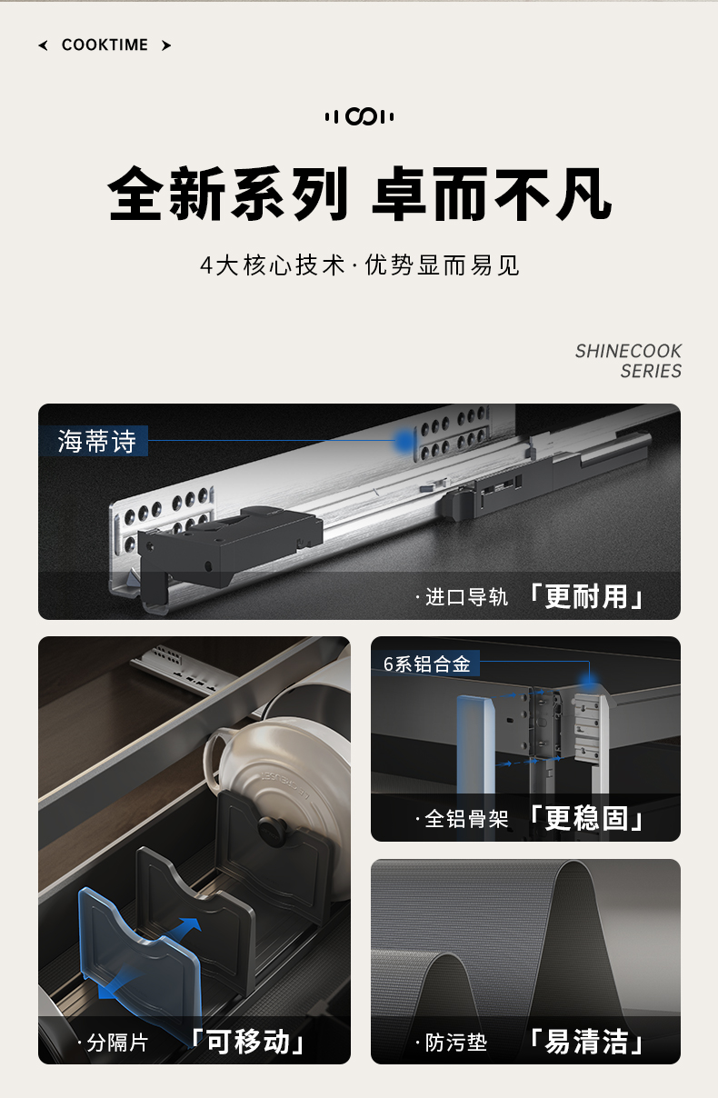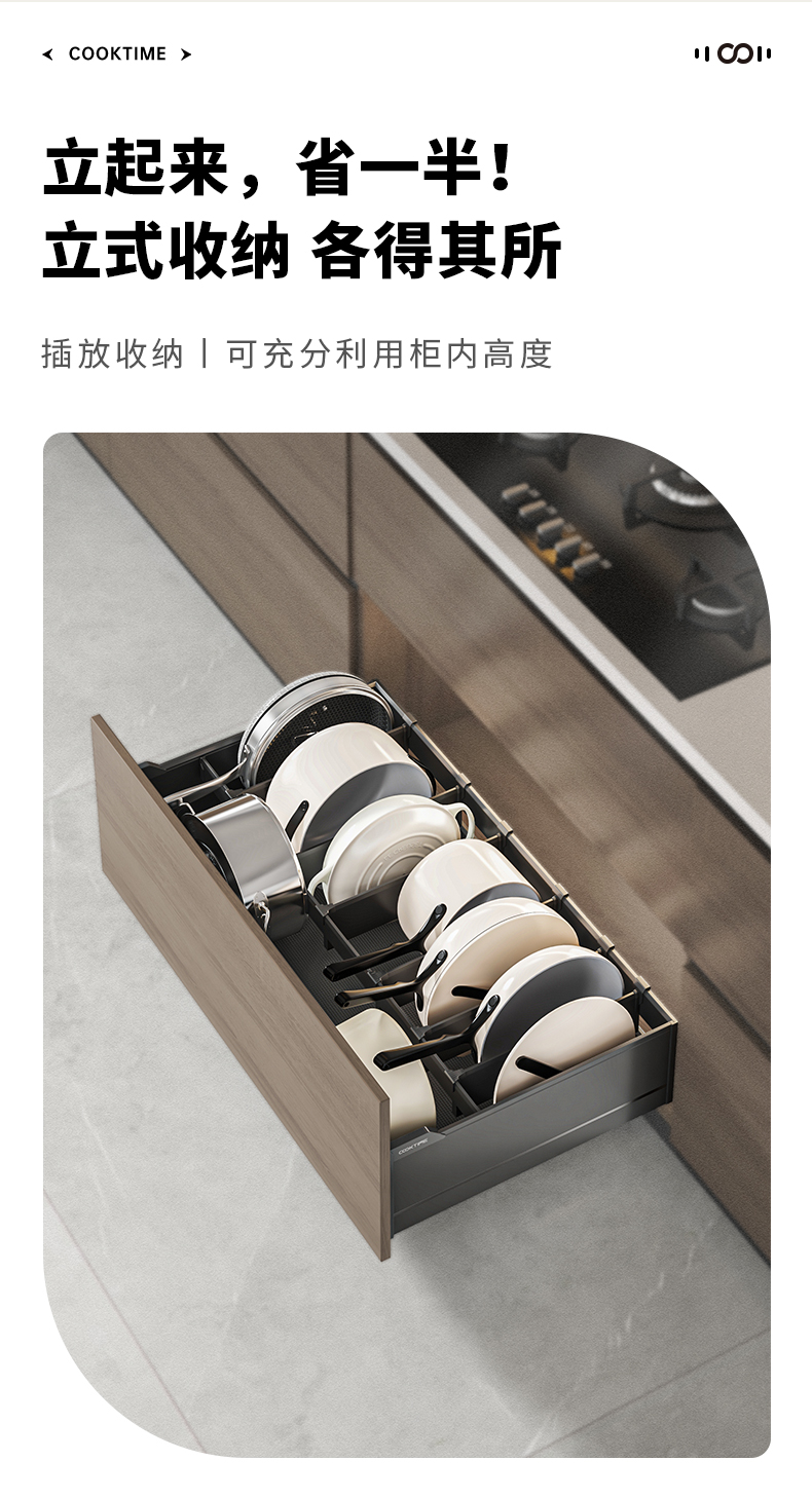 - 酷太坚持8年自主研发,已获得专利证书130项,拥有一套领先市场的厨房收纳系统,为千万中国家庭解决厨房脏乱差,缔造厨房新生活。