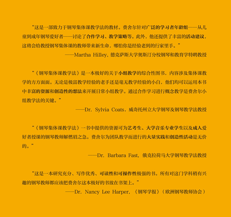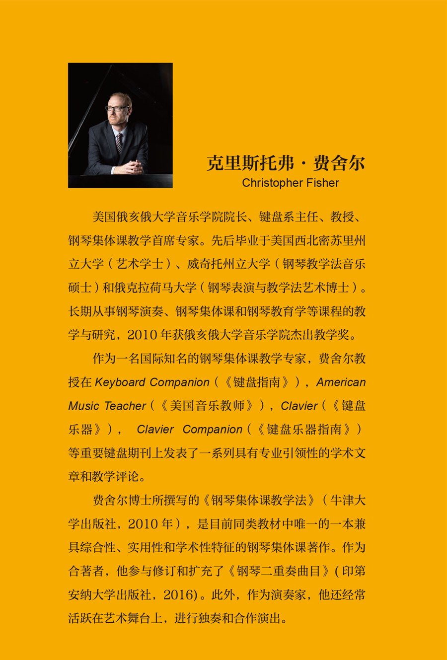 这本《钢琴集体课教学法》引进自牛津大学出版社,是目前国内外第一部也是唯一一部系统阐述钢琴集体课教学历史、学习理论、教学形式、教学策略、实践操作、教学对象与教学方法的著作。作者针对广泛的学习者年龄组——儿童、艺考生、大学生以及成人开展的钢琴集体课提供了合作学习的理论基础和科学的教学活动策略。