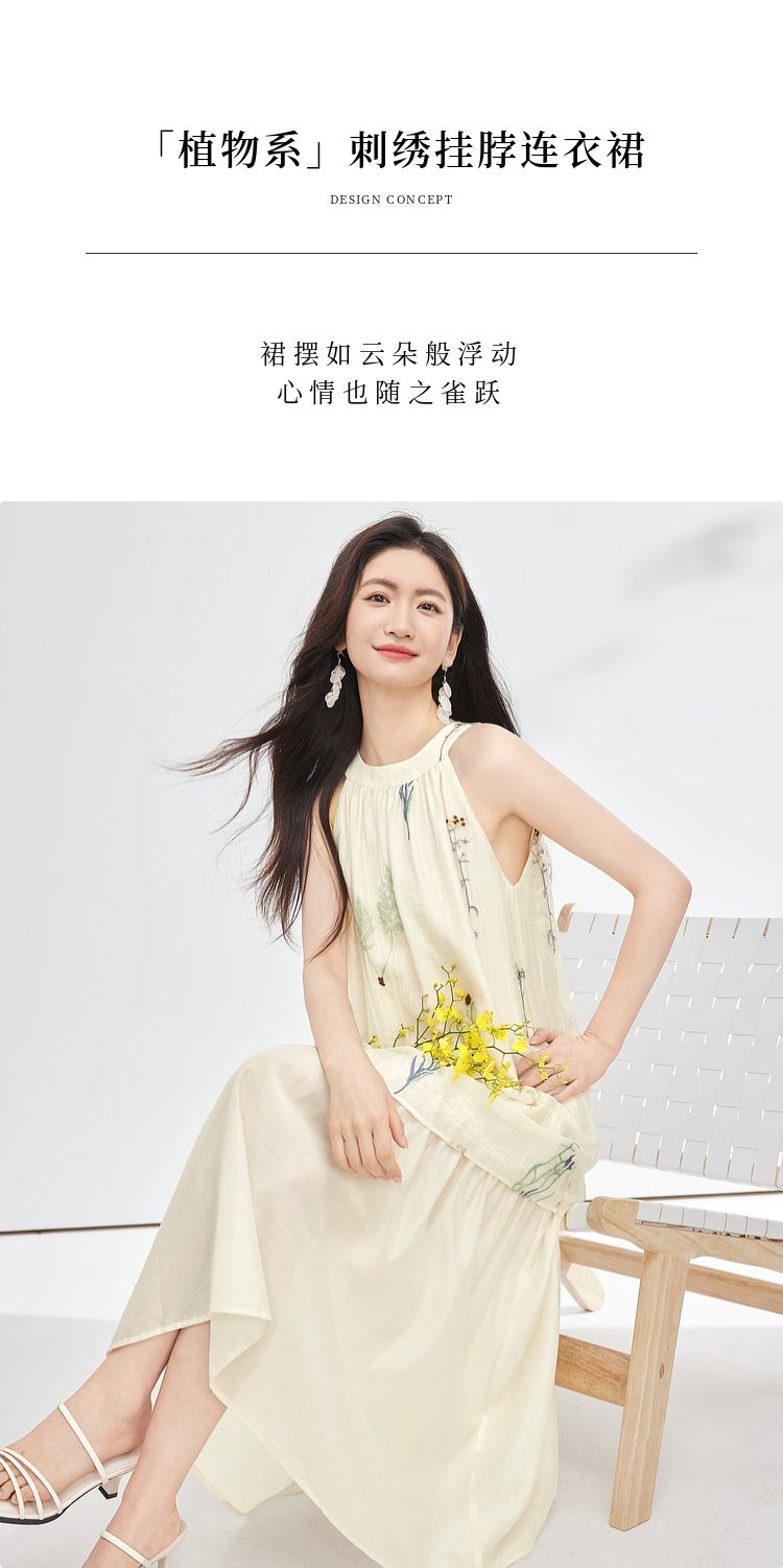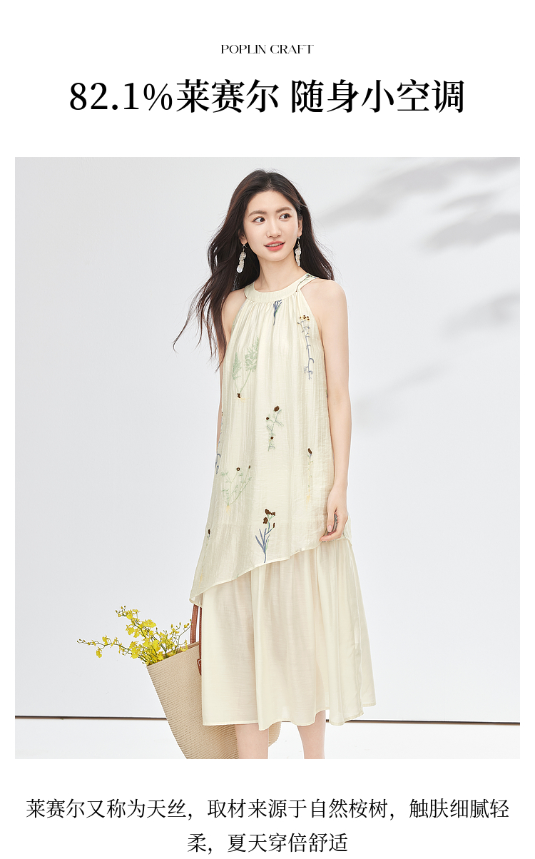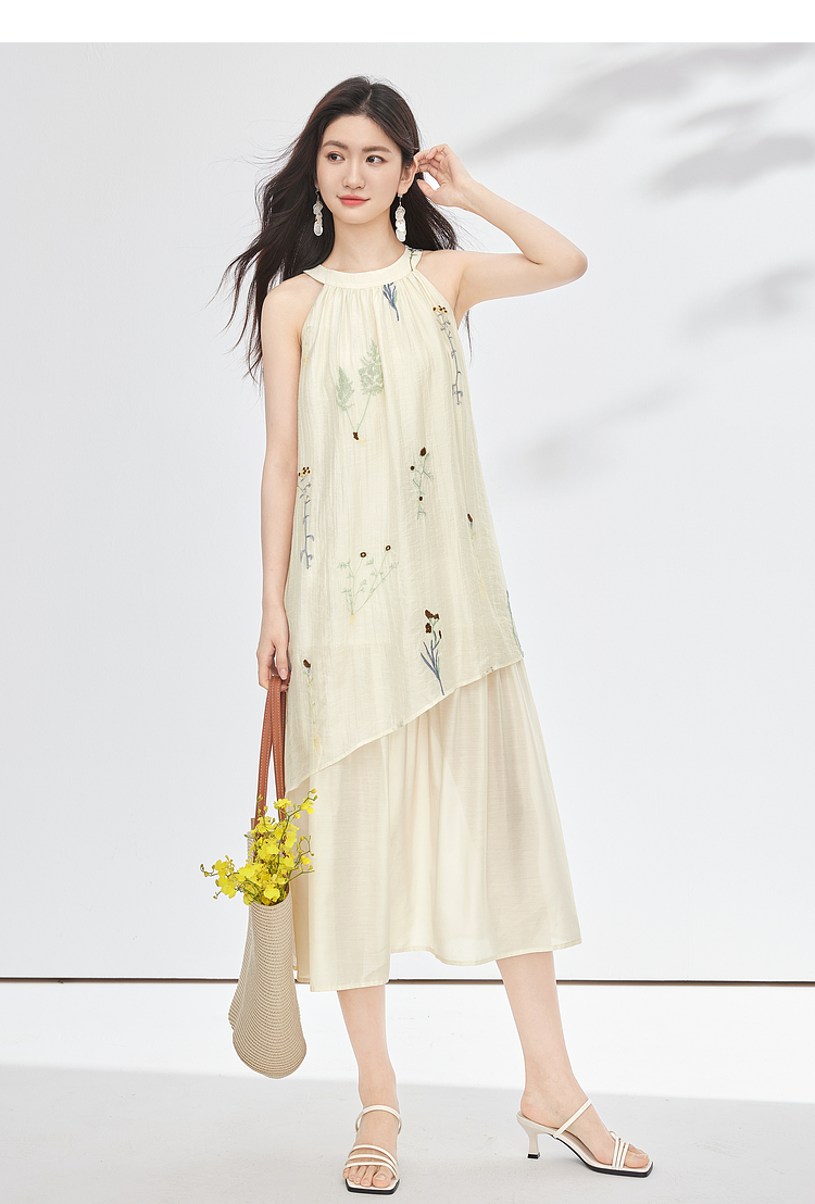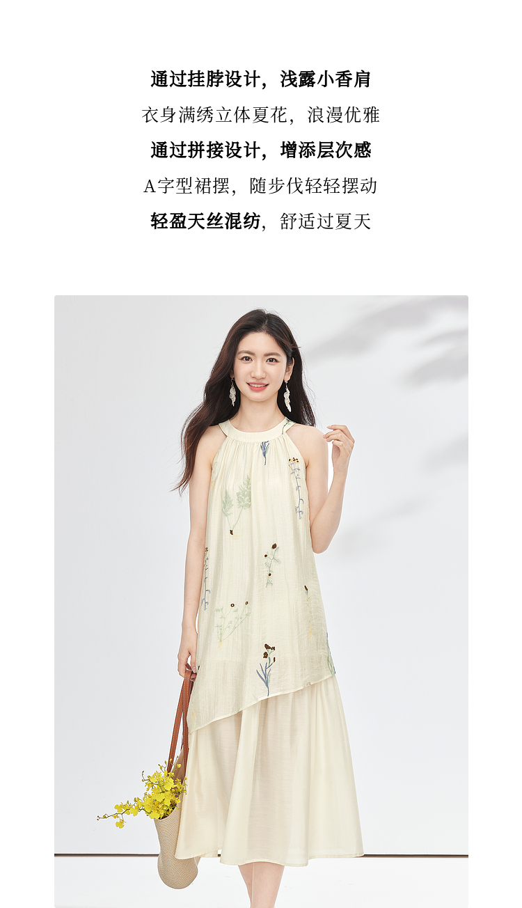 【专属特价】熙世界莱赛尔无袖挂脖连衣裙女夏季法式绝美假两件植物刺绣长裙子