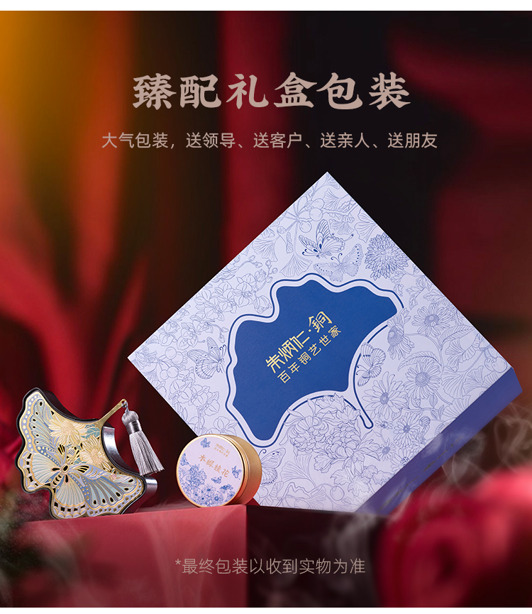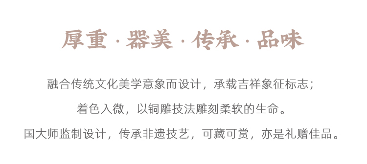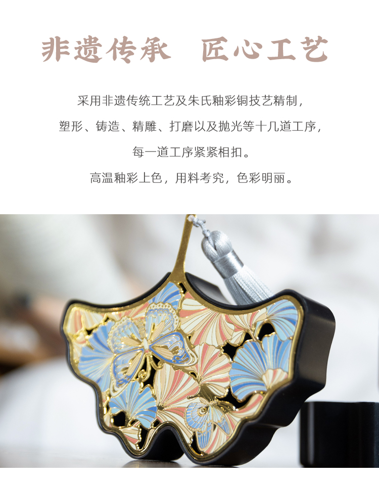 这个香盒采用非遗传统工艺及朱氏釉彩铜技艺精制,塑形、铸造、精雕、打磨及抛光等十几道工序,每一道工序紧紧紧扣。高温釉彩上色,用料考究,色彩明丽。