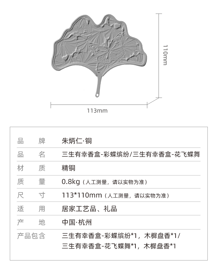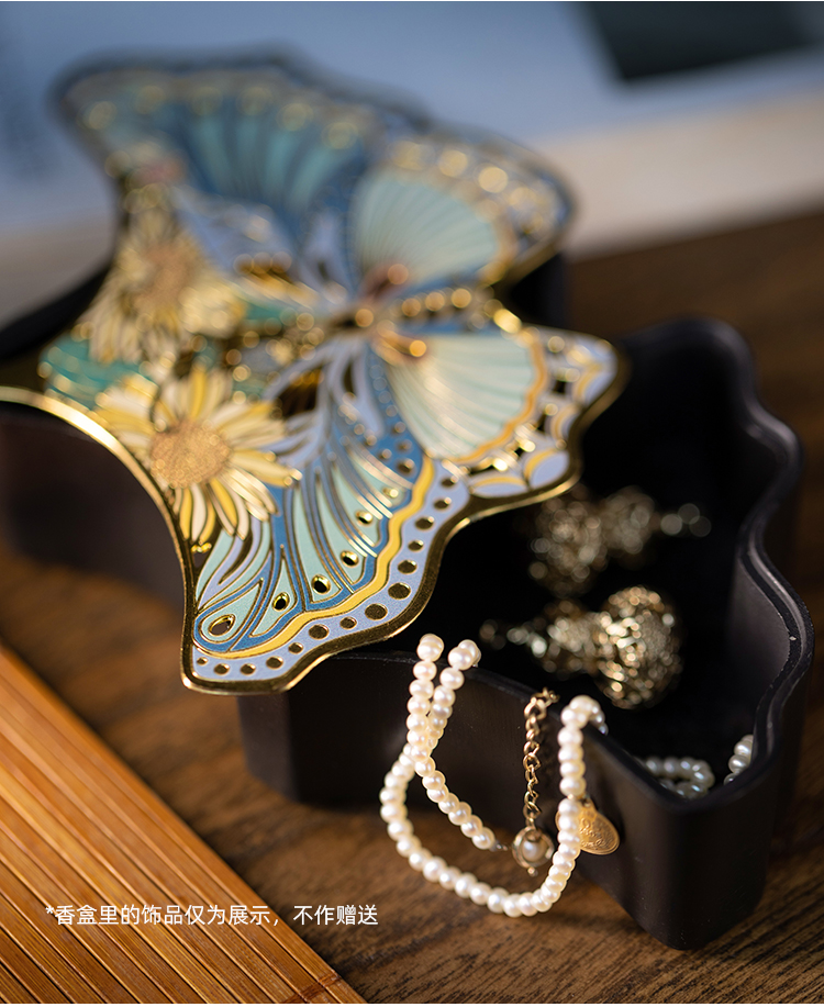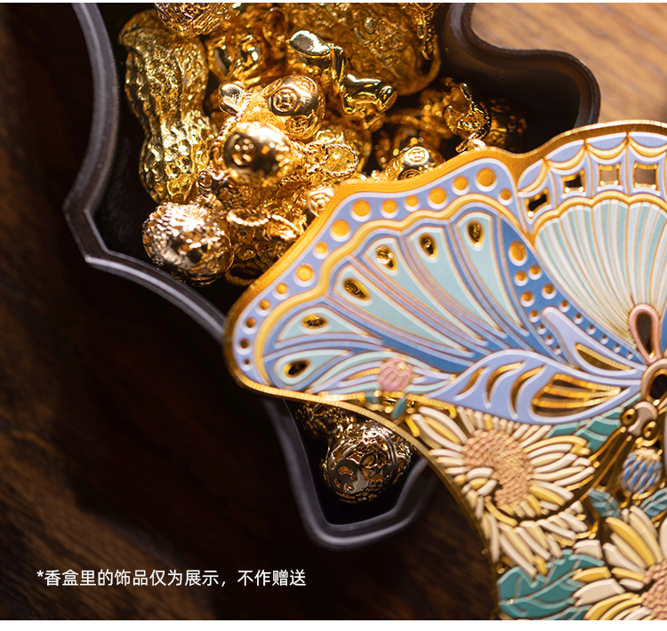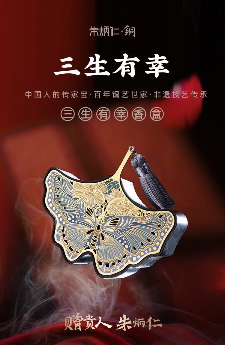 近日,朱炳仁·铜推出了两款三生有幸香盒,一款叫花飞蝶舞,一款叫蝶彩缤纷,分别选取了银杏和蝴蝶的元素。