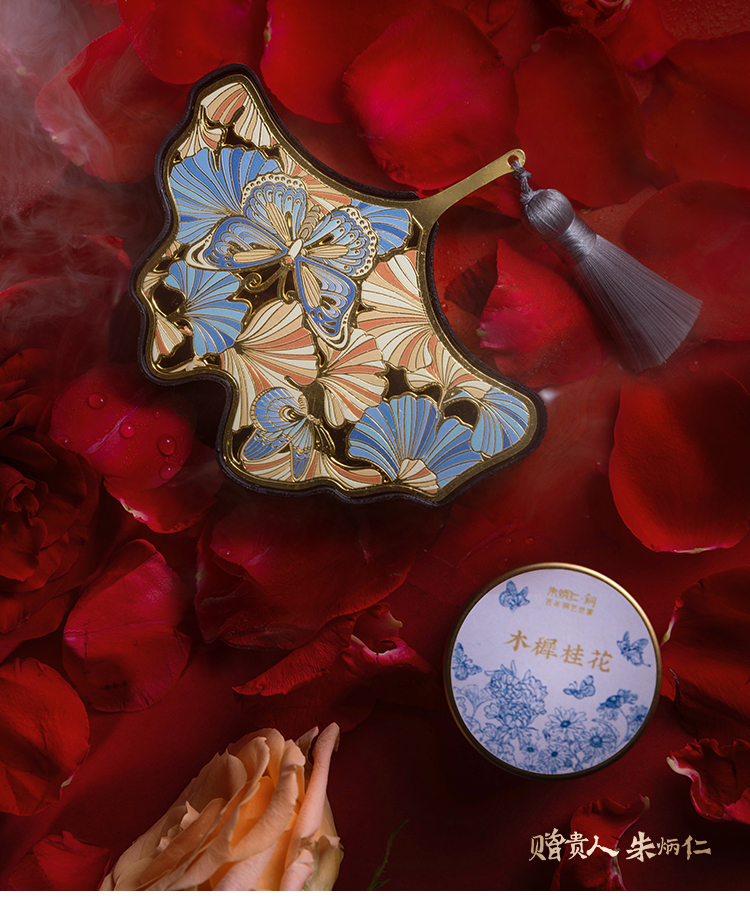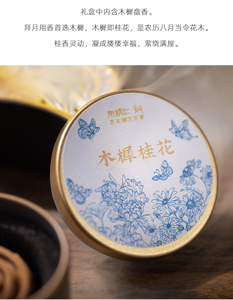 整个香盒,可以一物多用,作书签、香盒、收纳等妙用,内含木樨桂花盘香。木樨桂花盘香,木樨就是桂花,桂香灵动,凝成缕缕幸福,萦绕满屋。