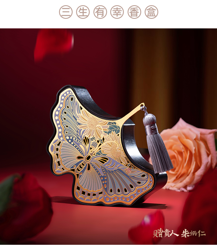 三生有幸香盒可用于熏香,也可用于存放首饰等心爱雅物。银杏叶并蒂双生,宛若一颗心,寓意百年好合,幸福相伴。