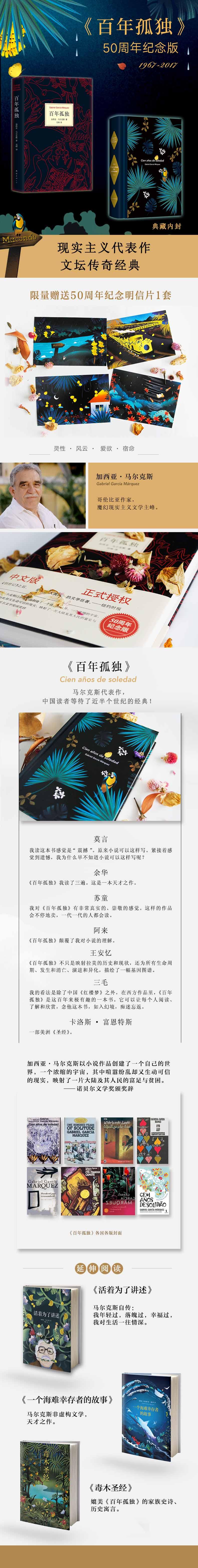 加西亚·马尔克斯著的《百年孤独》是魔幻现实主义文学的代表作,描写了布恩迪亚家族七代人的传奇故事,以及加勒比海沿岸小镇马孔多的百年兴衰,反映了拉丁美洲一个世纪以来风云变幻的历史。作品融入神话传说、民间故事、宗教典故等因素,巧妙地糅合了现实与虚幻,展现出一个瑰丽的想象世界,成为20世纪重要的经典文学巨著。