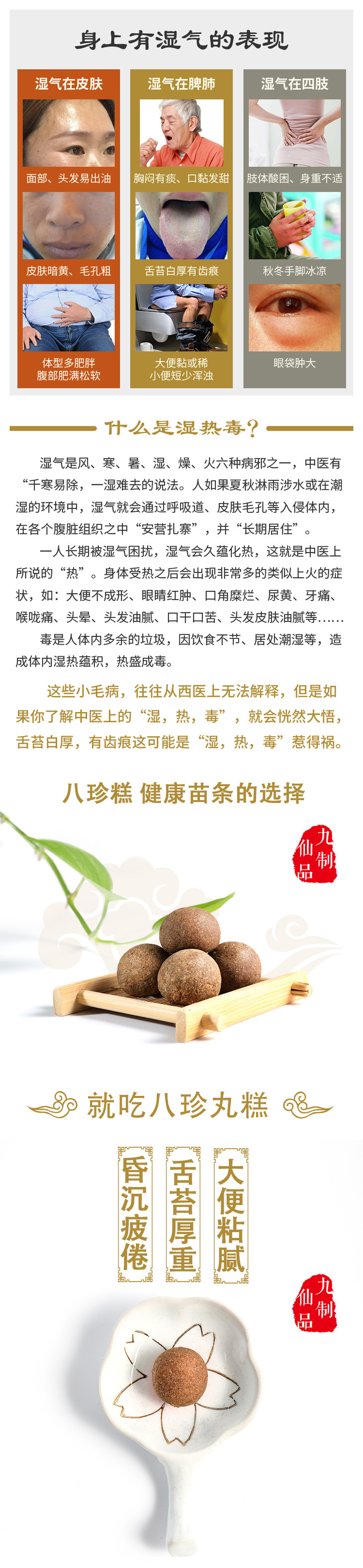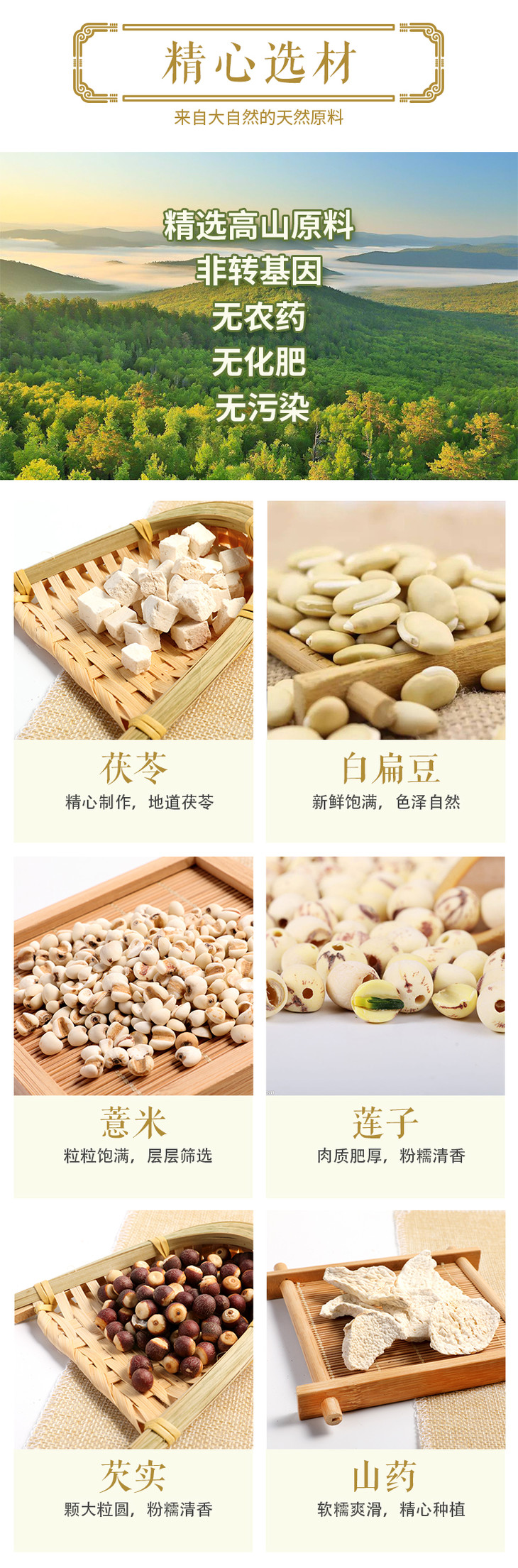 我们换了几次配方,几个月前又改进了配方和工艺,现在用人参,茯苓,芡实,扁豆,莲子,百合,薏米,怀山药,芡实,鸡内金,麦芽,谷芽,蜂蜜等十几种药食同源的食材通过柴火山泉水三蒸三晒,再人工搓丸,所以融合了天气,地气,人气,效果非常好!