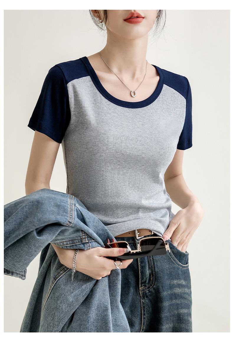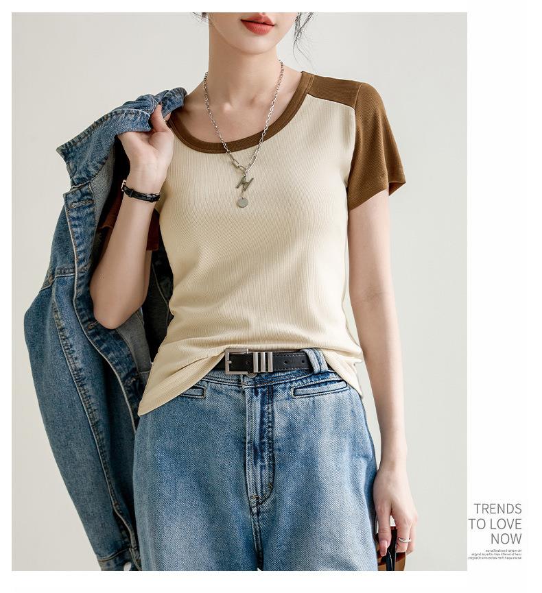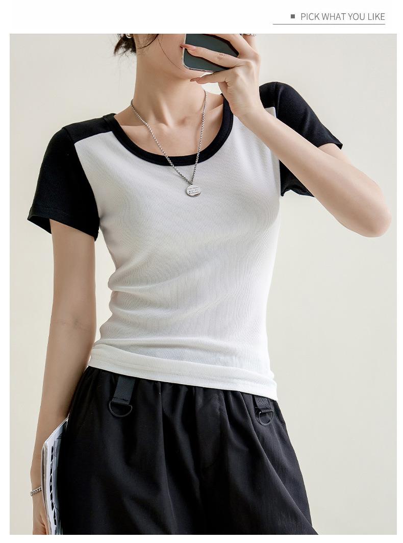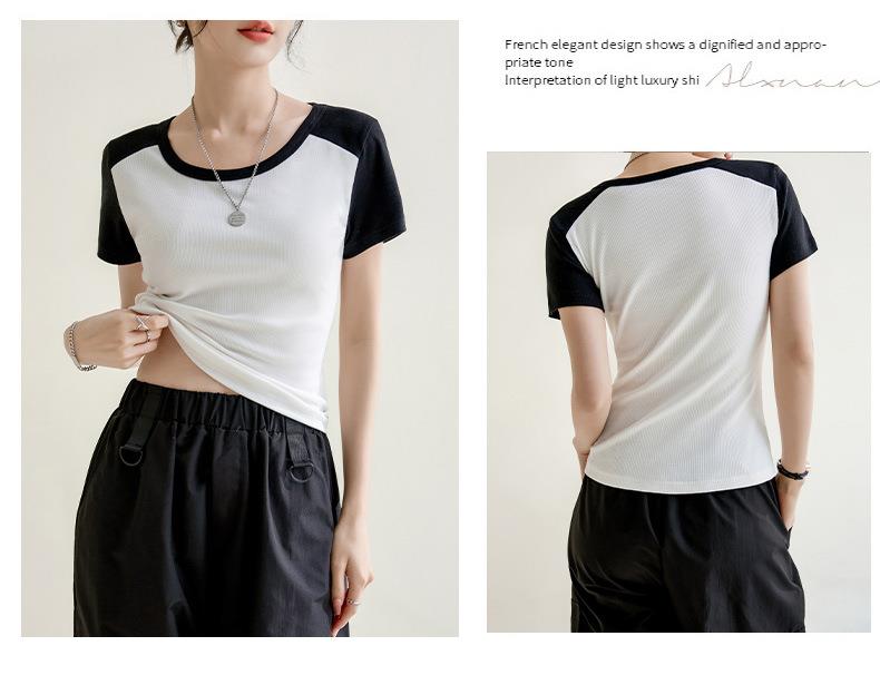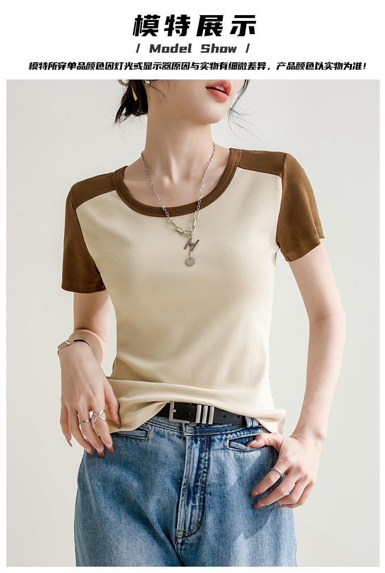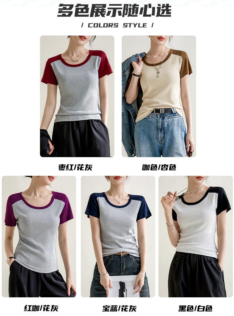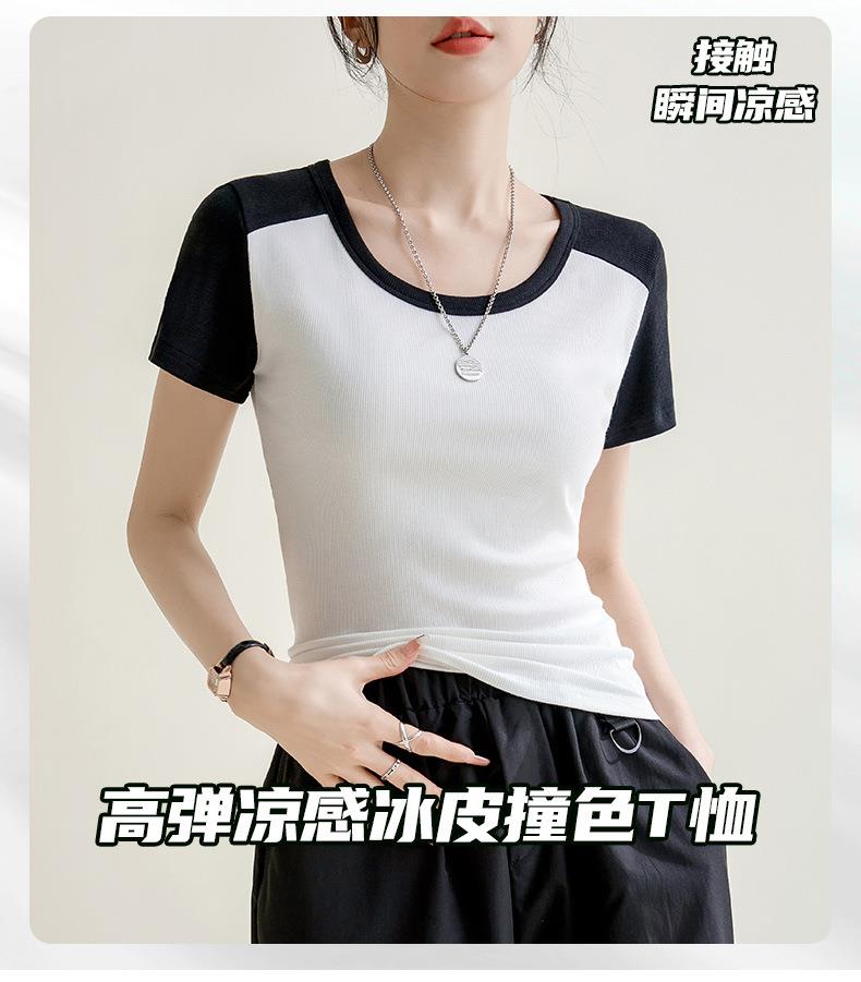 凉感螺纹撞色圆领修身棉T恤女2024春夏新款高弹内搭显瘦上衣