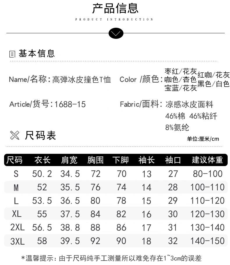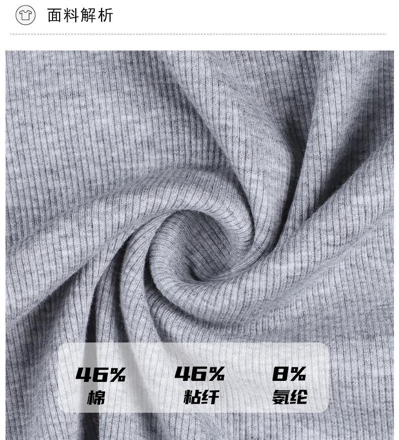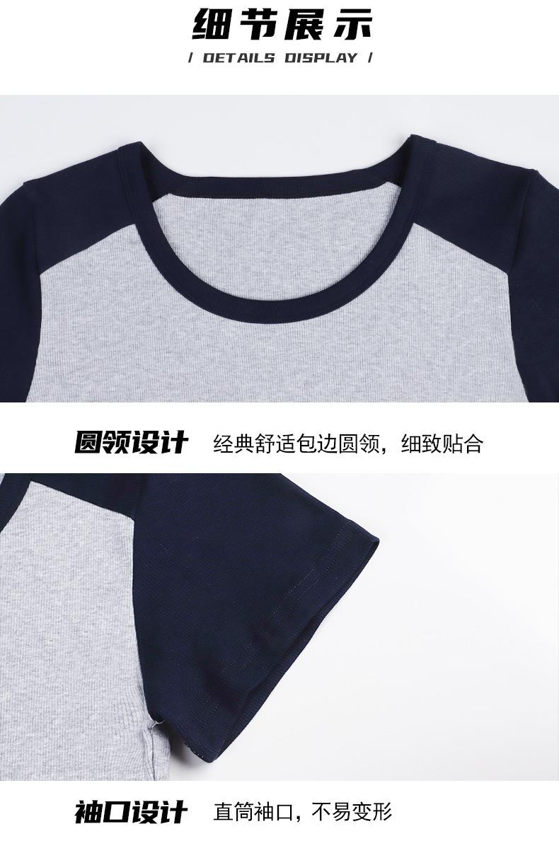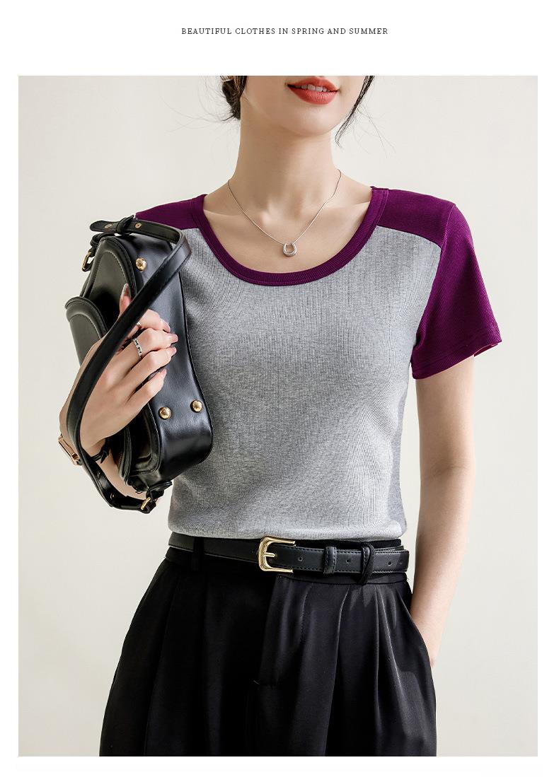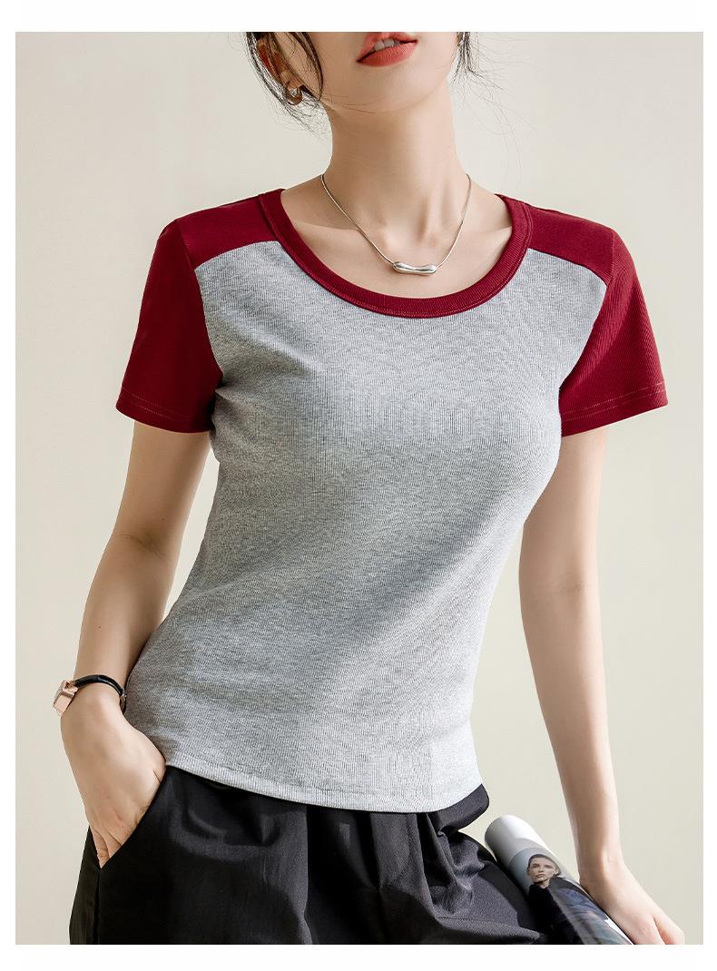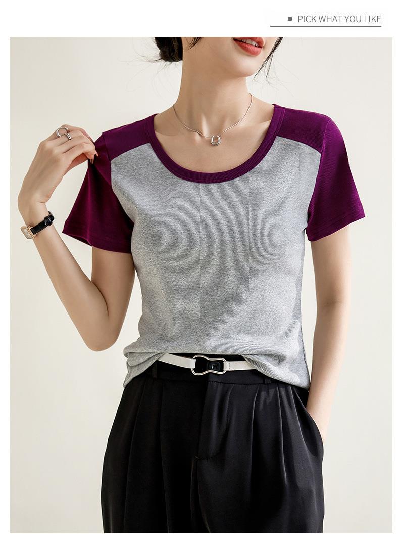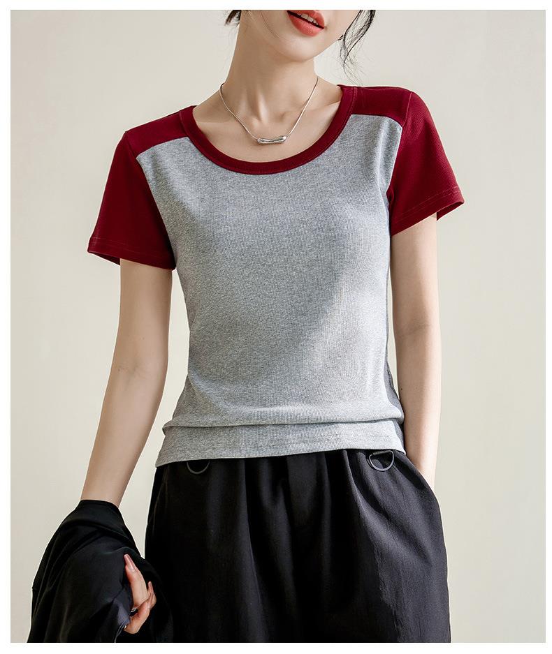 凉感螺纹撞色圆领修身棉T恤女2024春夏新款高弹内搭显瘦上衣