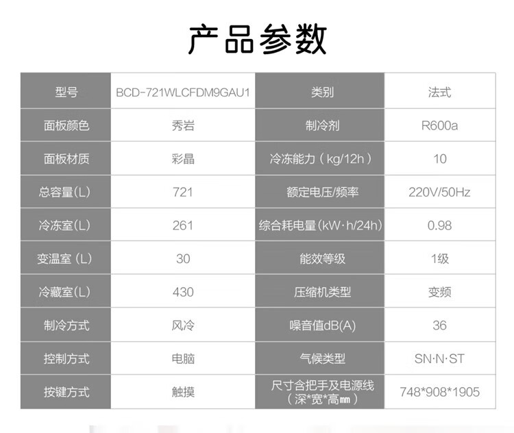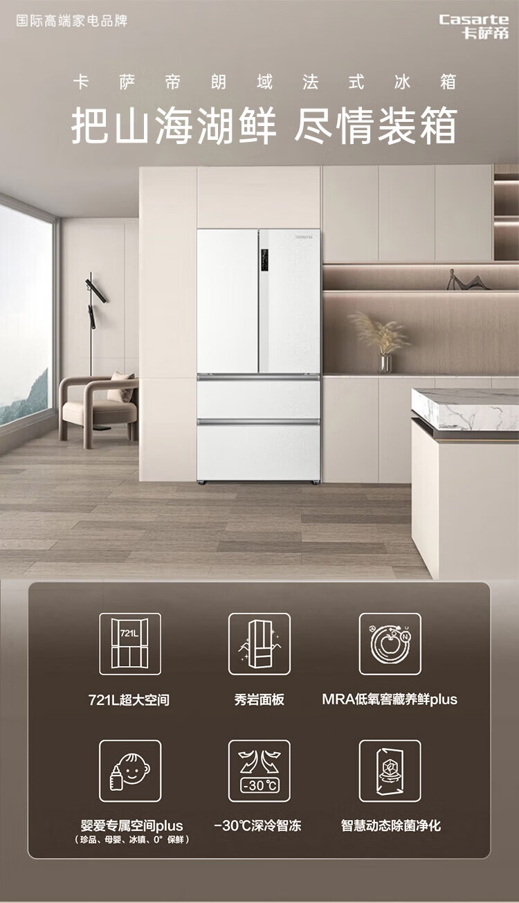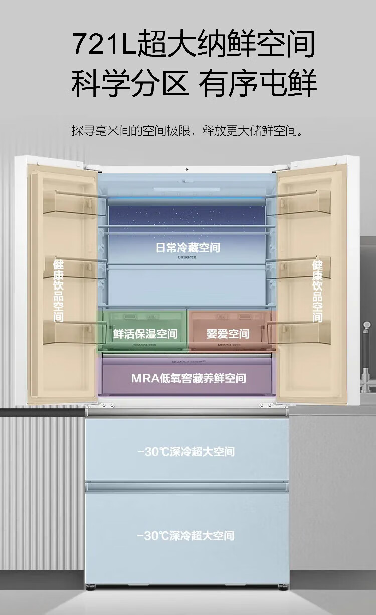 卡萨帝(Casarte)721升超大容量法式多门白色家用自由嵌入式冰箱双系统低氧窖藏养鲜秀岩面板系列 721升+独立双系统+MRA低氧窖藏+深冷智冻