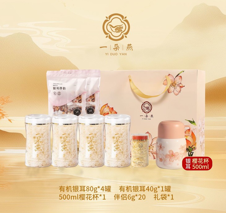【规格】组合一: 银耳80g*4罐+ 樱花杯500ml*1个+伴侣6g*10小包*2袋+礼袋1个(赠送40g*1罐银耳)