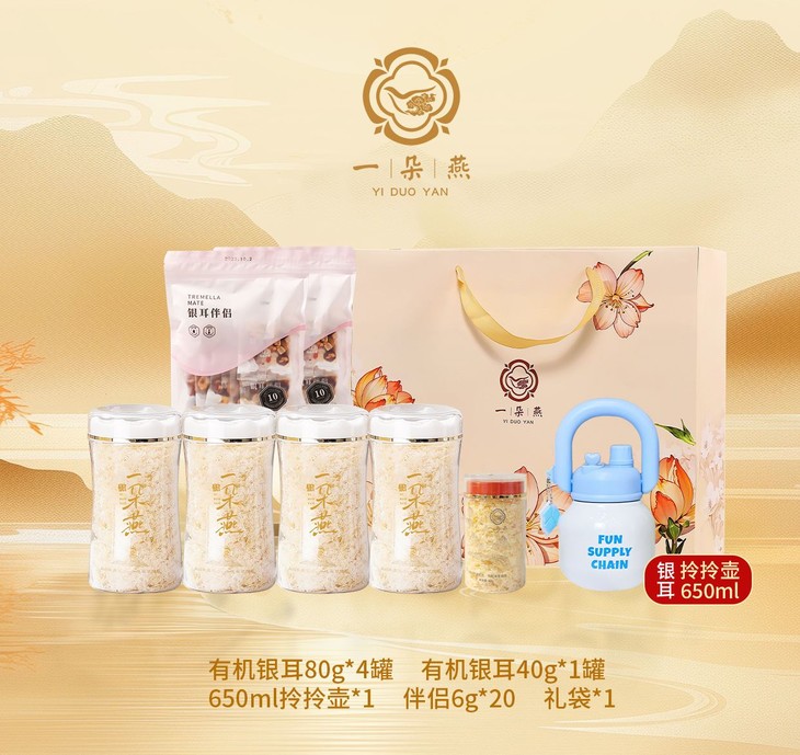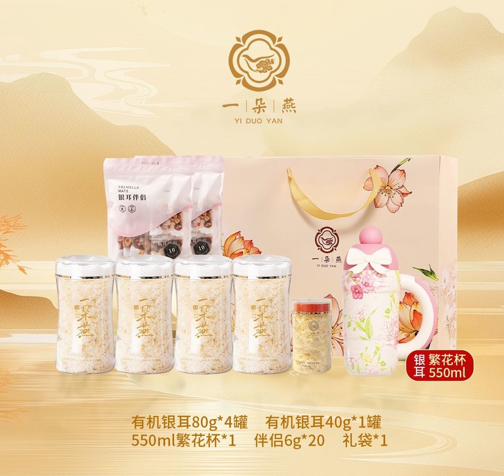 组合五: 银耳80g*4罐+繁花杯550ml*1个+伴侣6g*10小包*2袋+礼袋1个(赠送40g*1罐银耳)