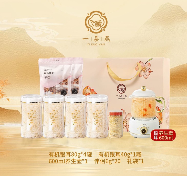 组合四: 银耳80g*4罐+养生壶600ml*1个+伴侣6g*10小包*2袋+礼袋1个(赠送40g*1罐银耳)