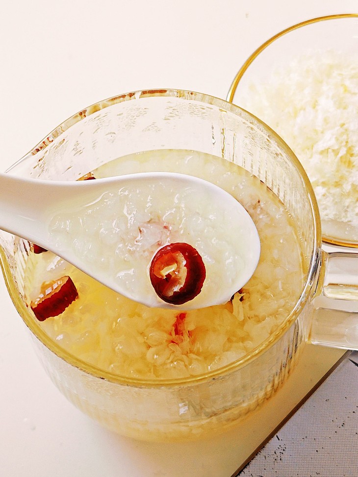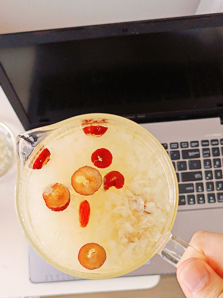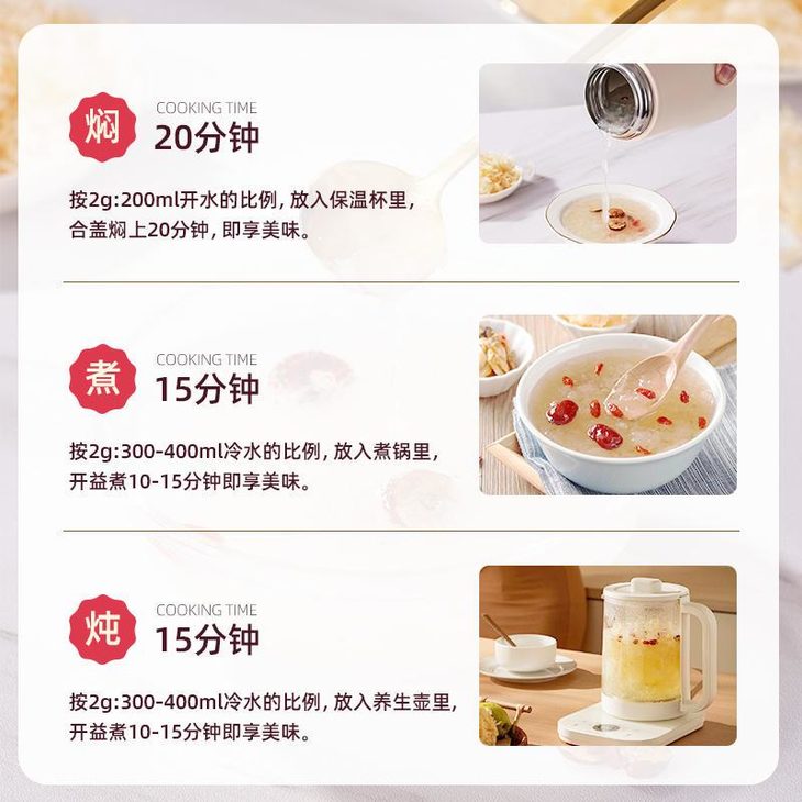 焖泡方法: 赠送的小勺子,舀4勺银耳到焖烧杯中,根 据个人口味加入冰糖,银耳伴侣。倒入100 度的开水,倒至9分满,焖泡20分钟即可食 用