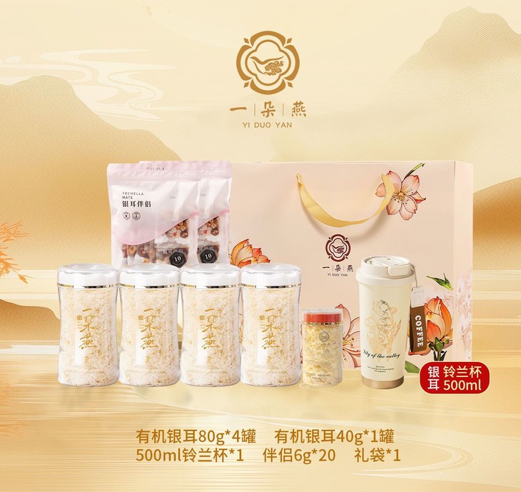 组合七: 银耳80g*4罐+铃兰杯500ml*1个+伴侣6g*10小包*2袋+礼袋1个(赠送40g*1罐银耳)