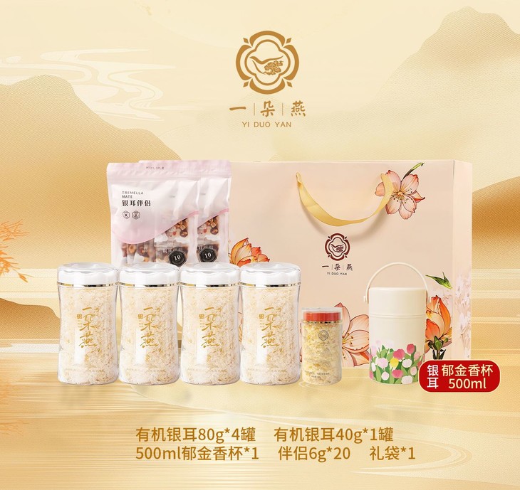 组合三:银耳80g*4罐+ 郁金香500ml*1个+伴侣6g*10小包*2袋+礼袋1个(赠送40g*1罐银耳)