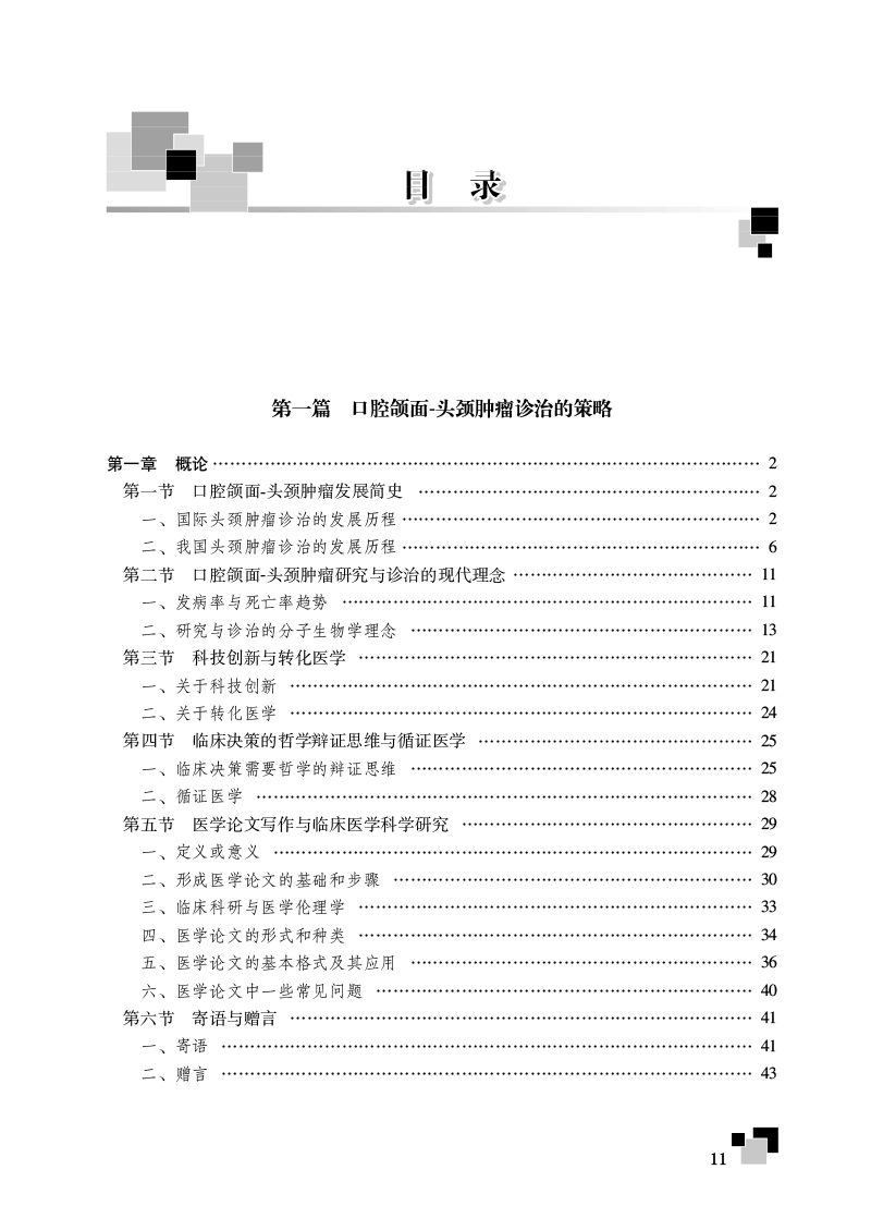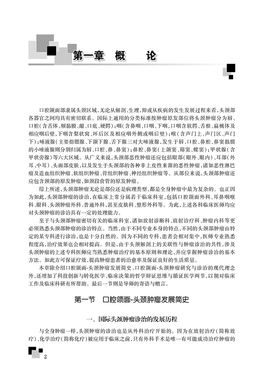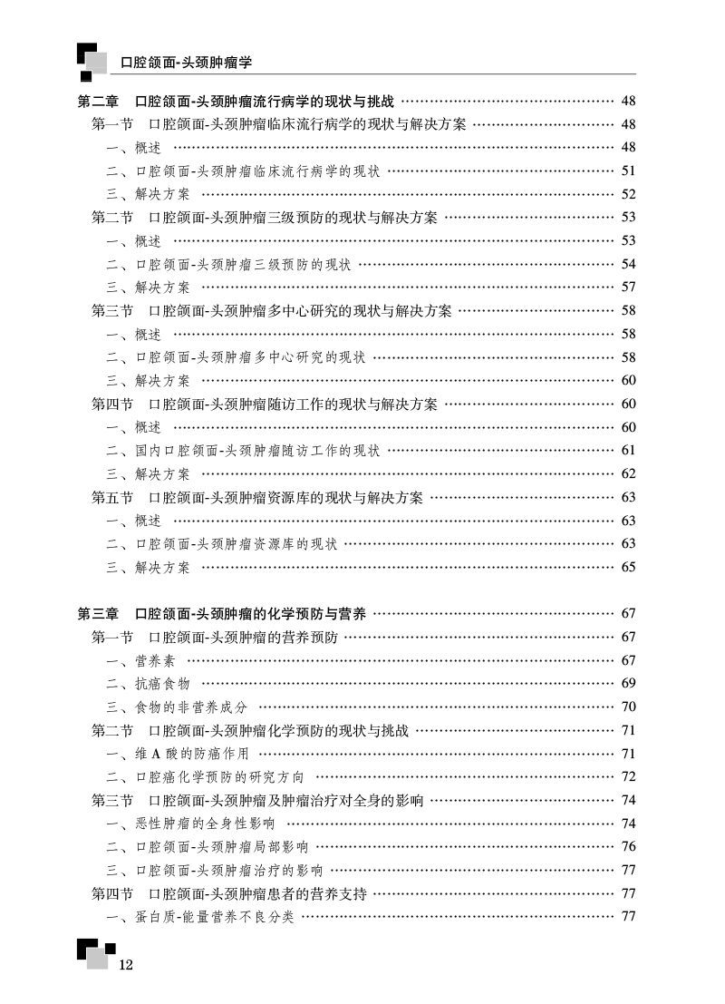 第一篇口腔颌面-头颈肿瘤诊治的策略 第一章概论 第一节口腔颌面-头颈肿瘤发展简史 一、国际头颈肿瘤诊治的发展历程, 二、我国头颈肿瘤诊治的发展历程, 第二节口腔颌面-头颈肿瘤研究与诊治的现代理念 一、发病率与死亡率趋势 二、研究与诊治的分子生物学理念 第三节科技创新与转化医学 一、关于科技创新 二、关于转化医学 第四节临床决策的哲学辩证思维与循证医学 一、临床决策需要哲学的辩证思维 二、循证医学 第五节医学论文写作与临床医学科学研究 一、定义或意义 二、形成医学论文的基础和步骤 三、临床科研与医学伦理学 四、医学论文的形式和种类 五、医学论文的基本格式及其应用 六、医学论文中一些常见问题 第六节寄语与赠言 一、寄语 二、赠言 第二章口腔颌面/头颈肿瘤流行病学的现状与挑战 第一节口腔颌面-头颈肿瘤临床流行病学的现状与解决方案 一、概述 二、口腔颌面-头颈肿瘤临床流行病学的现状 三、解决方案 第二节口腔颌面-头颈肿瘤三级预防的现状与解决方案 一、概述 二、口腔颌面-头颈肿瘤三级预防的现状 三、解决方案 第三节口腔颌面-头颈肿瘤多中心研究的现状与解决方案 一、概述 二、口腔颌面-头颈肿瘤多中心研究的现状 三、解决方案 第四节口腔颌面-头颈肿瘤随访工作的现状与解决方案 一、概述 二、国内口腔颌面-头颈肿瘤随访工作的现状 三、解决方案 第五节口腔颌面-头颈肿瘤资源库的现状与解决方案 一、概述 二、口腔颌面-头颈肿瘤资源库的现状 三、解决方案 第三章口腔颌面/头颈肿瘤的化学预防与营养 第一节口腔颌面-头颈肿瘤的营养预防 一、营养素 二、抗癌食物 三、食物的非营养成分 第二节口腔颌面-头颈肿瘤化学预防的现状与挑战 一、维A酸的防癌作用 二、口腔癌化学预防的研究方向 第三节口腔颌面-头颈肿瘤及肿瘤治疗对全身的影响 一、恶性肿瘤的全身性影响 二、口腔颌面-头颈肿瘤局部影响 三、口腔颌面-头颈肿瘤治疗的影响 第四节口腔颌面-头颈肿瘤患者的营养支持 一、蛋白质-能量营养不良分类 二、营养状况评价方法 三、营养支持 第五节营养支持手段干预肿瘤生长 一、缺乏甲硫氨酸的不平衡氨基酸 二、精氨酸的应用 三、谷氨酰胺及其抑制剂的应用 第四章多学科综合序列治疗与个体化治疗 第一节概述 一、多学科综合序列治疗的含义 二、多学科综合序列治疗的形成 三、多学科综合序列治疗的原则 第二节多学科综合序列治疗的模式 一、以治疗方法为依据的治疗模式 二、以肿瘤生物学为依据的综合治疗模式 第三节口腔颌面-头颈肿瘤的个体化治疗 一、个体化治疗的含义 二、个体化治疗方案制订的依据 三、个体化治疗方案的实施 四、小结与展望 第五章口腔颌面/头颈肿瘤外科治疗的现状与挑战 第一节功能性外科在口腔颌面肿瘤治疗中的应用 一、功能性外科的概念和发展历史 二、功能性外科的目的和原则 三、功能性外科在头颈肿瘤领域的应用与发展 第二节显微外科技术在口腔颌面肿瘤治疗中的应用 一、显微外科的概念与原则 二、显微外科技术在口腔颌面-头颈肿瘤外科的应用现状 第三节口腔颌面-头颈肿瘤的微创手术治疗 第四节口腔颌面-头颈肿瘤的救治外科 一、救治外科的概念 二、救治外科在口腔颌面-头颈肿瘤外科的应用现状 第六章口腔颌面/头颈肿瘤内科治疗的现状与挑战 第一节口腔颌面-头颈肿瘤内科学的建立及内涵 口腔颌面/头颈肿瘤学 一、化学治疗的过去、现在和未来 二、化学治疗的原则和常见肿瘤的化疗方案 三、个体化方案的选择 四、严重不良反应的预防和处理 五、化疗联合放疗的进展 第三节口腔颌面-头颈肿瘤生物治疗的现状和展望 一、靶向治疗 二、基因治疗 三、中医中药治疗 第四节口腔颌面-头颈肿瘤冷冻及加热治疗 一、冷冻治疗 二、加热治疗 第五节口腔颌面-头颈肿瘤的激光治疗 一、激光治疗的机制 二、激光治疗口腔颌面-头颈肿瘤的适应证 三、激光光动力治疗口腔颌面-头颈肿瘤的现状和展望 第七章口腔颌面/头颈肿瘤放射治疗的现状与挑战 第一节三维适形调强放射治疗 一、肿瘤放射治疗的优势和目标 二、调强放射治疗 三、调强放疗同步化疗 四、调强放射联合靶向治疗 五、小结 第二节近距离放疗 一、近距离放疗特点及历史简介 二、放射性粒子植入引导技术 三、近距离放疗在头颈部肿瘤中的应用 四、粒子近距离放疗在成人唾液腺癌中的应用 五、粒子近距离放疗在儿童头颈部肿瘤中的应用 六、典型病例介绍 一、口腔颌面-头颈肿瘤患者的主要心理障碍 二、口腔颌面-头颈肿瘤心理治疗的常用方法 三、小结与展望 第二节口腔颌面-头颈肿瘤切除术后吞咽咀嚼功能的康复治疗 一、吞咽咀嚼的正常生理及吞咽咀嚼障碍 二、吞咽咀嚼障碍的检查诊断与临床评估 三、吞咽咀嚼障碍的康复治疗 四、小结与展望 第三节口腔颌面-头颈肿瘤切除术后语言功能的康复治疗 一、发音器官的机械运动训练 二、反馈治疗 第四节口腔颌面-头颈肿瘤切除术后面部表情肌的功能训练 一、患者教育 二、功能训练 三、日常锻炼 第五节颈清术后颈肩功能的康复治疗 一、颈淋巴清扫术后肩综合征 二、颈淋巴清扫术后康复治疗 三、康复治疗效果评估 第六节前臂皮瓣术后供区的康复治疗 一、前臂
