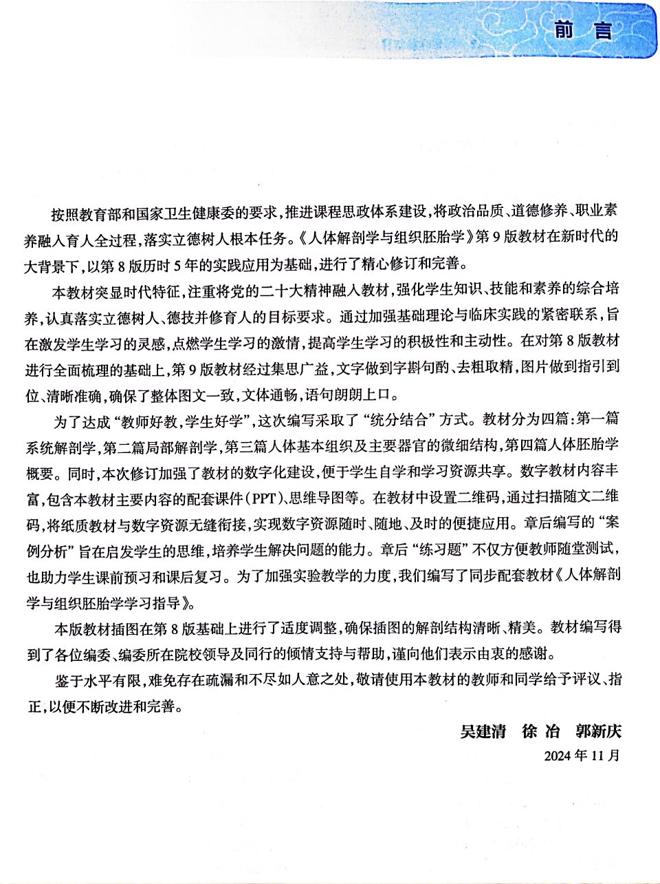 人体解剖学与组织胚胎学 第9九版 全国高等职业教育专科教材十四五规划教材 吴建清 徐冶 郭新庆 供临床医学专业用 人民卫生出版社