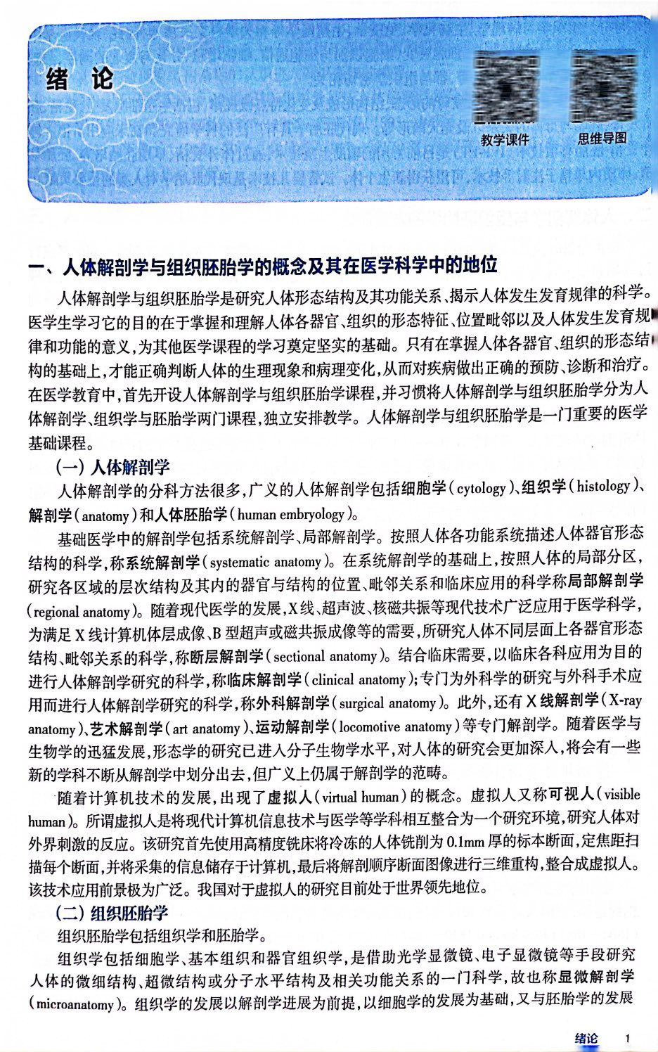 本教材分四篇来写,即:第一篇系统解剖学,第二篇组织学,第三篇胚胎学,第四篇局部解剖学。在保证教材精品的同时,我们加强了本教材的立体化建设,便于信息交流,网上运作,学生自学和资源共享。立体教材体现在:一是加强实验教学的力度,编写同步配套教材《人体解剖学与组织胚胎学实验及学习指导》;二是丰富融合教材数字资源,结合本教材内容,均制作配套课件(PPT)。在主教材中设置二维码,通过扫描章首随文二维码,把纸质教材与数字资源沟通起来,实现数字资源随时、随地、及时的便捷化应用。章后编写“病例讨论”目的是启发学生的思维,培养其解决问题的能力。“扫一扫、测一测”既便于教师随堂测试,又能辅助学生课前预习、课后复习。
