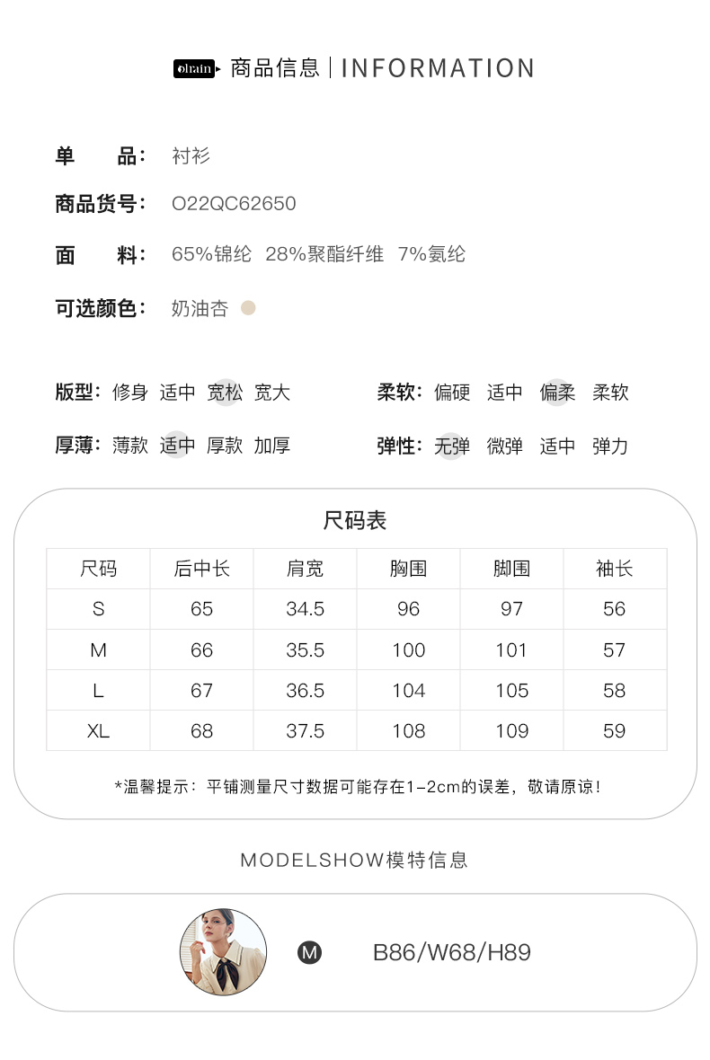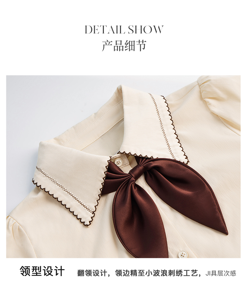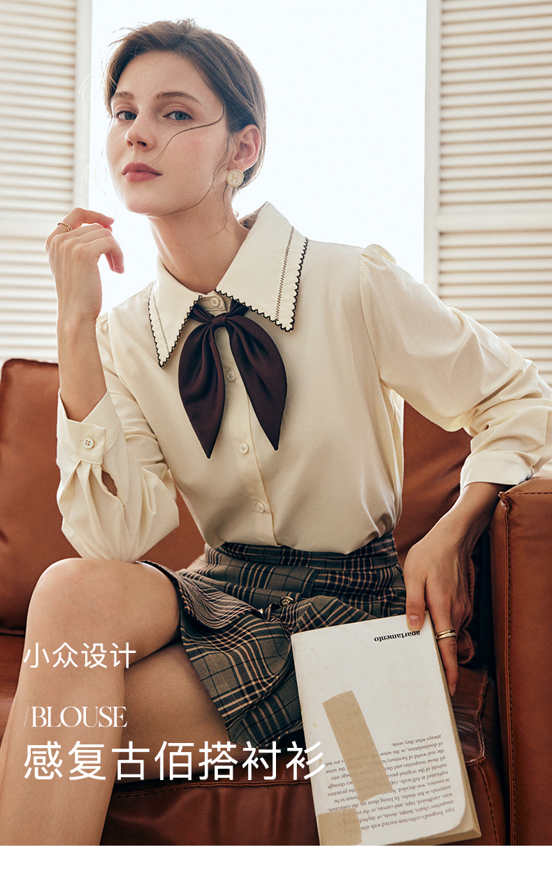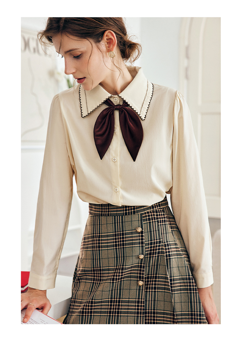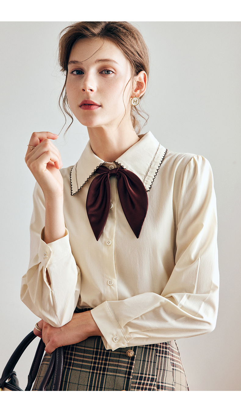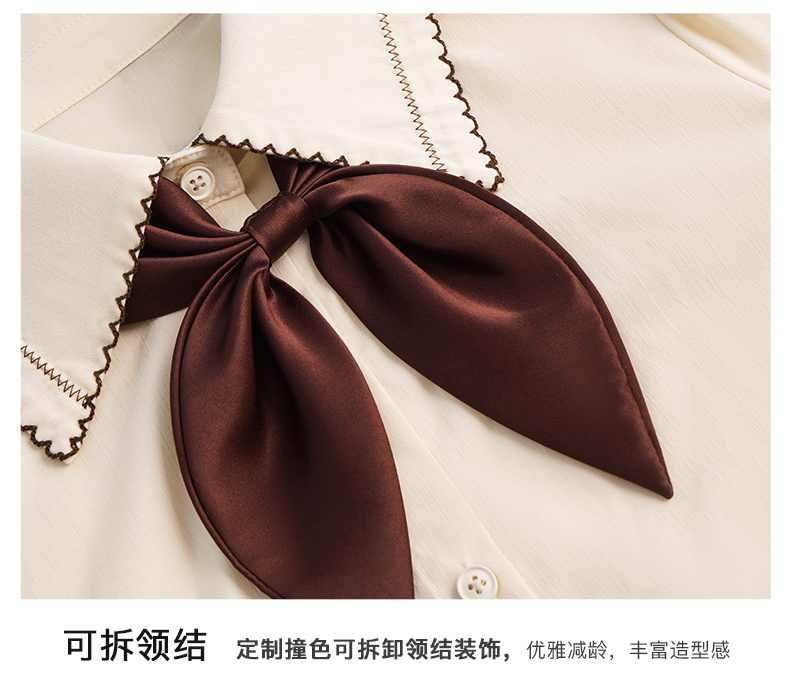 OLrain法式奶油杏色长袖衬衫女早秋2022年新款复古蝴蝶结翻领上衣