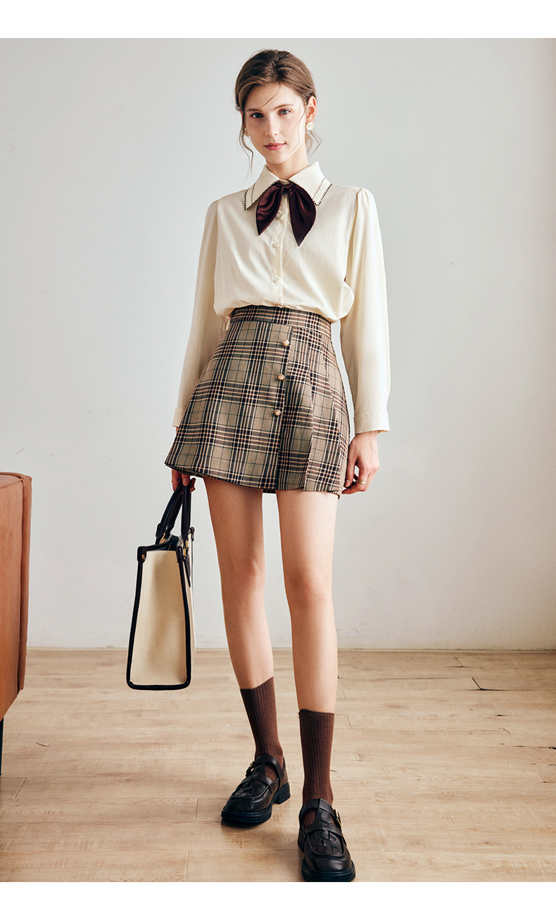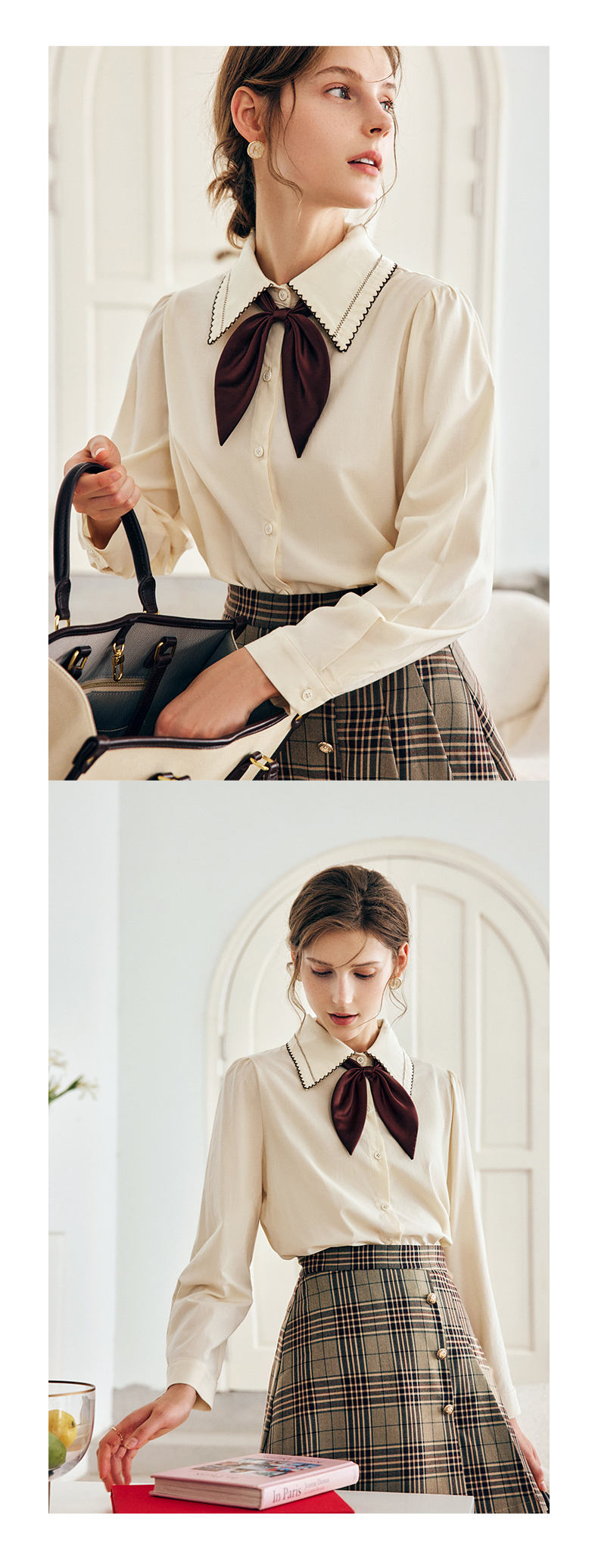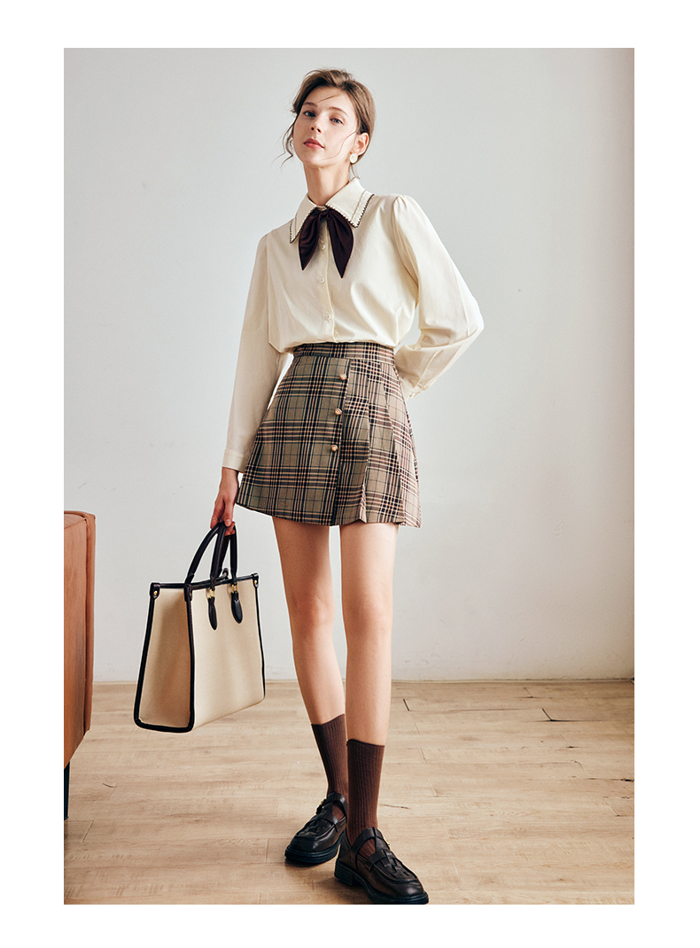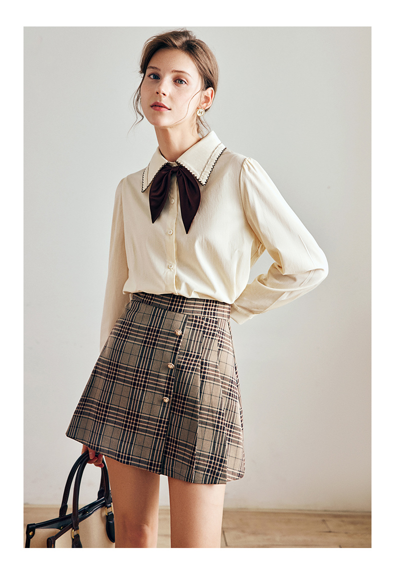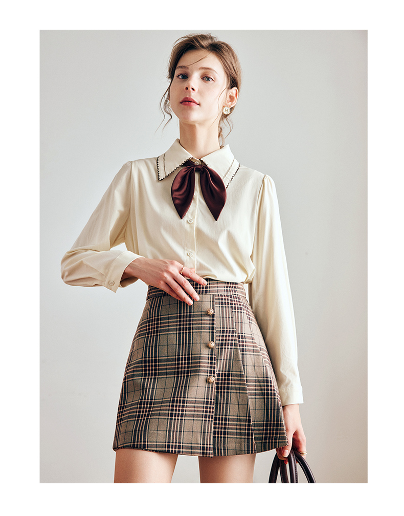 OLrain法式奶油杏色长袖衬衫女早秋2022年新款复古蝴蝶结翻领上衣