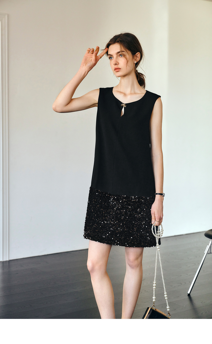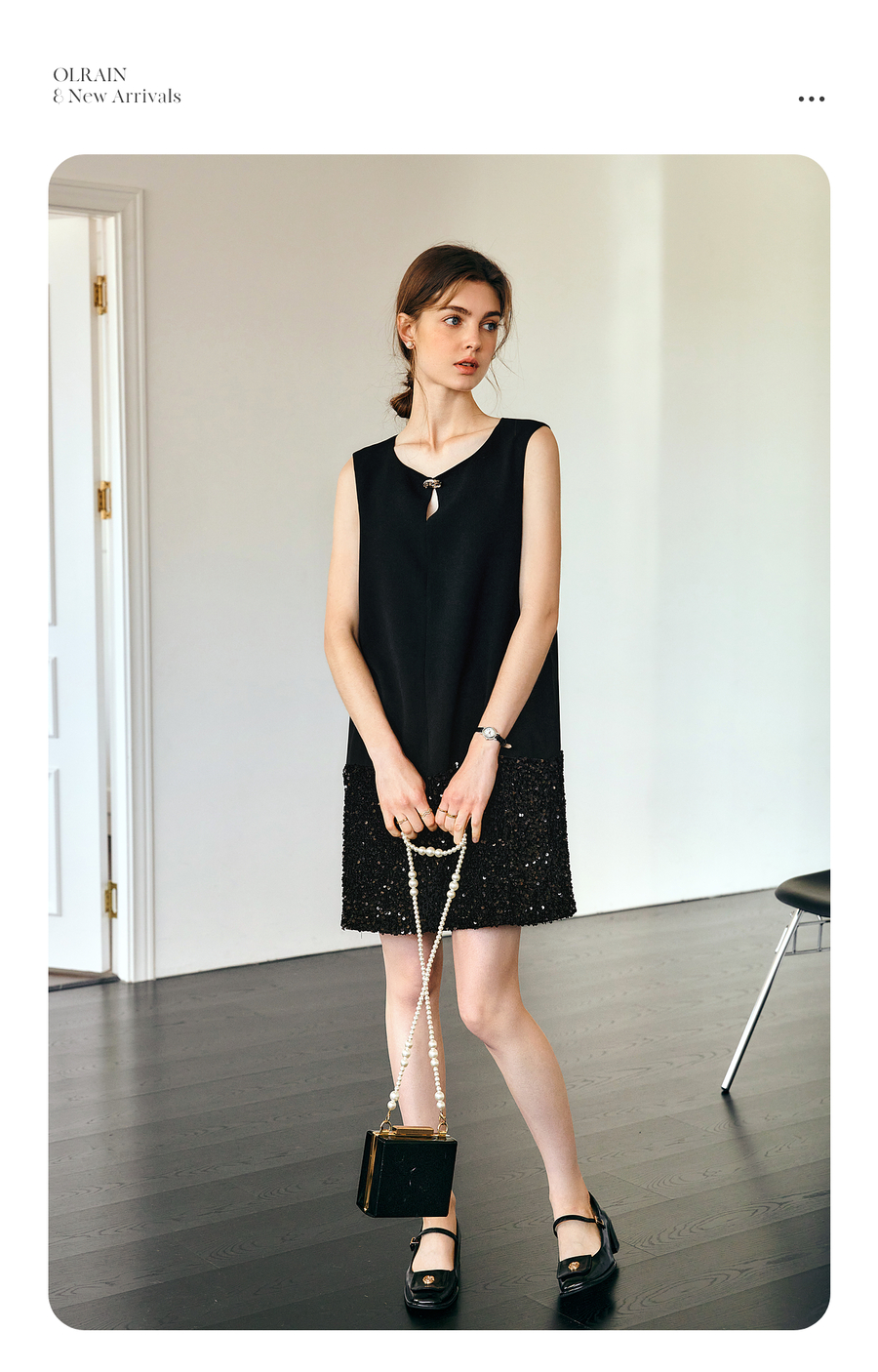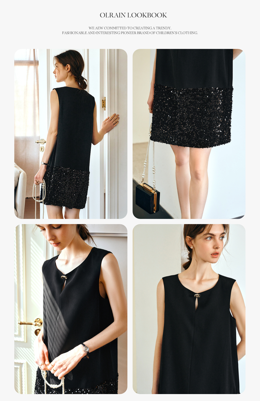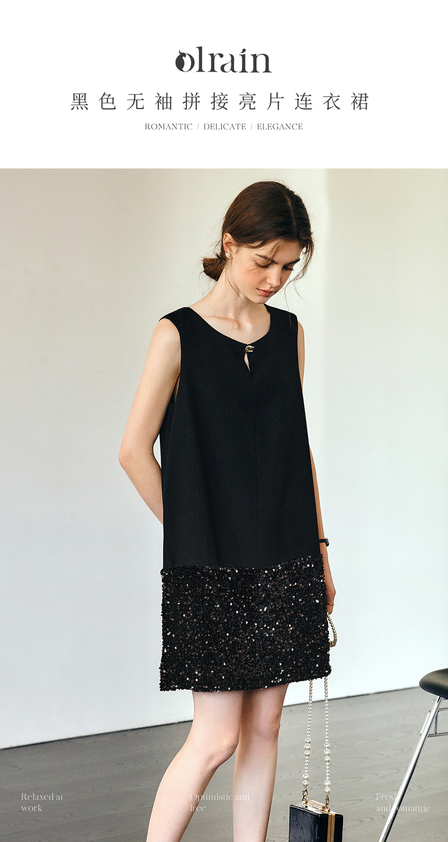 OLrain欧芮儿法式黑色连衣裙女春季2025年新款无袖拼接亮片短裙